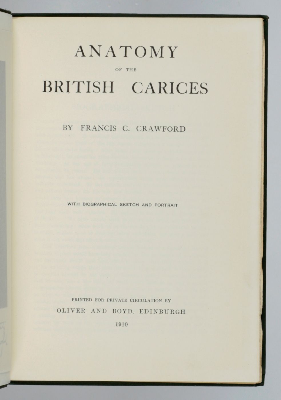 The author was a successful businessman, and ardent student of the genus Carex. He died the week after he brought the manuscript to the printer's, as noted in the short biography by A. J. Pressland on the first pages. This is followed by an introduction (more or less a second short biography) by Isaac Balfour of the Edinburgh Royal Botanic Garden, who did the final editing. As stated on the title page the work was "printed for private circulation" and most certainly it is quite rare. There are less then 20 liberary copies. Front boards lightly bumped at the top edge, otherwise a fine, clean copy. Definitely very rare in this state. BM(NH) Cat. Suppl. I, p. 239.