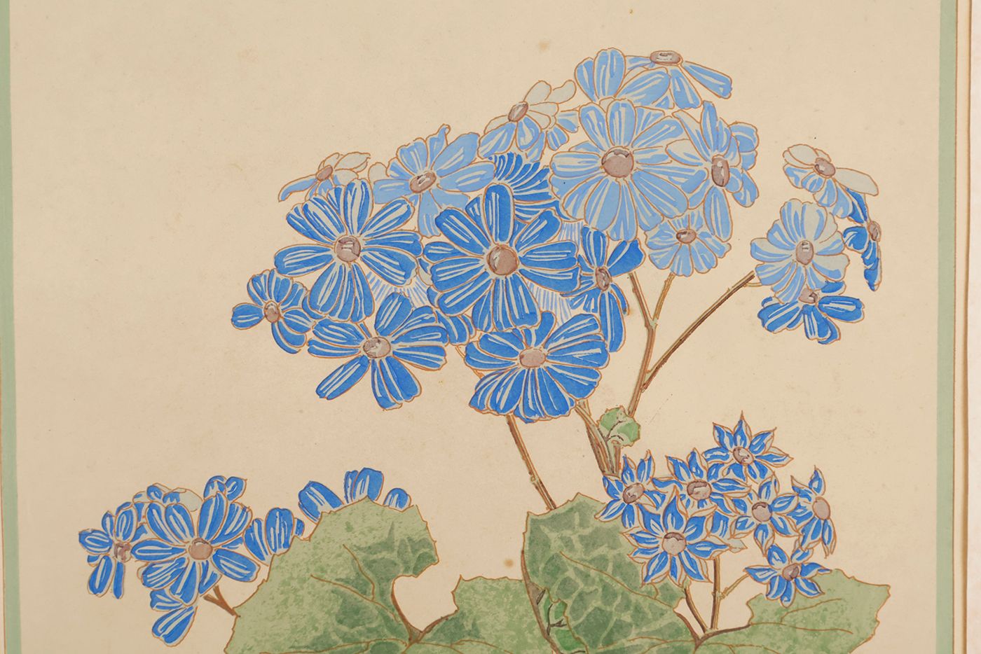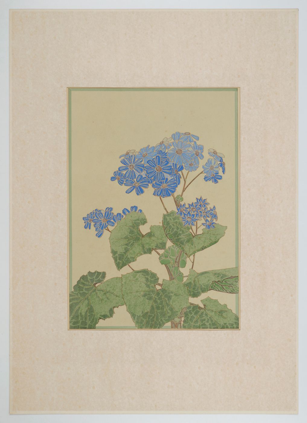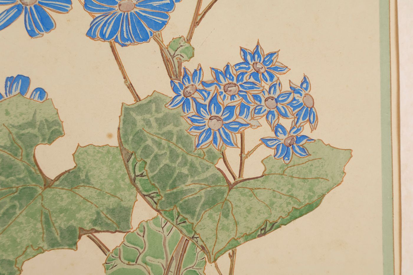 A fine Art Nouveau or "Jugendstil" plate, showing cinéraires, or Cineraria, colourful plants related to sunflowers, drawn and engraved by the French Art Deco painter and entomologist Émile Allain Séguy (1877-1951) (not to be confused with the French dipterologist Eugène Séguy). The complete work consists of two types of plates: illustrations of plants and flowers, and illustrations of their application in decorative art. This work is very rare and even single plates are rarely seen. Some light, even age-toning, otherwise very good. Schneider-Henn, Ornament und Dekoration, 273 and p. 48.