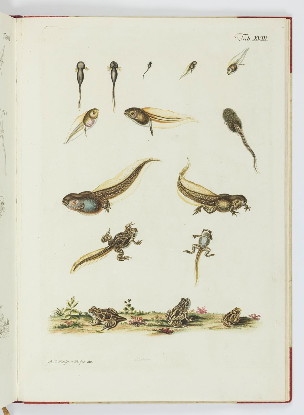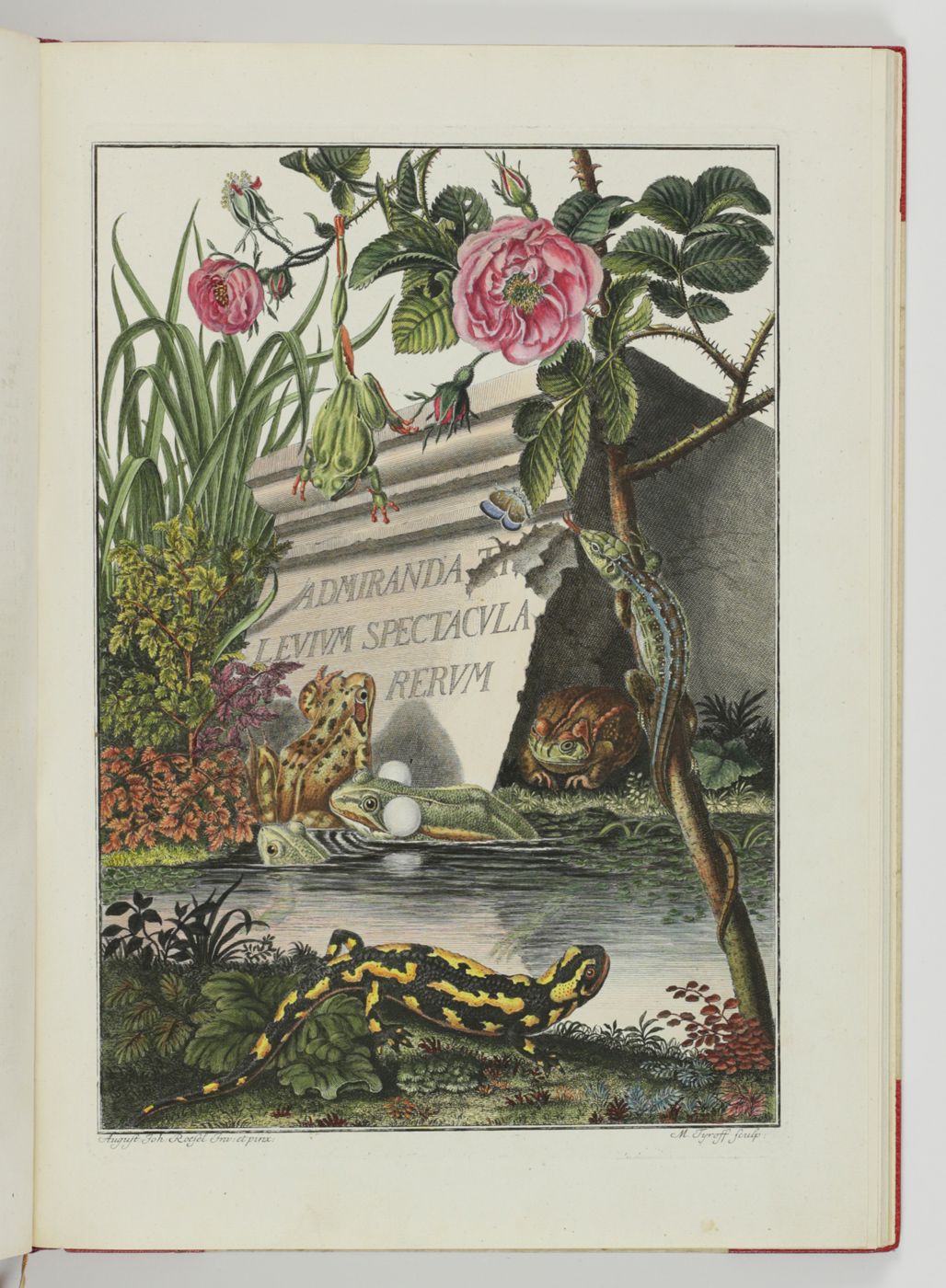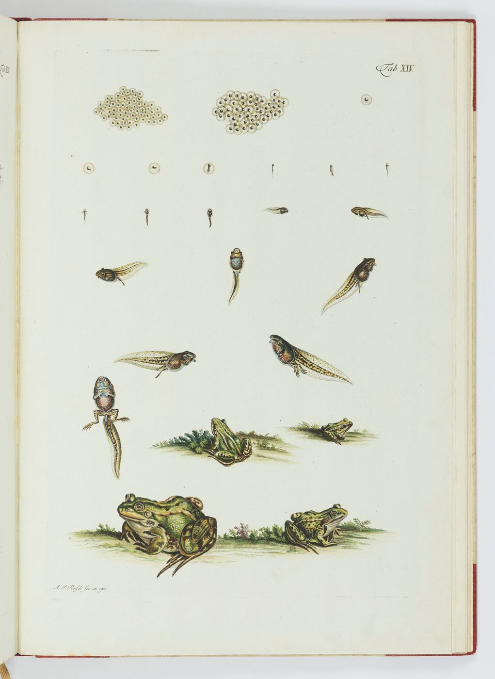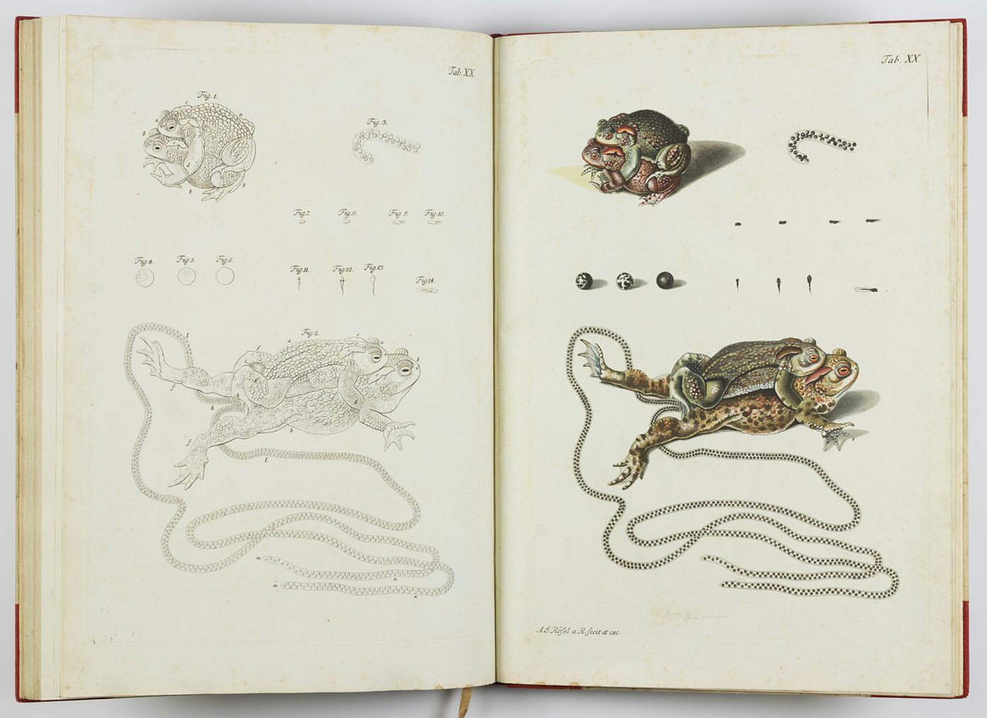 This is the most beautifully illustrated book on frogs ever published, in the very rare second revised edition, which is renowned for its superior colouring. The first edition, Historia naturalis Ranarum nostratium, was entirely written by the German-born, Austrian miniature-painter, entomologist and herpetologist August Johann Rösel von Rosenhof (1705-1759). "He could be considered the father of herpetological natural history" (Crane Library, p. 5). "The quality of the work, in particular of its illustrations, make it one of the most beautiful devoted to these animals. [Rösel] presented the life cycle of all the species of Germany, and their anatomy and their osteology" (Wikipedia). The detailed plates were drawn by Rösel himself. The fine engravings of the headpieces and frontispiece are by the German illustrator and engraver Martin Tyroff (1705-1758), and others. Being published in 1753-1758, it was a pre-Linnaean work. This new edition was finally edited by the German naturalist, ornithologist, malacologist and herpetologist Johann Wolf (1765-1824). Wolf wrote a new preface, added five footnotes to Rösel's Vorrede, and provided new references, including Linnaean authors. "In 1815...a new edition of A. J. Roesel von Rosenhof's classic book on German frogs and toads was completed. Roesel had lived in Nuremberg most of his life. Long after his death in 1759, his daughter, destitute, sold her rights to the book ... to Stein, a Nuremberg publisher. Stein engaged J. C. D. von Schreber, a naturalist in the nearby university town of Erlangen, to produce a revised, all-German text. He completed 3 parts (1801-1803), but Wolf prepared the remaining 5 parts" (Adler: 54). The interrupted editing and change of editor must have contributed to the rarity of complete copies, and especially to the rarity of the last part. Complete copies are exceedingly rare; most copies lack the final plates. This copy, however, lacks only plate 17, and does have all the plates numbered 20 and over. Also present are the title page, which is nearly always lacking, and the half-title. Some light, marginal spotting. Title page once strengthened with another sheet, some smudges and spotting, especially in the margins. Old paper repair to plate XXIV verso, leaving some creasing to image. Overall a good copy with outstanding colouring. Adler III, pp. 54-55 (biography of Johann Wolf); Crane Library, AC7 (1758 ed.); Nissen ZBI, 3464.