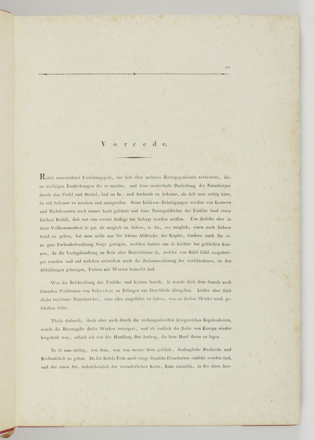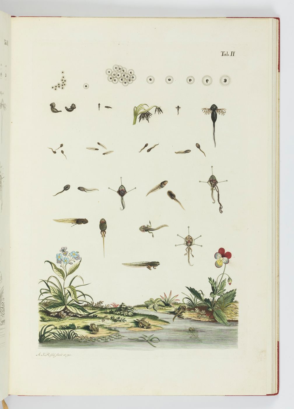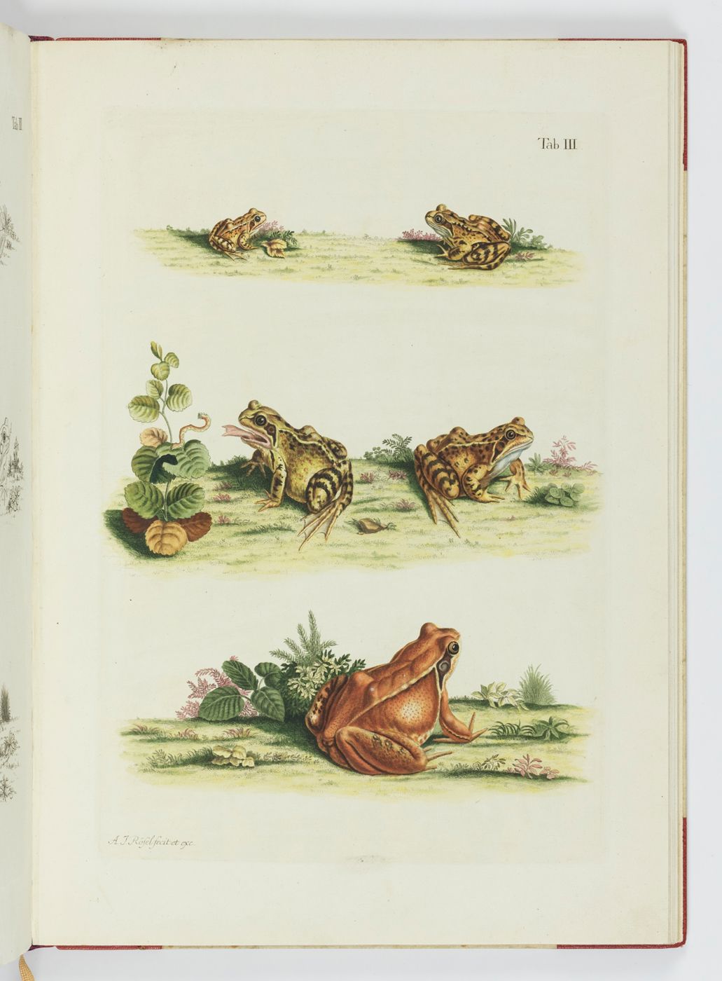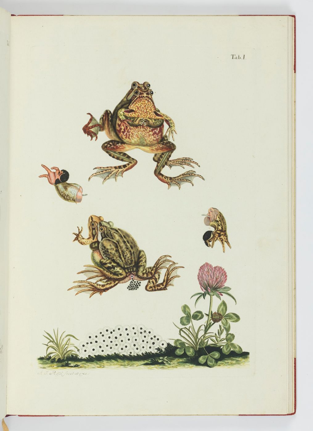This is the most beautifully illustrated book on frogs ever published, in the very rare second revised edition, which is renowned for its superior colouring. The first edition, Historia naturalis Ranarum nostratium, was entirely written by the German-born, Austrian miniature-painter, entomologist and herpetologist August Johann Rösel von Rosenhof (1705-1759). "He could be considered the father of herpetological natural history" (Crane Library, p. 5). "The quality of the work, in particular of its illustrations, make it one of the most beautiful devoted to these animals. [Rösel] presented the life cycle of all the species of Germany, and their anatomy and their osteology" (Wikipedia). The detailed plates were drawn by Rösel himself. The fine engravings of the headpieces and frontispiece are by the German illustrator and engraver Martin Tyroff (1705-1758), and others. Being published in 1753-1758, it was a pre-Linnaean work. This new edition was finally edited by the German naturalist, ornithologist, malacologist and herpetologist Johann Wolf (1765-1824). Wolf wrote a new preface, added five footnotes to Rösel's Vorrede, and provided new references, including Linnaean authors. "In 1815...a new edition of A. J. Roesel von Rosenhof's classic book on German frogs and toads was completed. Roesel had lived in Nuremberg most of his life. Long after his death in 1759, his daughter, destitute, sold her rights to the book ... to Stein, a Nuremberg publisher. Stein engaged J. C. D. von Schreber, a naturalist in the nearby university town of Erlangen, to produce a revised, all-German text. He completed 3 parts (1801-1803), but Wolf prepared the remaining 5 parts" (Adler: 54). The interrupted editing and change of editor must have contributed to the rarity of complete copies, and especially to the rarity of the last part. Complete copies are exceedingly rare; most copies lack the final plates. This copy, however, lacks only plate 17, and does have all the plates numbered 20 and over. Also present are the title page, which is nearly always lacking, and the half-title. Some light, marginal spotting. Title page once strengthened with another sheet, some smudges and spotting, especially in the margins. Old paper repair to plate XXIV verso, leaving some creasing to image. Overall a good copy with outstanding colouring. Adler III, pp. 54-55 (biography of Johann Wolf); Crane Library, AC7 (1758 ed.); Nissen ZBI, 3464.