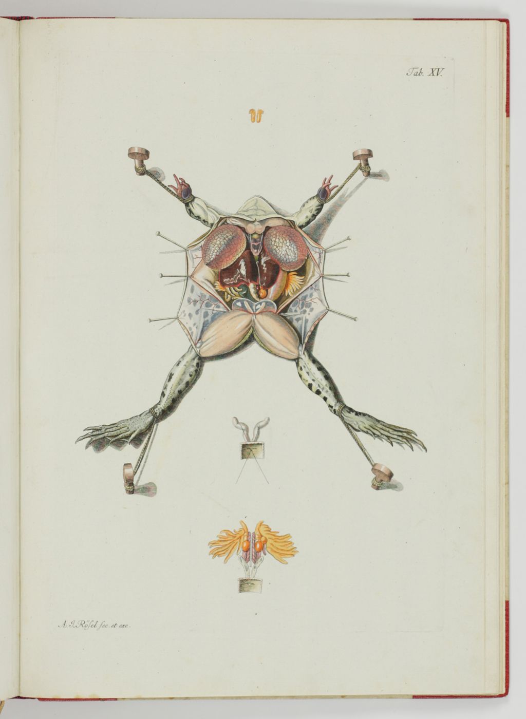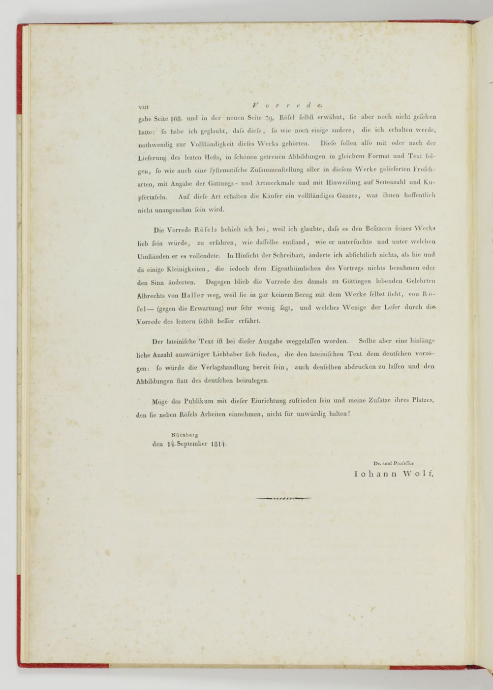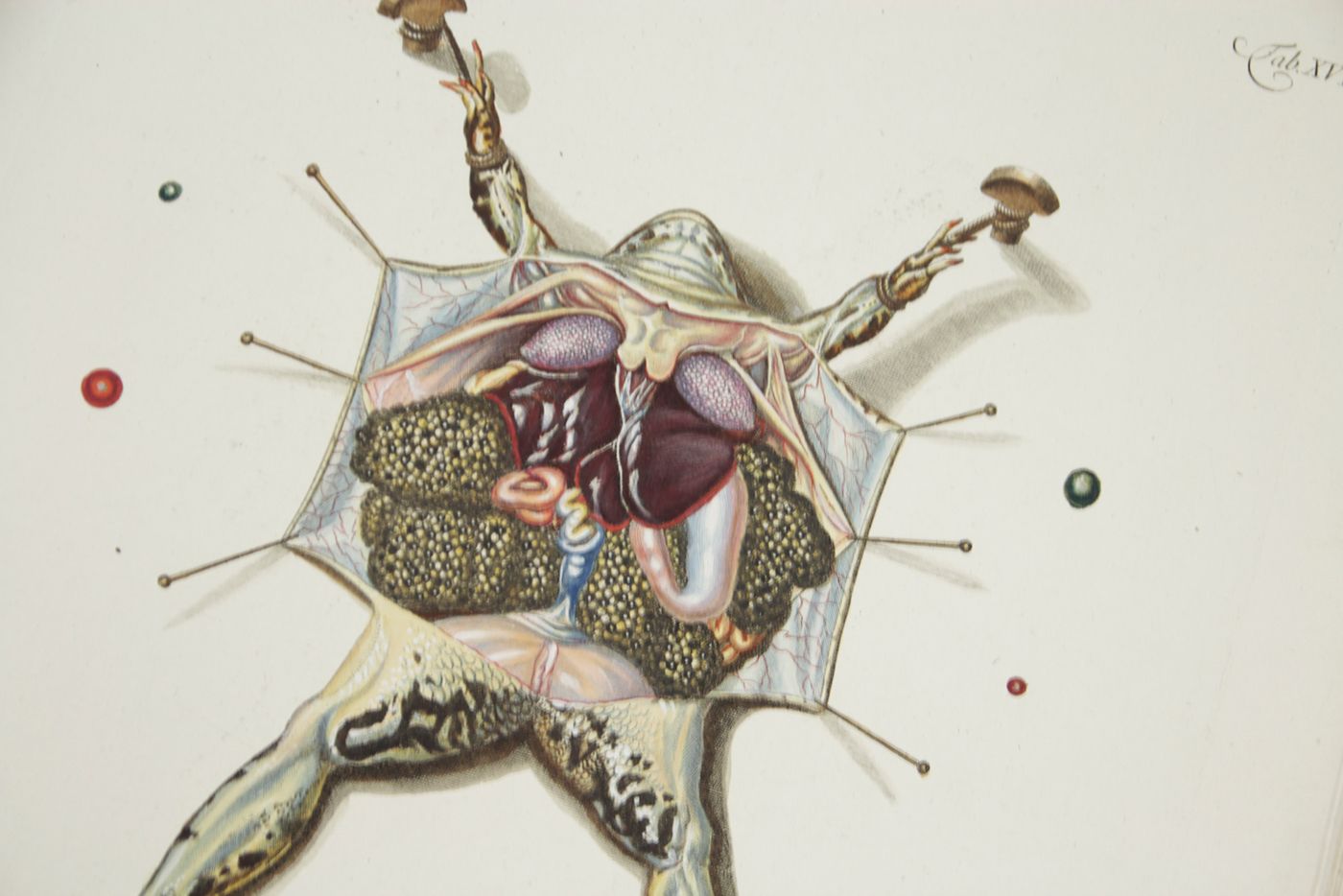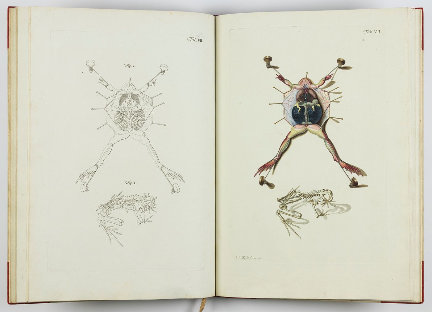 This is the most beautifully illustrated book on frogs ever published, in the very rare second revised edition, which is renowned for its superior colouring. The first edition, Historia naturalis Ranarum nostratium, was entirely written by the German-born, Austrian miniature-painter, entomologist and herpetologist August Johann Rösel von Rosenhof (1705-1759). "He could be considered the father of herpetological natural history" (Crane Library, p. 5). "The quality of the work, in particular of its illustrations, make it one of the most beautiful devoted to these animals. [Rösel] presented the life cycle of all the species of Germany, and their anatomy and their osteology" (Wikipedia). The detailed plates were drawn by Rösel himself. The fine engravings of the headpieces and frontispiece are by the German illustrator and engraver Martin Tyroff (1705-1758), and others. Being published in 1753-1758, it was a pre-Linnaean work. This new edition was finally edited by the German naturalist, ornithologist, malacologist and herpetologist Johann Wolf (1765-1824). Wolf wrote a new preface, added five footnotes to Rösel's Vorrede, and provided new references, including Linnaean authors. "In 1815...a new edition of A. J. Roesel von Rosenhof's classic book on German frogs and toads was completed. Roesel had lived in Nuremberg most of his life. Long after his death in 1759, his daughter, destitute, sold her rights to the book ... to Stein, a Nuremberg publisher. Stein engaged J. C. D. von Schreber, a naturalist in the nearby university town of Erlangen, to produce a revised, all-German text. He completed 3 parts (1801-1803), but Wolf prepared the remaining 5 parts" (Adler: 54). The interrupted editing and change of editor must have contributed to the rarity of complete copies, and especially to the rarity of the last part. Complete copies are exceedingly rare; most copies lack the final plates. This copy, however, lacks only plate 17, and does have all the plates numbered 20 and over. Also present are the title page, which is nearly always lacking, and the half-title. Some light, marginal spotting. Title page once strengthened with another sheet, some smudges and spotting, especially in the margins. Old paper repair to plate XXIV verso, leaving some creasing to image. Overall a good copy with outstanding colouring. Adler III, pp. 54-55 (biography of Johann Wolf); Crane Library, AC7 (1758 ed.); Nissen ZBI, 3464.