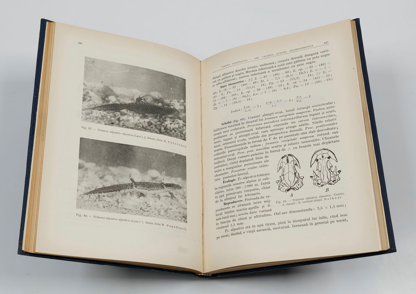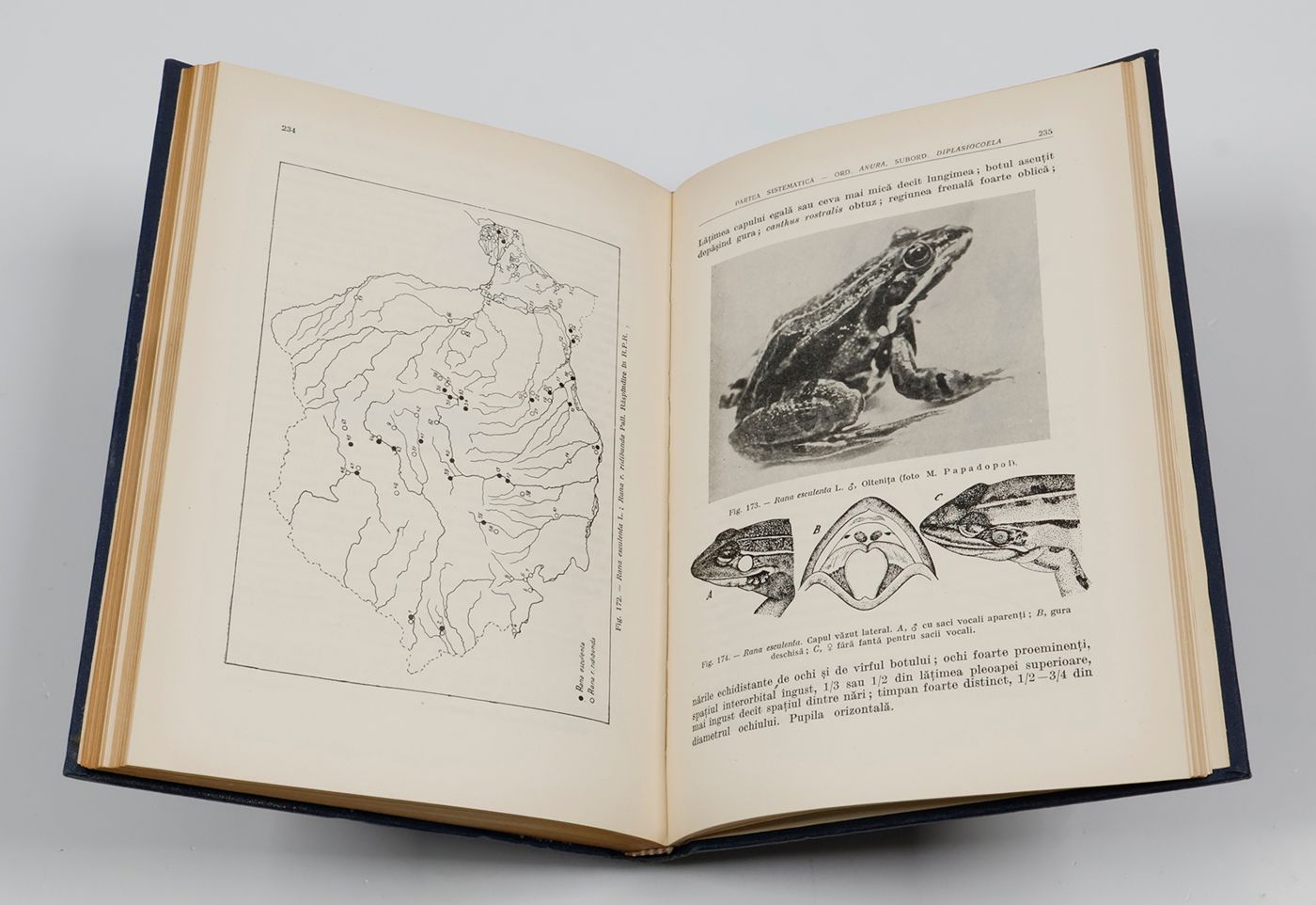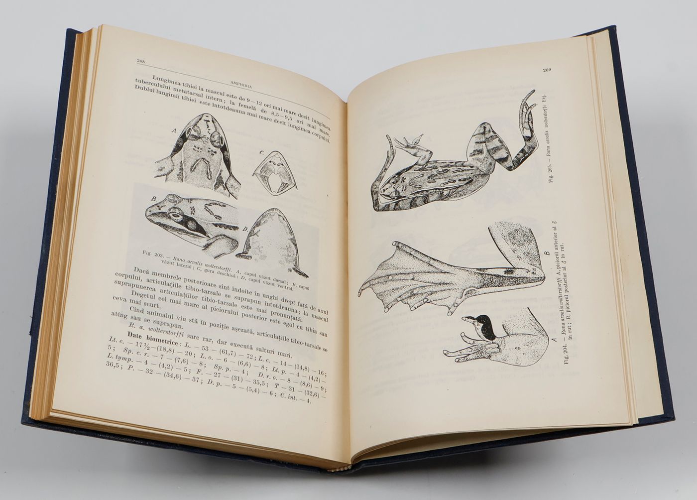 Perhaps the last monograph on the surprisingly diverse Rumanian amphibian fauna. The drawings and photos are excellent. Contains detailed descriptions, with distribution maps, etc. Of many species, several specimens are illustrated, to show variability. Author is the Romanian herpetologist Ion Eduard Fuhn (1916-1987). Published in 800 copies, but apparently most went to Rumanian schools and institutions. Tiny stamp on title page; otherwise, a near mint copy. Rare.
