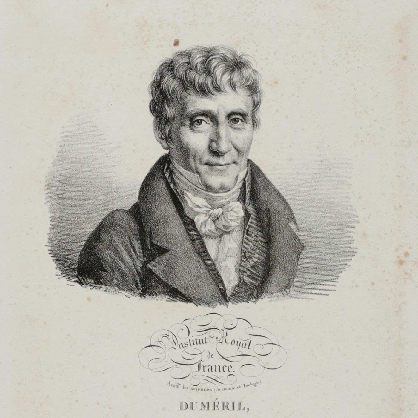 A rarely-seen portrait of the French zoologist (principally herpetologist and ichthyologist) André Marie Constant Duméril (1774-1860). The artist, Julien-Léopold Boilly (1796-1874) was noted for his album of lithographs, Iconographie de l'Institut royal de France ou collection des portraits des Membres composant les quatre académies depuis 1814 jusqu'en 1825 (1820-1825). His portraits are much less stiff and formal than many by his contemporaries. Signed by the artist in the lower left margin of the portrait and dated 1822. The caption states the date of his birth and the year (1816) when Duméril was elected as a member of the Institut. Uncut. With in the lower right corner a small, oval blindstamp, 'Galerie Vivienne Bénard'. Scattered, mostly light foxing, mainly in the margins; weak abrasion in the right margin; otherwise very good.