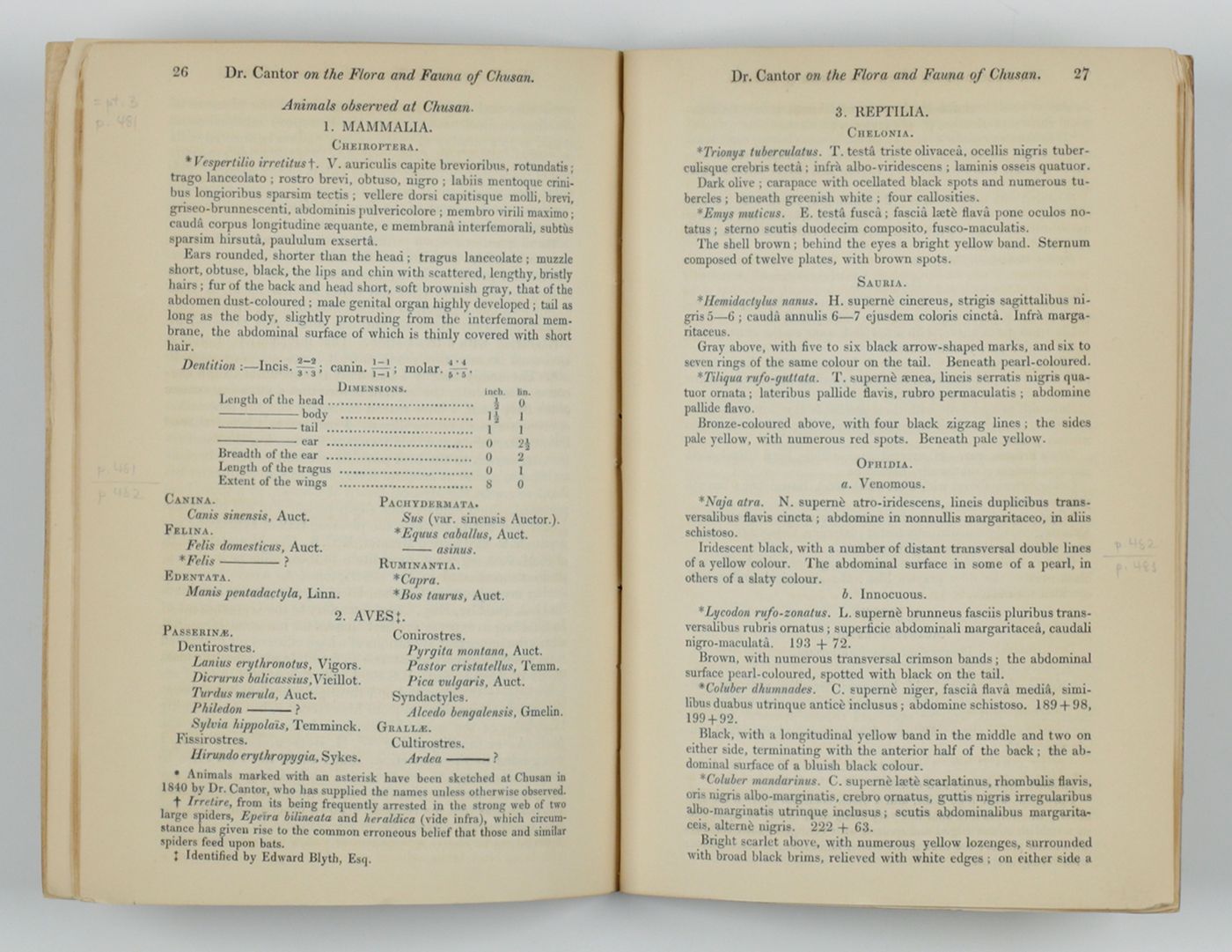 Offprint of a rare paper, largely written by the Danish physician (employed by the British East India Company), botanist and zoologist, Theodore Edvard Cantor (1809-1860), published in the Annals and Magazine of Natural History 1(9). Cantor provides some introductory remarks on the topography, weather and climate, history and inhabitants, a review of the plants, and notes on the mammals, birds, reptiles, and amphibians. He described a new bat, and several new reptiles, including snakes, and new frogs, and fish. Many new molluscs are included. These, however, were described by the British malacologist, and fellow British East India Company employee, William Henry Benson (1803-1870). All (new) mollusc species are terrestrial, or from fresh to brackish water. Finally, Cantor described several new species of spiders, and provided a list of insects and several minor invertebrate groups. Provenance: inscribed by Cantor in the top margin of the title page, viz., a dedication to the Boston Natural History Society. On the front wrapper a small stamp of the American herpetologist Kraig Adler. Fore edges a bit chipped, otherwise very good. Adler 2, pp. 65-66