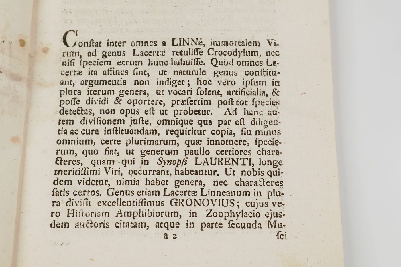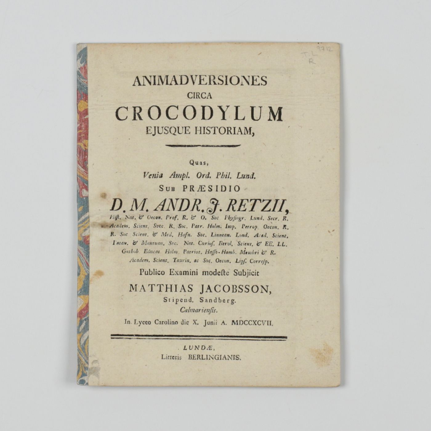 A rare thesis containing observations concerning the crocodile and its history. Written by the Swedish botanist, entomologist, herpetologist, and professor of natural history at Lund University, Anders Jahan Retzius (1742-1821) and defended by his pupil, Matthias Jacobsson, from Kalmar (1774-1836?). This copy, although without owner's inscription or stamp, from the library of the renowned Swedish herpetologist Richard Wahlgrén (1946-2019), who had a keen eye for herpetological rarities. Title a bit soiled in the margins, otherwise, a very good, clean copy.