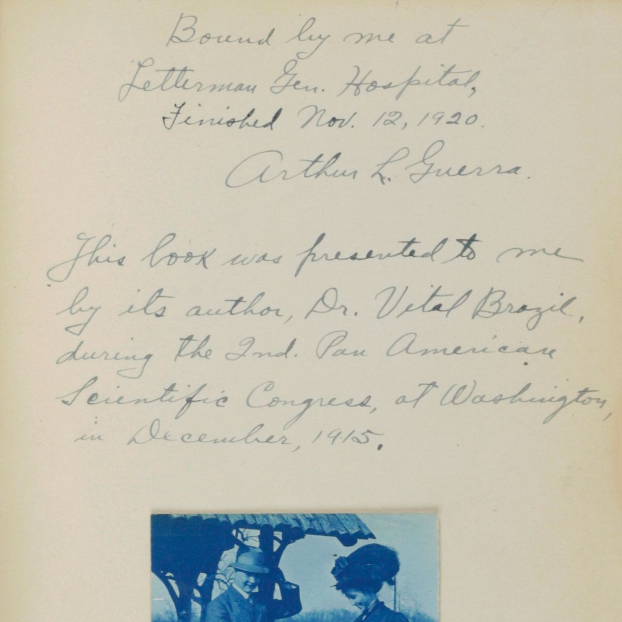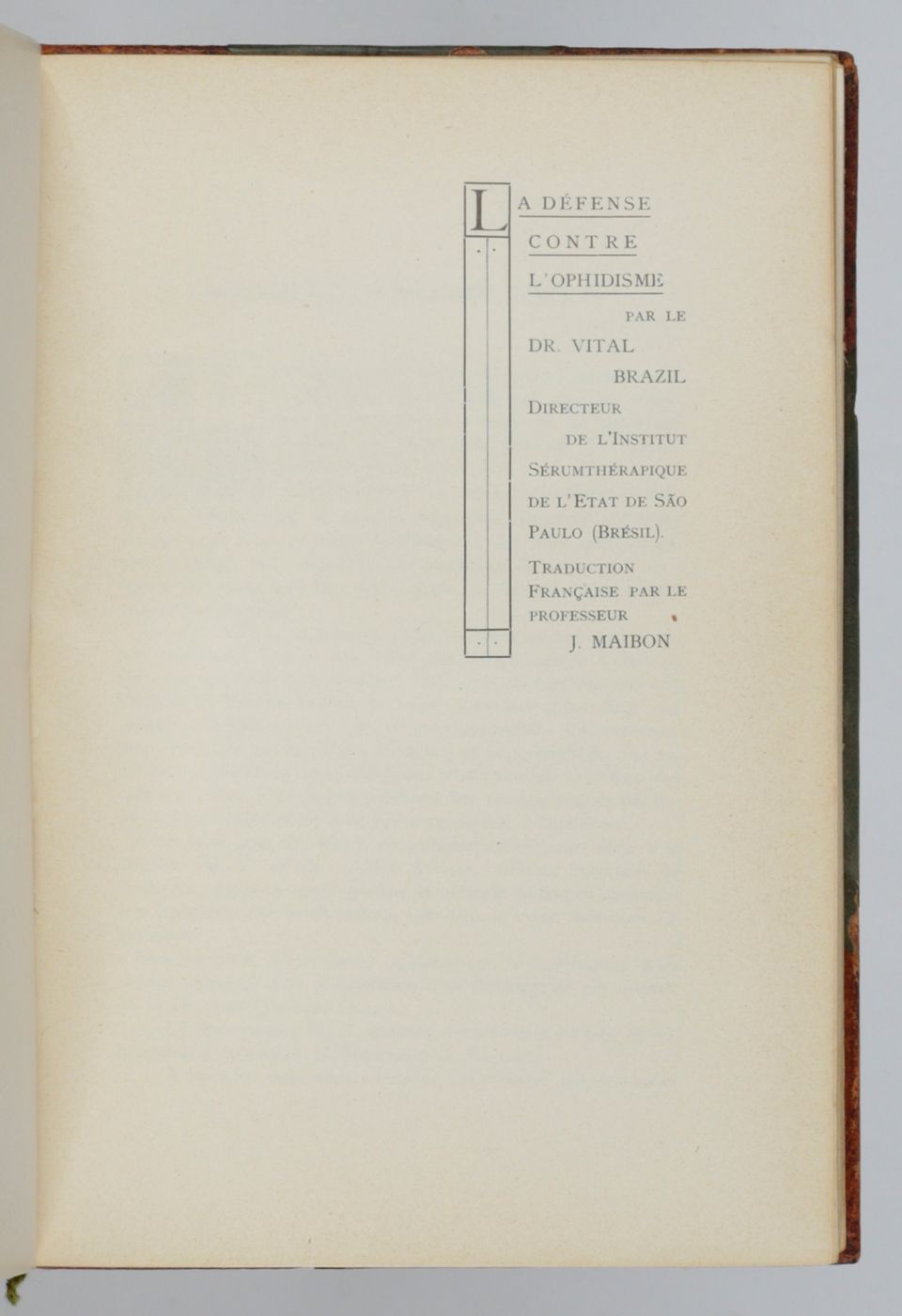 Written by the Brazilian physician Vital Brazil Mineiro da Campanha (1865-1950) famous for his discovery of a versatile anti-venom serum used against the bites of snakes of the genera Crotalus (rattlesnakes), Bothrops (pit vipers) and Elaps (coral snakes). Brazil was Director of the Serum Therapy Institute of the State of São Paulo, Brazil. Due to Brazil's efforts, snake bite mortality decreased from 25-30% to a mere 2% (Adler). This is the expanded, updated second edition, translated by J. Maibon. All editions are very uncommon, if not rare. Provenance: Inscribed on the first blank by Arthur L. Guerra, stating that this book was presented to him by the author, during the Second Pan American Scientific Congress at Washington [DC] in December 1915. Printed record, stating purchase in 2010 from Frank Mikesh Natural History Books mounted on front free endpaper recto. Boards and spine a bit worn at edges; binding a bit weak, one plate with an old repair, mostly visible on the blank verso; otherwise, however very good and complete. Adler 2, pp. 129-130. Neither in Cat. BM(NH), nor in Nissen, ZBI.