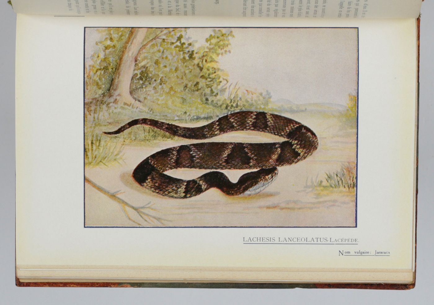 São Paulo, Poica-Weiss, 1914. Large 8vo (23.3 x 16.0 cm). Title in red and black, 319 pp.; two pages with text illustrations (mainly detailed snake heads); 28 plates of which 13 in full colour offset printing. Contemporary half morocco over marbled boards. Spine with five raised bands. Marbled endpapers.