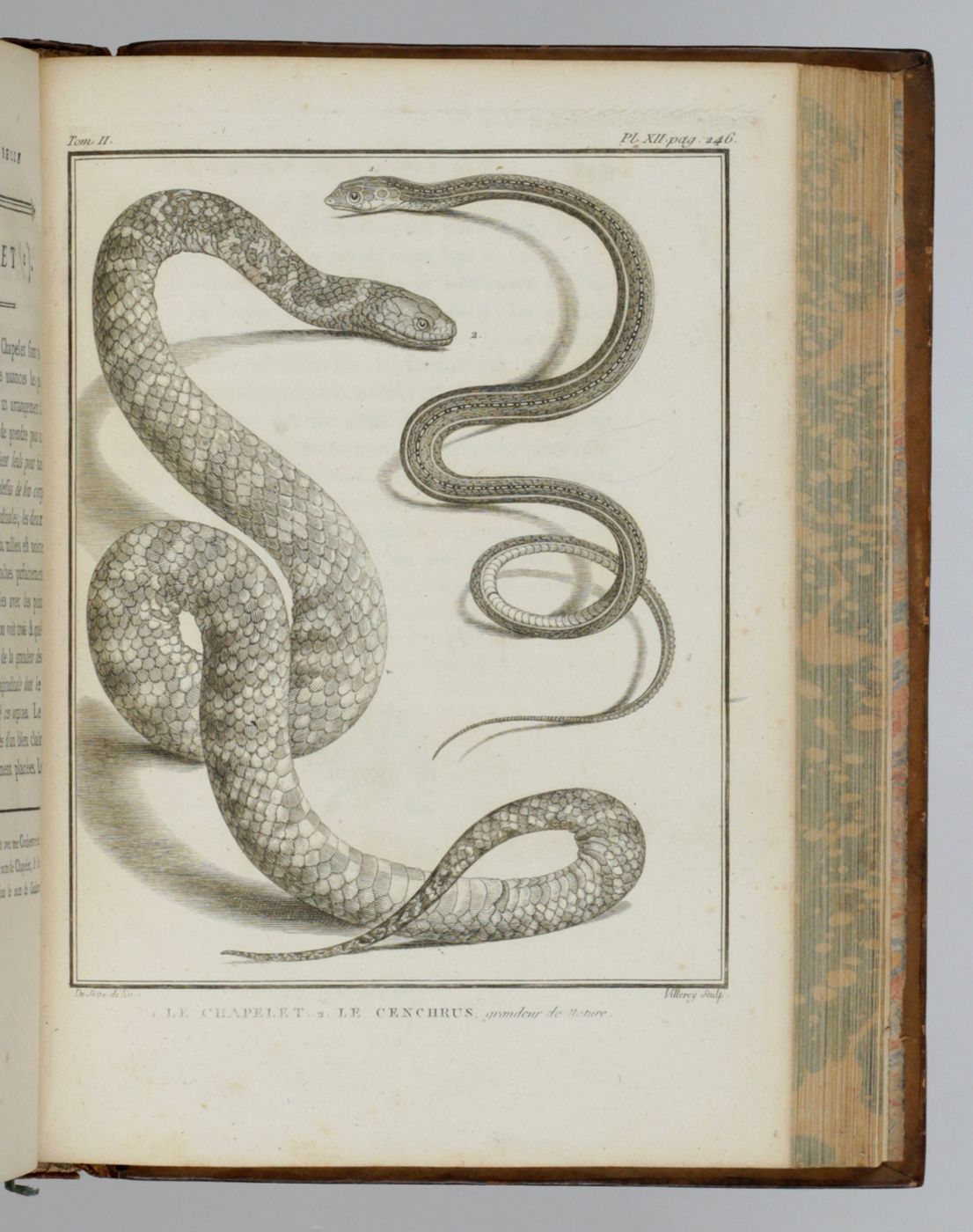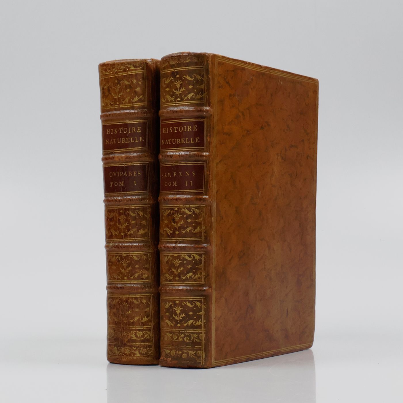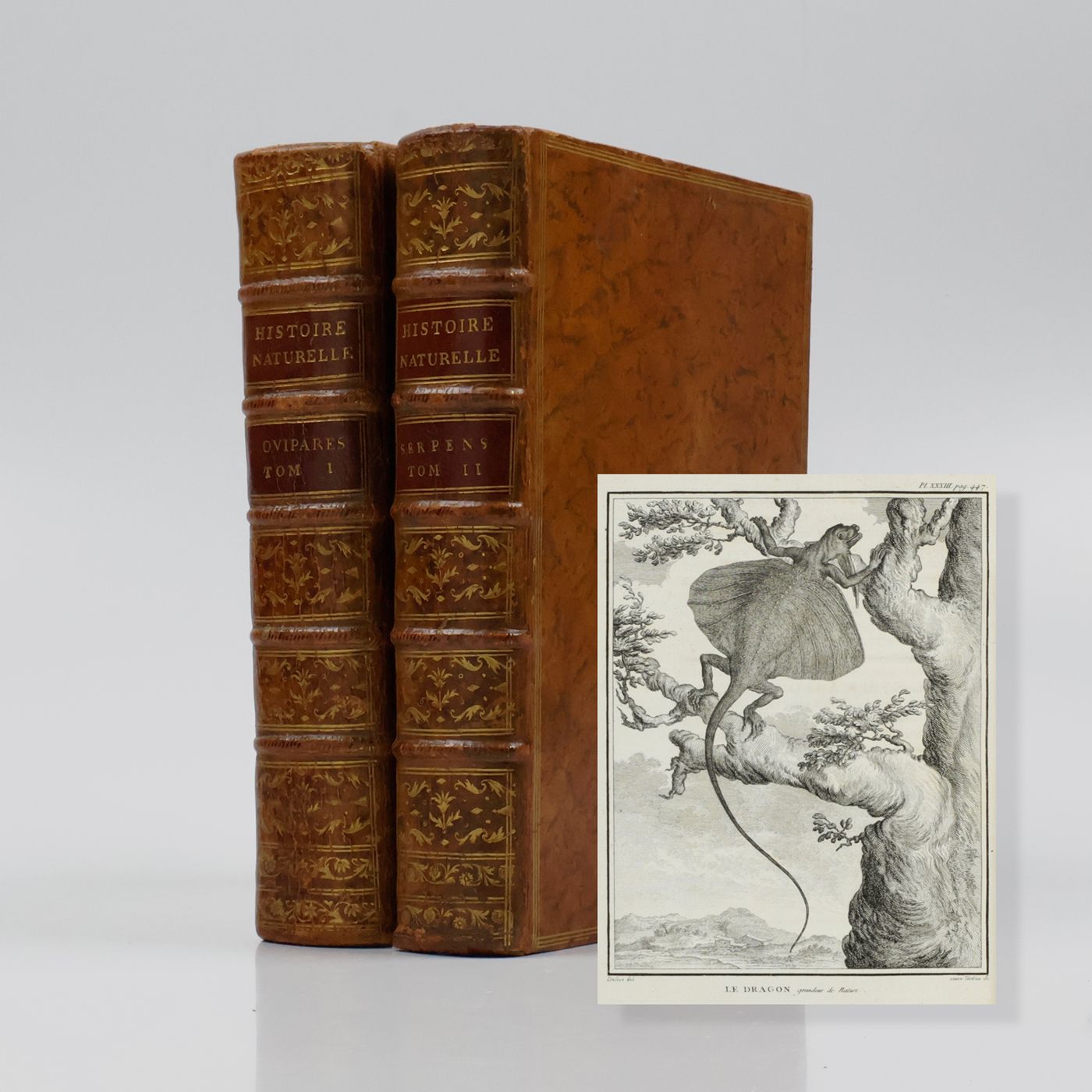 A beautiful copy of the complete, rare, herpetogical part of the first, 4to edition ("PMM edition") of a large and important series on natural history started by Georges-Louis Leclerc, Comte de Buffon (1707-1788), and continued (with these two volumes) by his successor, the naturalist Bernard Germain Étienne de la Ville-sur-Illon, Comte de Lacepède (1756-18250. Together they form a coherent segment of the whole work, which, according to Adler "was the first comprehensive world summary of amphibians and reptiles". The second volume deals exclusively with snakes, and the title is shortened to Histoire naturelle des serpents. Three plates (in the first volume) misnumbered (XV as XI; XXXV as XXXI, and XL as XV). Provenance: On the front pastedowns a bookplate, Bibliothèque du C.en [= Citoyen] Capon; small stamp of Gleizes Notre. JMP on titles. Some rubbing to the boards edges and spine ends; several plates toned, but generally clean. An attractive, uniformly bound set. Do not confuse with the duodecimo edition, published in four volumes, by the the same publisher, in the same years. Adler I, p. 14; Nissen ZBI, 672; PMM 198 (in part); Casey Wood, p. 267.