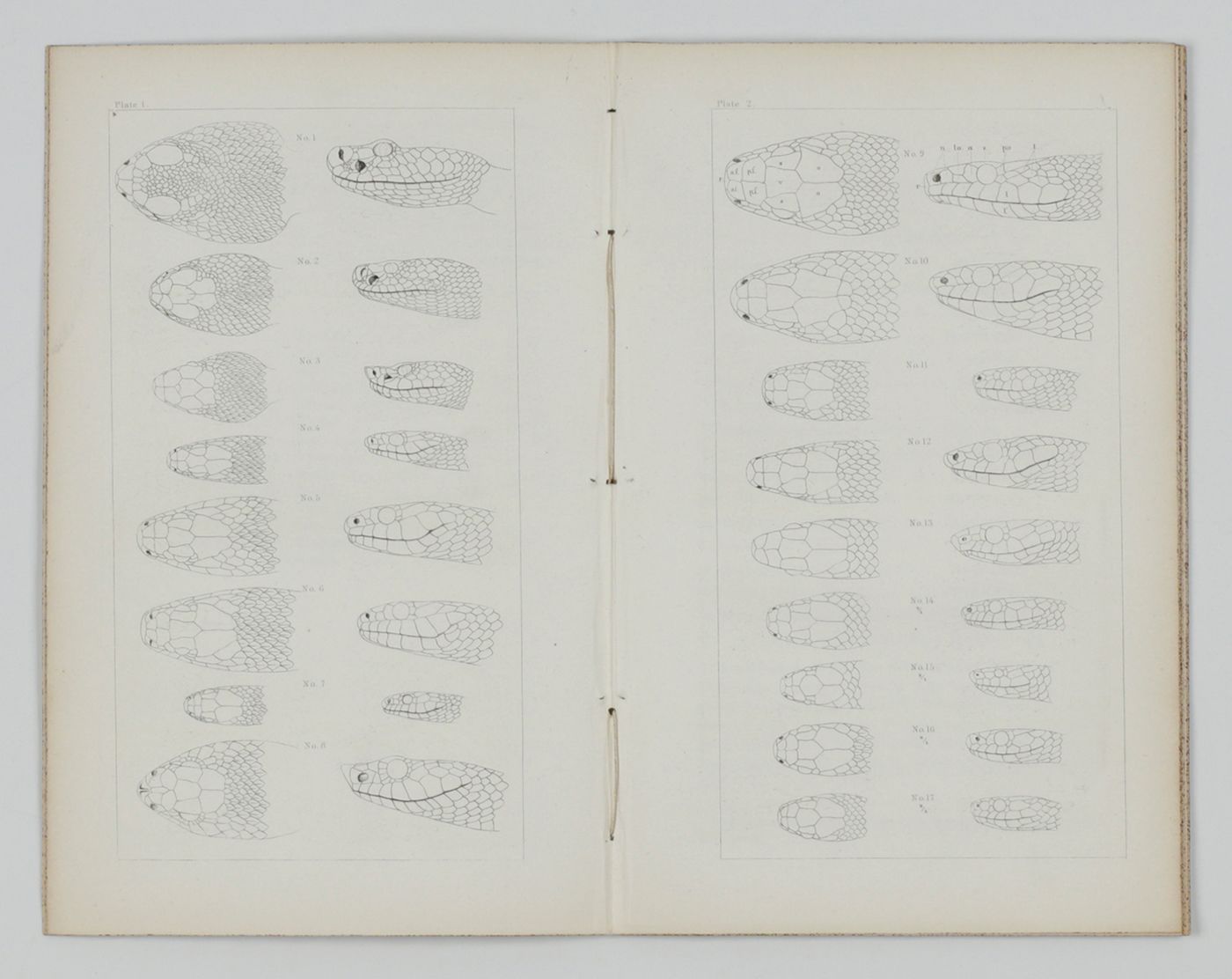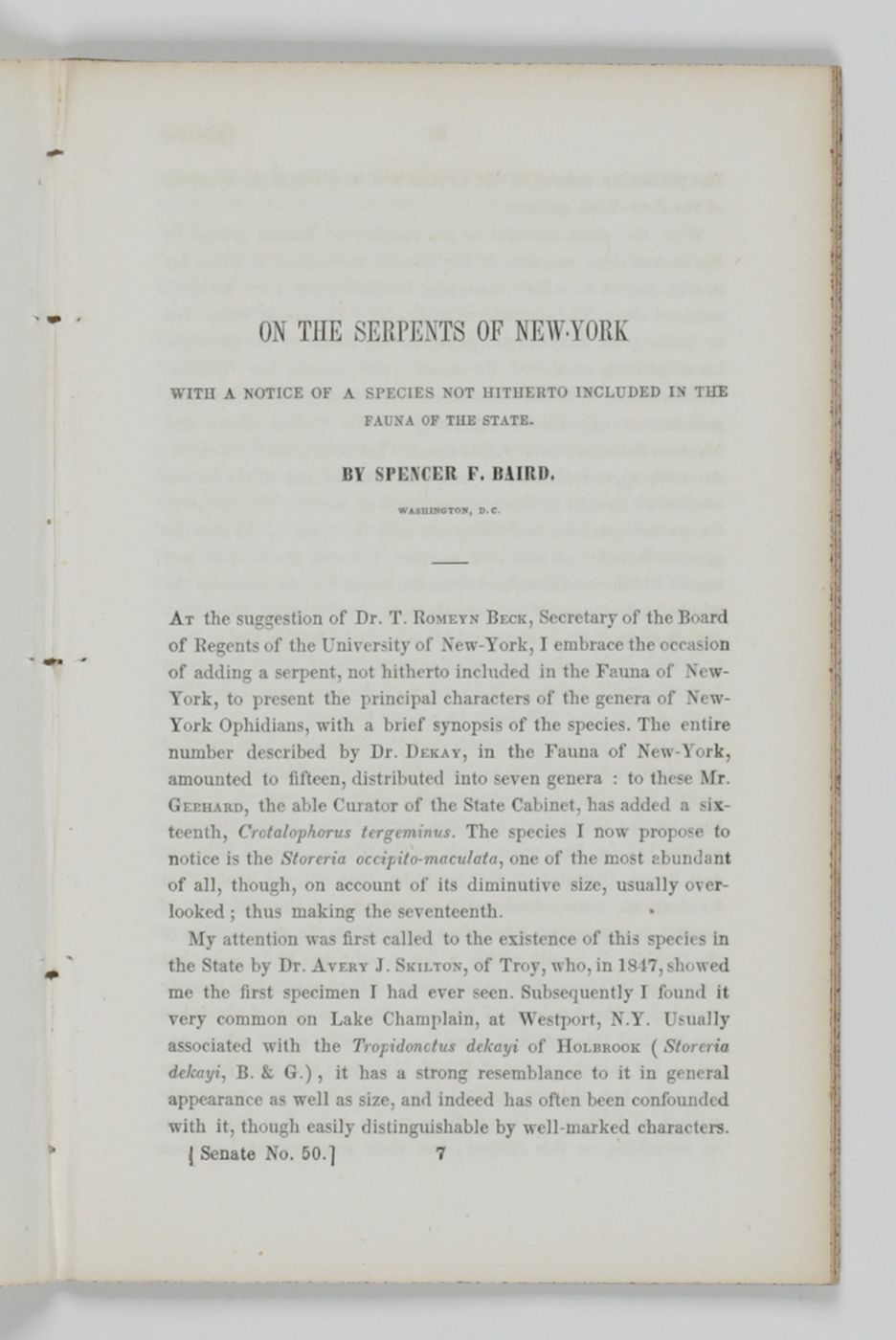 A rare early work on the herpetology, and in particular ophiology, of New York State, written by the American zoologist Spencer Fullerton Baird (1823-1887). Published as an appendix to the Annual Report of the Regents of the University, on the Condition of the State Cabinet of Natural History. A repaginated offprint, which may have been published somewhat later, is rare too. The peculiar numbering ("49½") in Goode's list of Baird's papers is because this work was initially overlooked and then added in an appendix. Stamp of the Elmira College Library in the top margin of one text page, otherwise fine. Adler I, pp. 40-42; Goode, B. G. (1883) The published writings of Spencer Fullerton Baird, 1843-1882, 49½ (p. 229). Although illustrated not in Nissen ZBI.