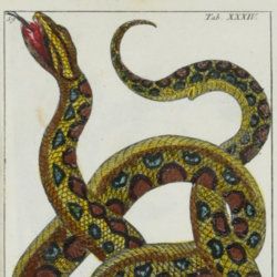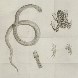 Natuurkundige Beschryving eener uitmuntende verzameling van zeldsaame gedierten, bestaande in Oost- en Westindische viervoetige dieren, vogelen en slangen, weleer leevend voorhanden geweest zijnde, buiten Den Haag op het Kleine Loo van Z. D. den Prins van Oranje-Nassau. Met naar 't leven getekende en gecouleurde afbeeldingen. [All herpetological plates].