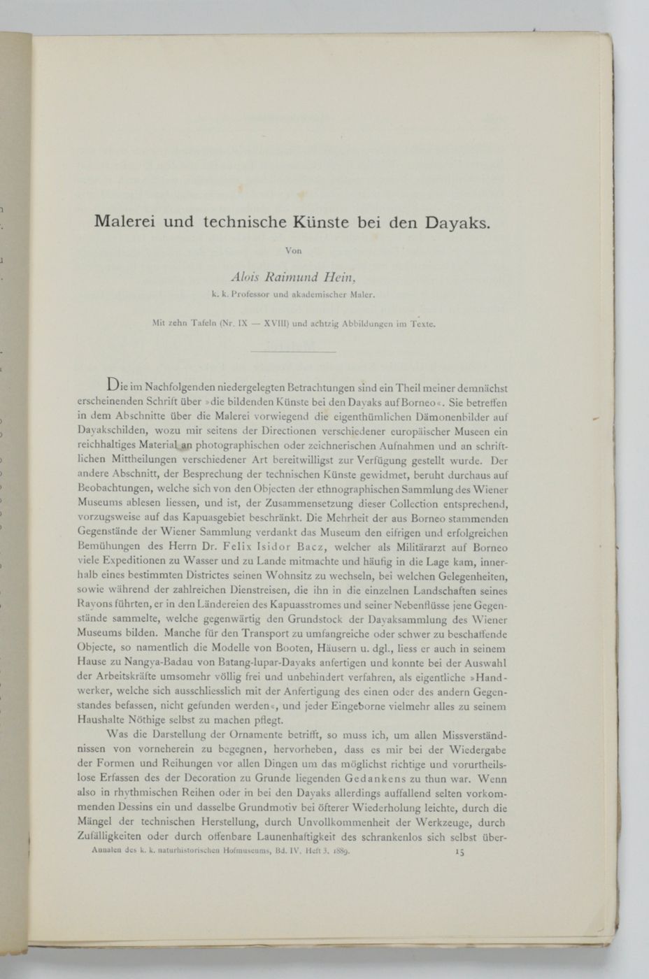 A finely illustrated work, written and illustrated by the German painter Alois Raimund Hein (1852-1937). He "studied Semitic studies, German studies and geography at the University of Vienna from 1881 to 1885. After receiving his doctorate (1885) he continued his studies in Strasbourg, but returned to Vienna in 1887 to work as a volunteer at the Court Museum of Natural History. In 1889 he became a research assistant and in 1894 an assistant. In 1901 he was appointed assistant curator at the Court Museum and qualified as a professor at the University of Vienna for general ethnology, which he had devoted himself to more and more for several years, as well as to Austrian ethnology. H. carried out ethnographic research among the Czechs, studied European museums and collected ethnographic material in the Austrian Alpine countries. In 1894 he founded the Association for Austrian Folklore with M. Haberlandt and in 1895 the Museum of Folklore in Vienna. His particular ethnological interest was in the area of ornamentation, including the ornamentation of the Slavs, the Dayaks of Borneo and the artistic design of Indonesian sword handles. Here, H. placed emphasis on extensive ethnographic comparisons. He considered ethnography to be an essential basis for philology" (Deutsche Biographie). Contained in the Annalen of the K. K. naturhistorische Hofmuseum. Rear wrapper repaired, otherwise a very good clean copy of the original edition from 1889. Rare.