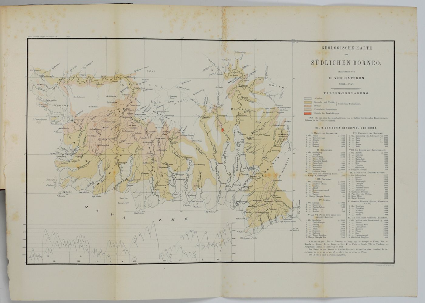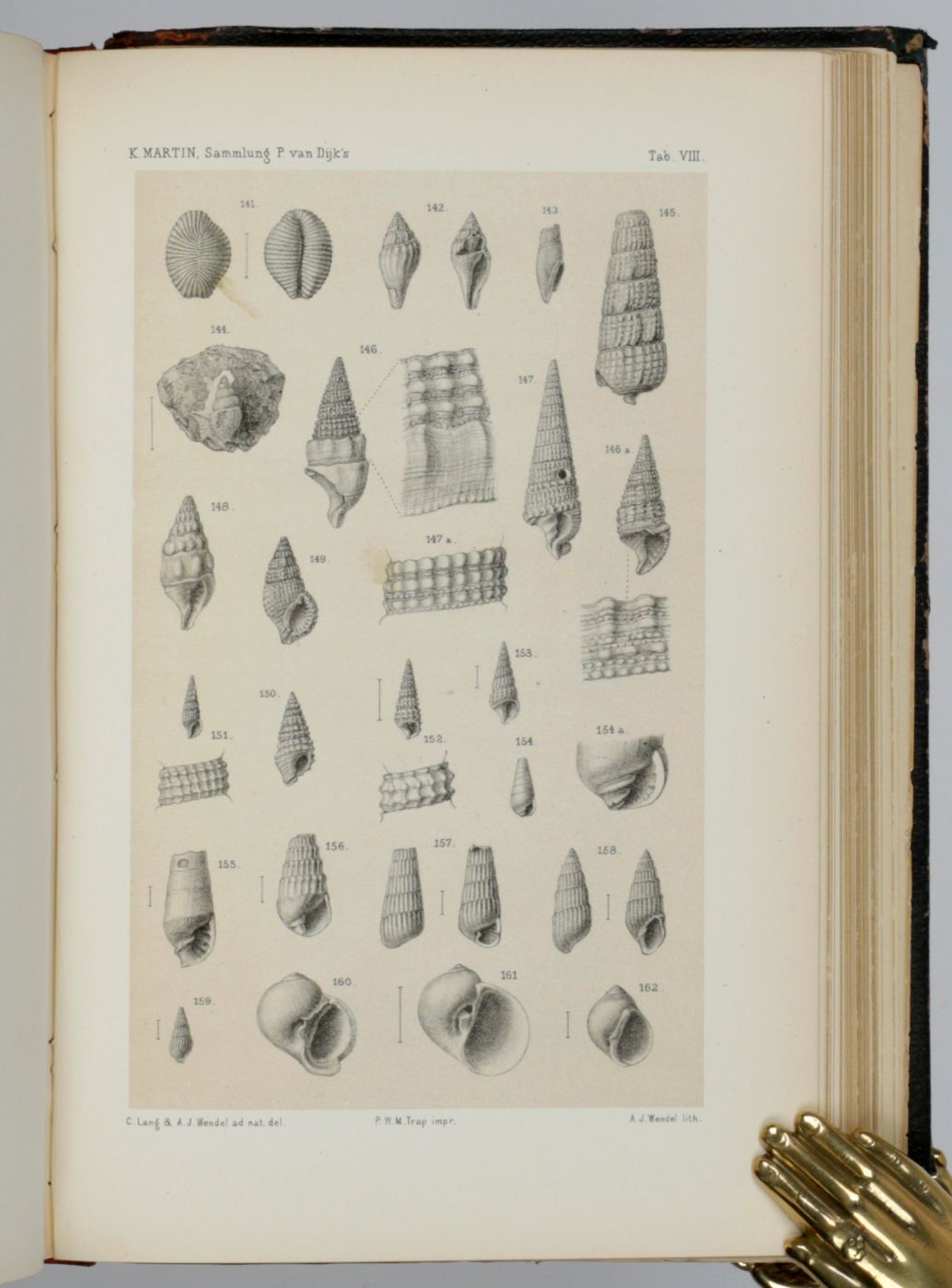 The series was started by the German-Dutch geologist, palaeontologist and director of the Geological Museum of Leiden, Johann Karl Ludwig Martin (1851-1942) and the German geologist and mineralogist Carl Ernst Arthur Wichmann (1851-1927), and continued by the Dutch geologist Berend George "Beer" Escher (1885-1967), brother of the famous illustrator, M. C. Escher. "[Wichmann] became professor at Utrecht University. Geological research was never done at Utrecht before, and Wichmann committed himself to the task of starting a geological institute. Apart from setting up research and education Wichmann had to start a geological collection, for which reason he participated in expeditions to Dutch colonies, in 1888-1889 to the Dutch East Indies (Celebes, Flores, Timor and Rotti) and in 1902-1903 to New Guinea" (Wikipedia). Contents are mostly palaeontological (featuring molluscs in particular), but also mineralogical, volcanological, geographical, and so on. Most papers are well-illustrated. Volumes I-III bound in one. The others bound per volume. Some occasional light foxing; boards of the first, combined, volume weak and the spine cover partly cracked and chipped, but still holding; all other volumes with some very light shelf wear only, thus overall in very good condition.