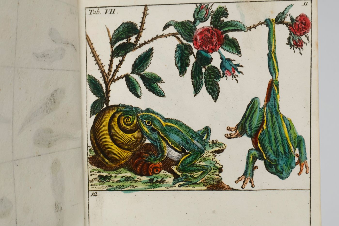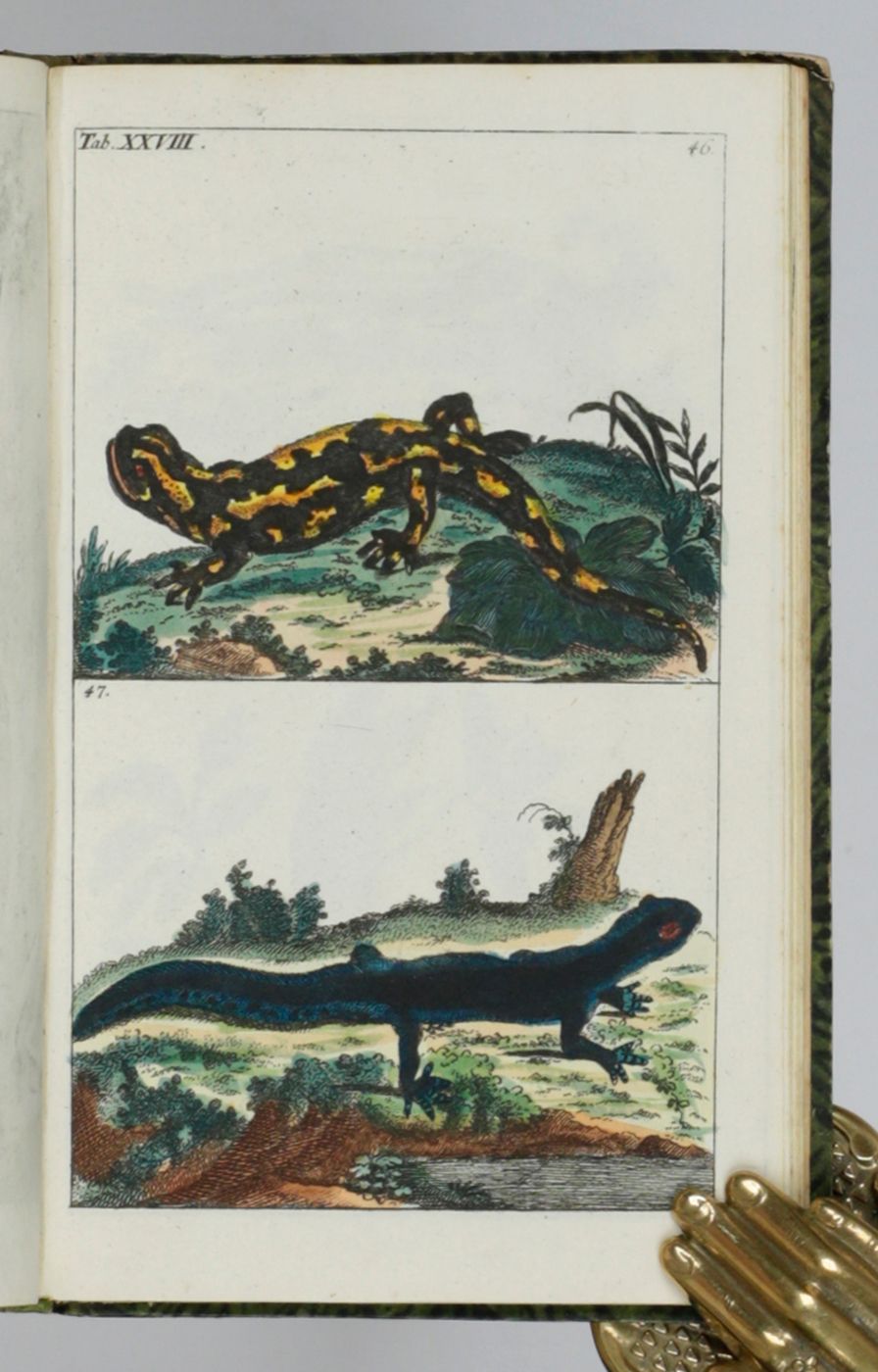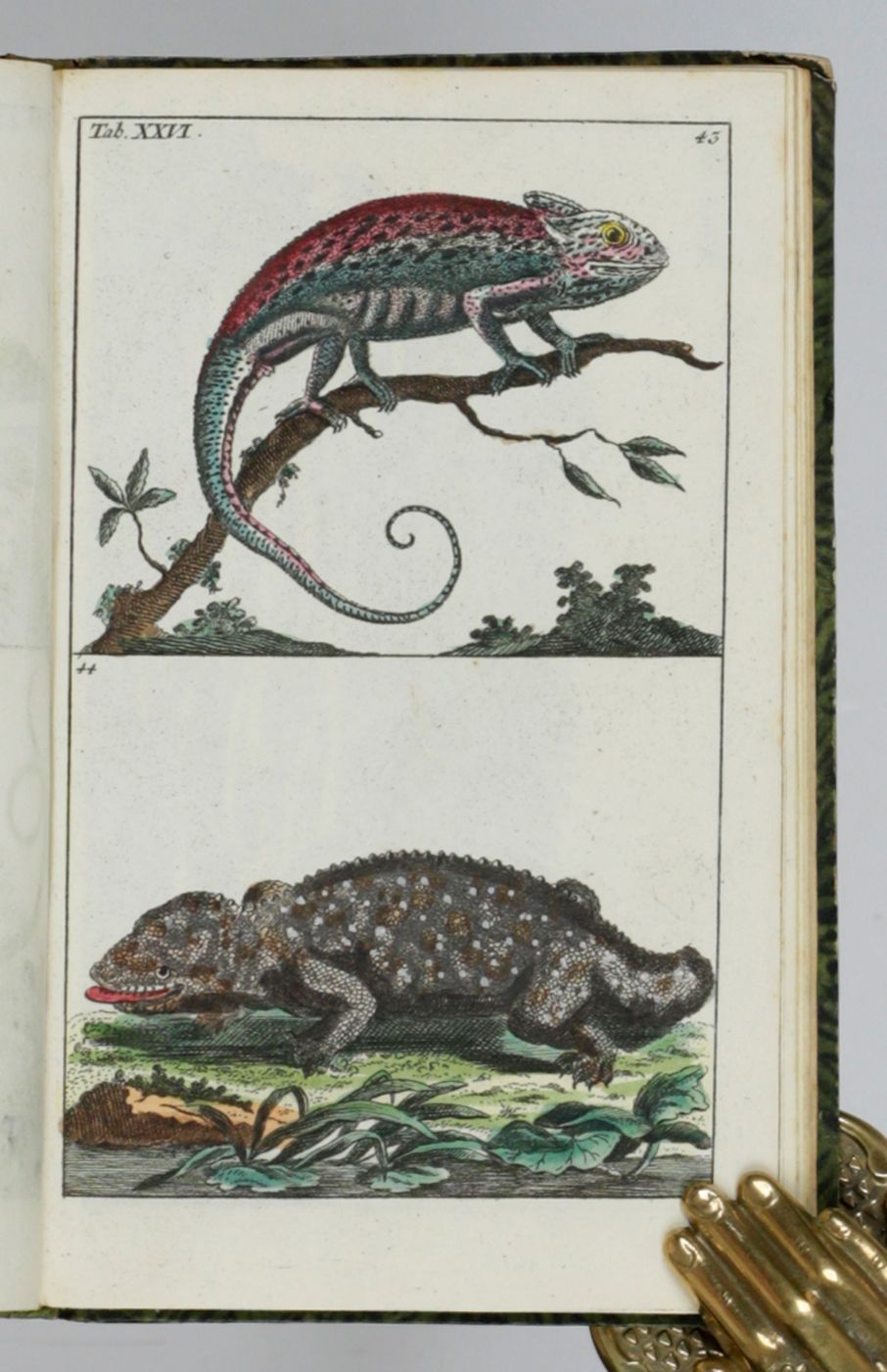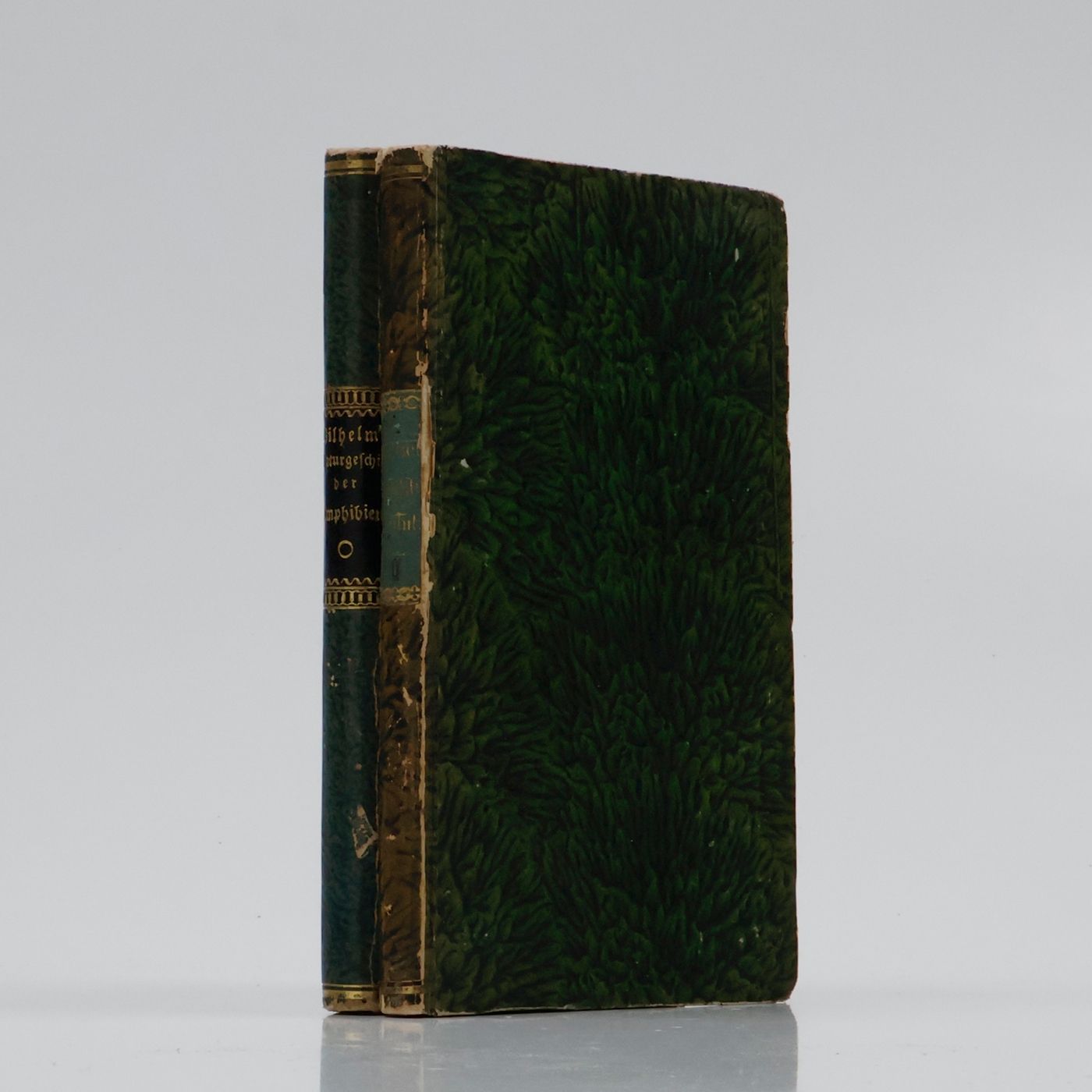 The complete herpetology of a series of natural history works titled "Natural History stories", renowned for its plates, as much as for its texts, if not more so. Written by the German naturalist Gottlieb Tobias Wilhelm (1758-1811). This is the complete, final edition. A French edition was published too. Provenance: the name Con[rad] Schefold, written in an old hand on the front free endpaper recto of the text volume; pictorial bookplate of the Swiss zoologist Christian Sigrist mounted on the front pastedowns. Boards with some light age-wear. Minimal spotting, here and there; the plates clean. The colouring is strong and very bright. This "Neue Ausgabe" (new edition) has the text more condensed and in a smaller typeface, than the first edition, hence there are fewer text pages. A French edition was published too. The colouring is strong and very bright. Nissen ZBI 4408.