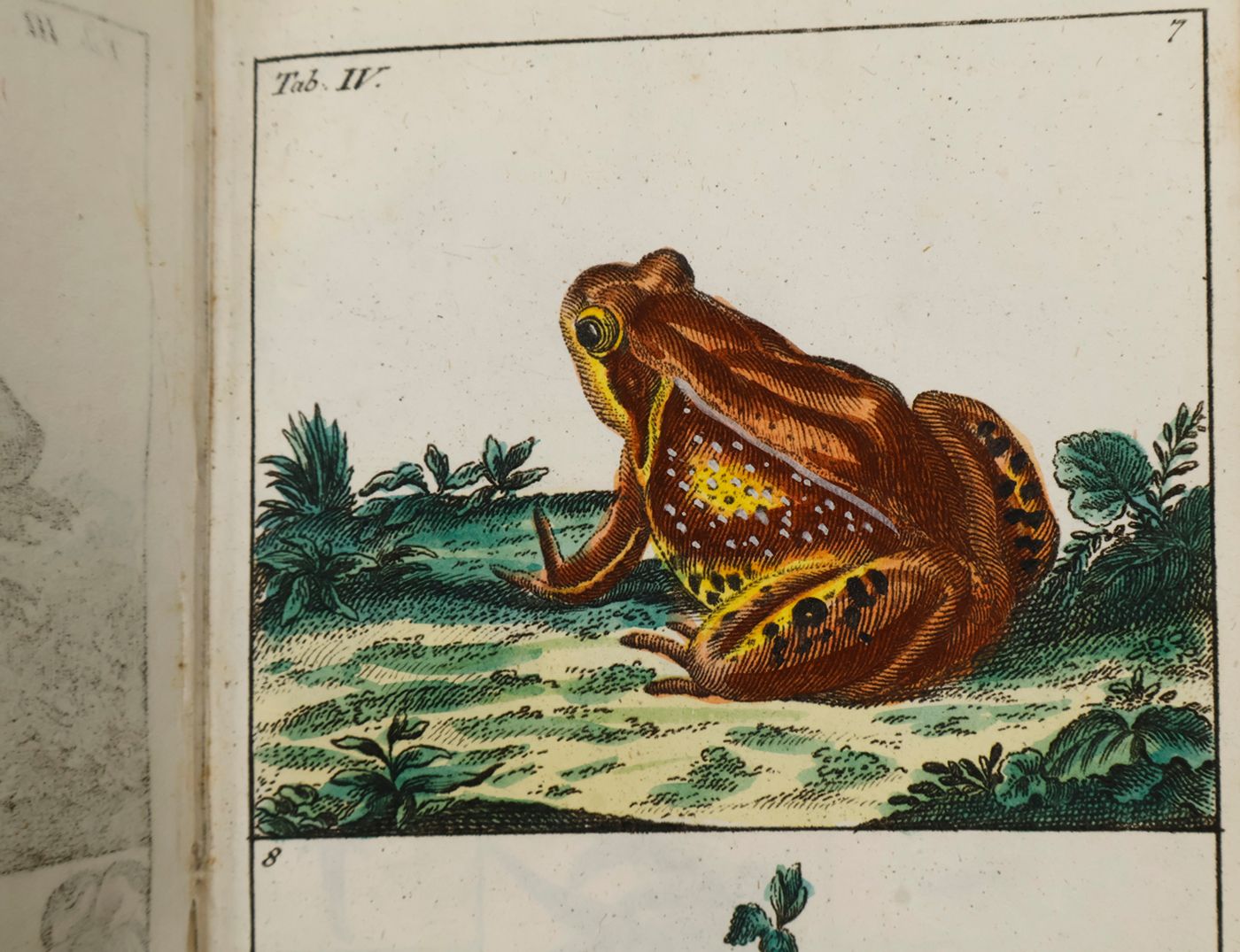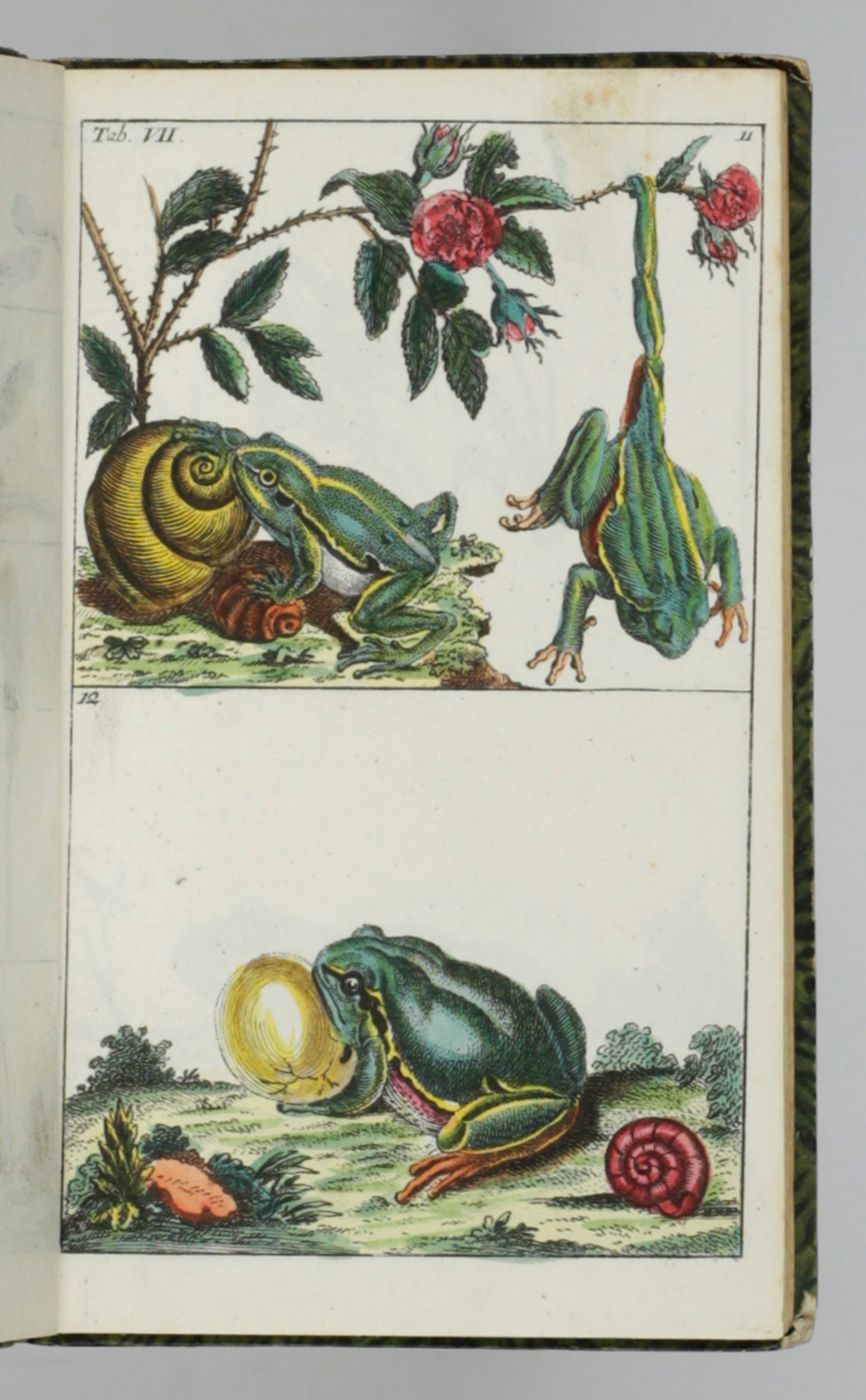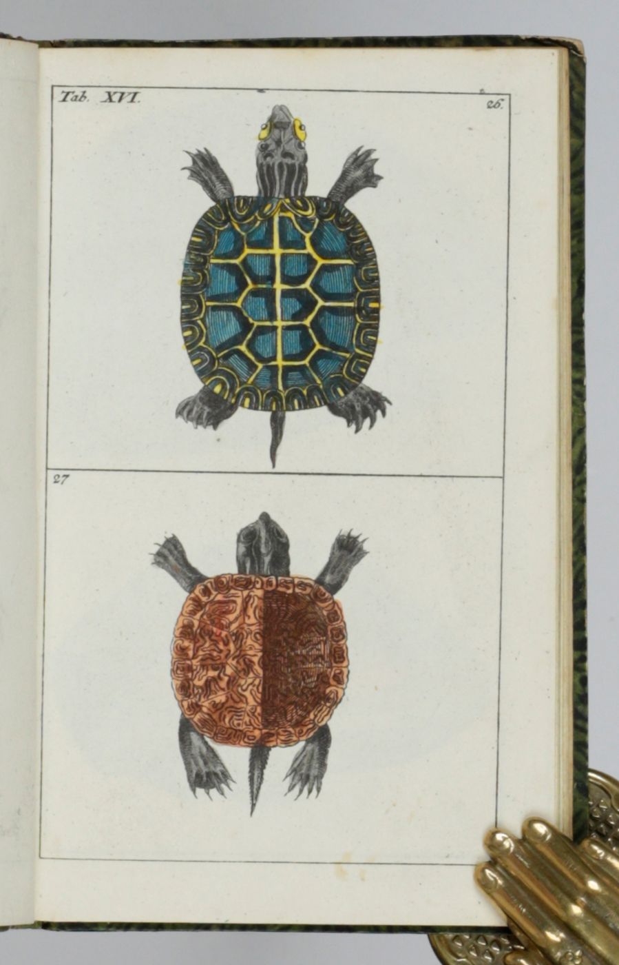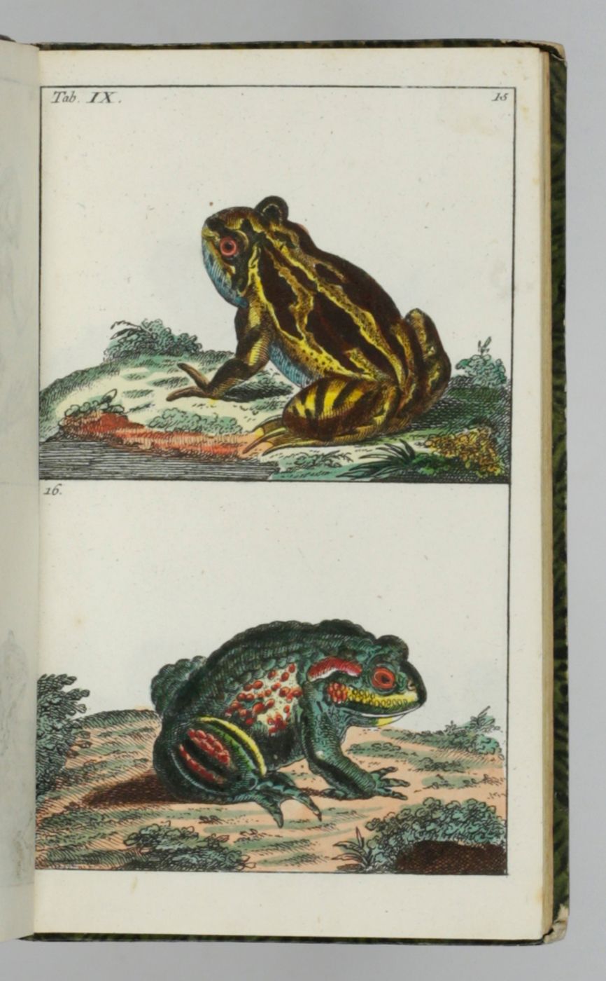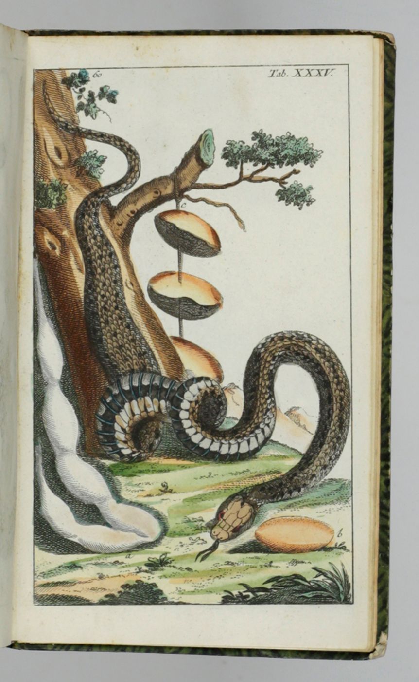 The complete herpetology of a series of natural history works titled "Natural History stories", renowned for its plates, as much as for its texts, if not more so. Written by the German naturalist Gottlieb Tobias Wilhelm (1758-1811). This is the complete, final edition. A French edition was published too. Provenance: the name Con[rad] Schefold, written in an old hand on the front free endpaper recto of the text volume; pictorial bookplate of the Swiss zoologist Christian Sigrist mounted on the front pastedowns. Boards with some light age-wear. Minimal spotting, here and there; the plates clean. The colouring is strong and very bright. This "Neue Ausgabe" (new edition) has the text more condensed and in a smaller typeface, than the first edition, hence there are fewer text pages. A French edition was published too. The colouring is strong and very bright. Nissen ZBI 4408.