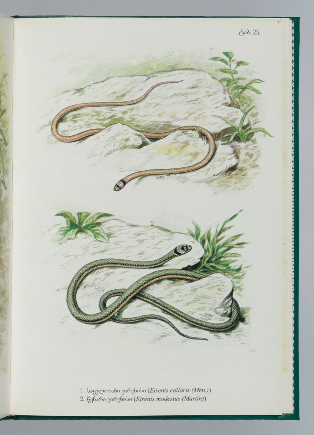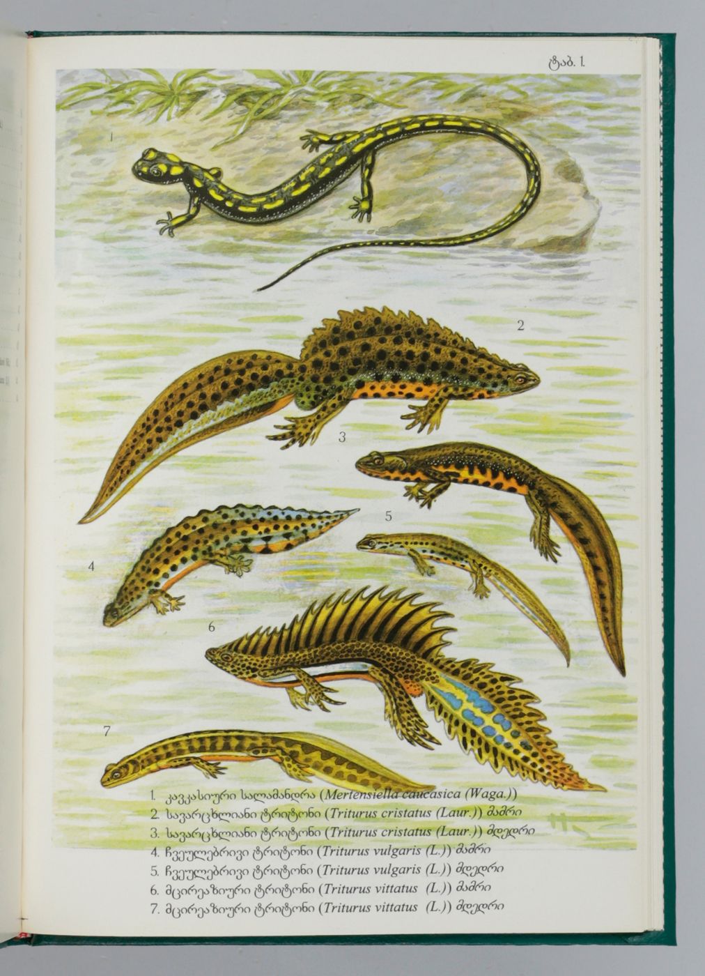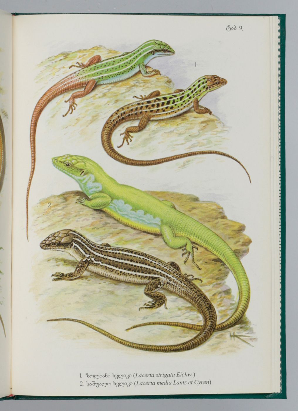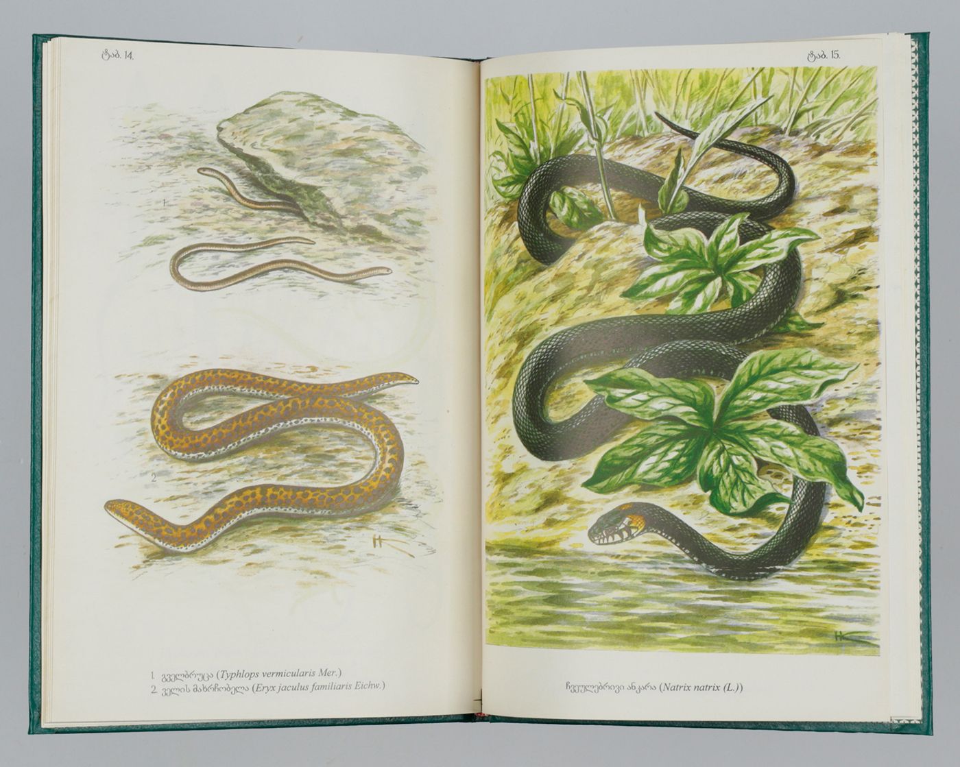 First (only?) edition of the only recent atlas of the reptiles and amphibians of Georgia (southwestern Caucasus and adjacent Black Sea coastal regions). Written by the Georgian herpetologist Teimuraz Alexandrovich Muskhelishvili (b. 1932). With 30 detailed plates by the famous Russian natural history illustrator Nikolai Nikolaevich Kondakov (1908-1999), showing animals in their habitats. Kondakov "redefined the relationship of science, nature and art" (Abrams). In total, 53 (sub)species are illustrated. Written in Georgian, with Latin nomenclature. A mint copy. Abrams, M. (1992). Introducing the Art of Nikolai Kondakov. American Birds 46(1)(7).