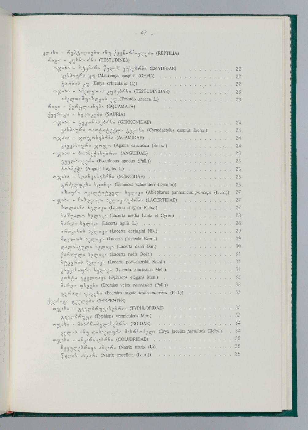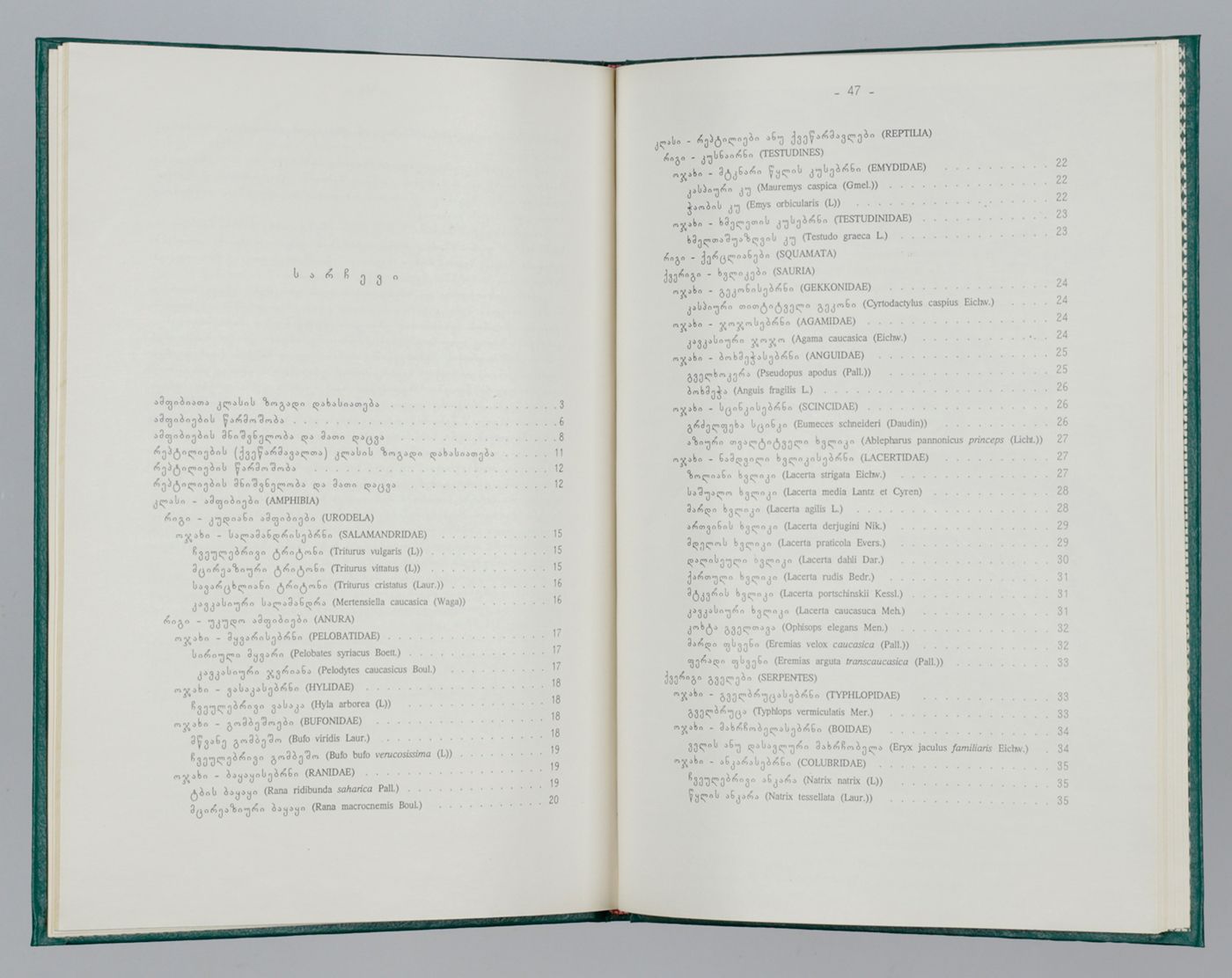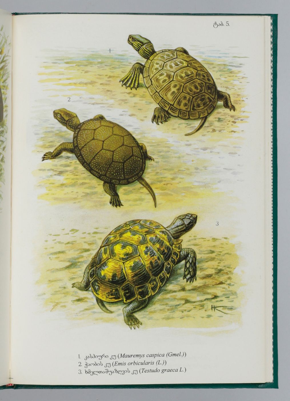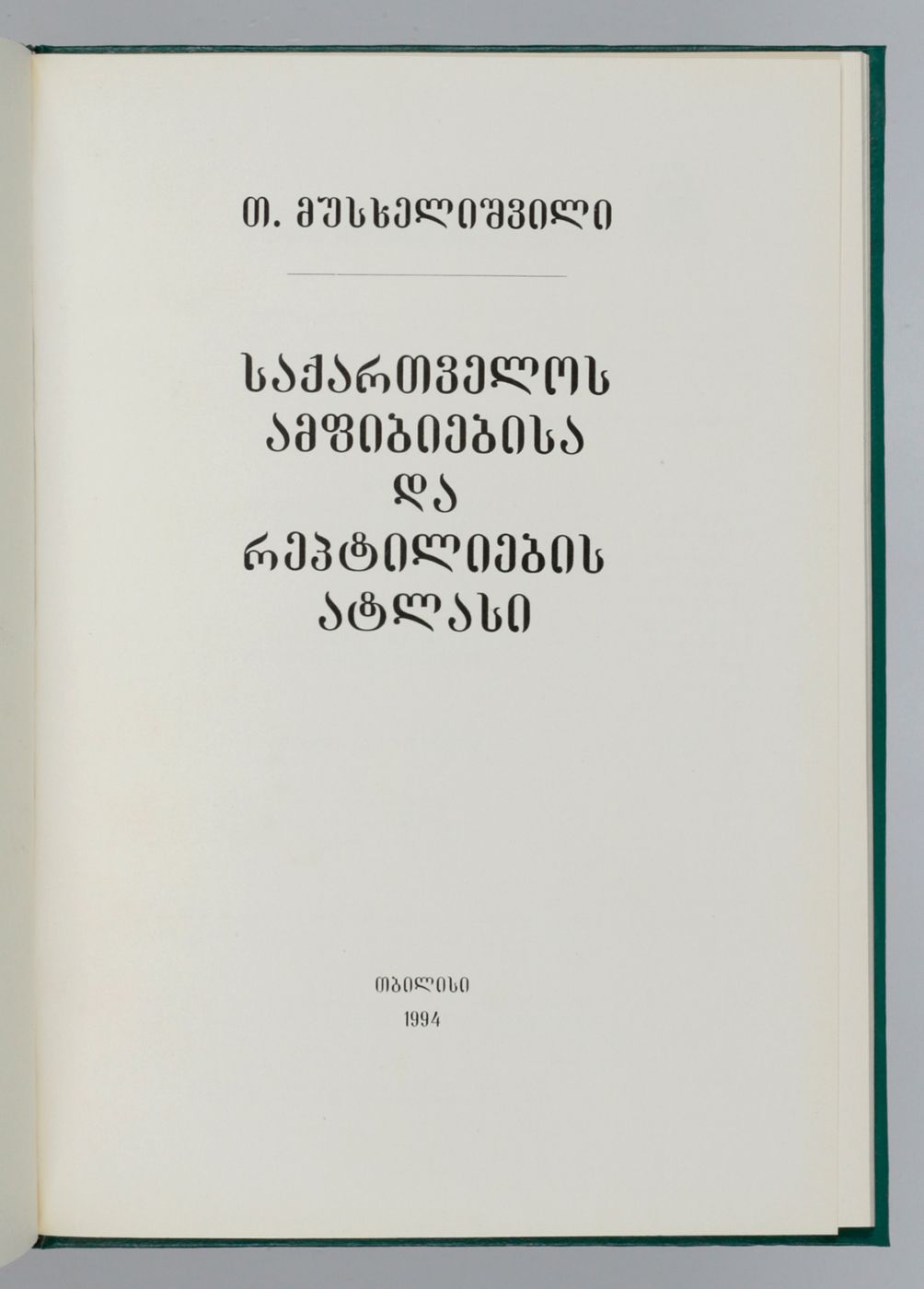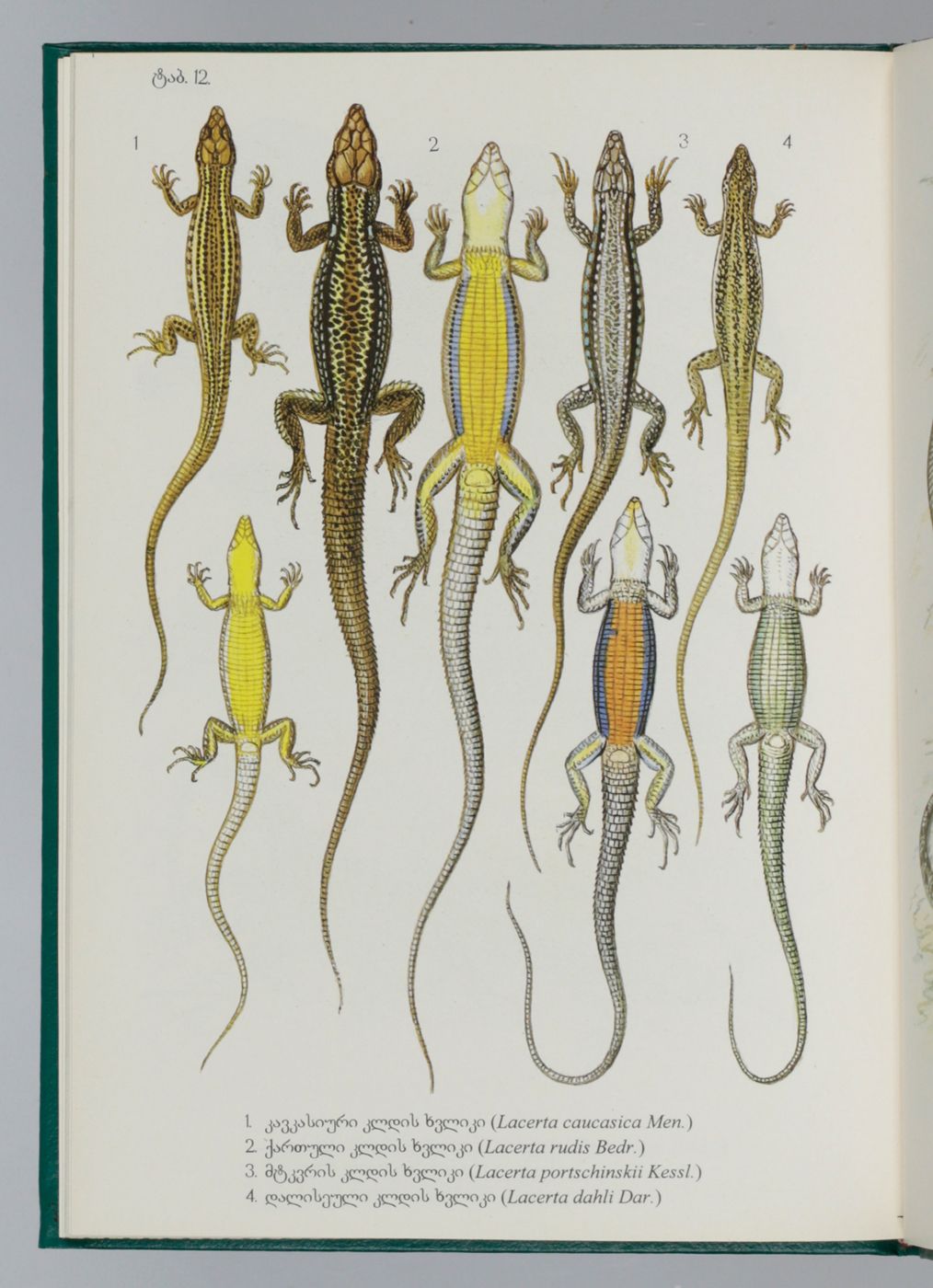 First (only?) edition of the only recent atlas of the reptiles and amphibians of Georgia (southwestern Caucasus and adjacent Black Sea coastal regions). Written by the Georgian herpetologist Teimuraz Alexandrovich Muskhelishvili (b. 1932). With 30 detailed plates by the famous Russian natural history illustrator Nikolai Nikolaevich Kondakov (1908-1999), showing animals in their habitats. Kondakov "redefined the relationship of science, nature and art" (Abrams). In total, 53 (sub)species are illustrated. Written in Georgian, with Latin nomenclature. A mint copy. Abrams, M. (1992). Introducing the Art of Nikolai Kondakov. American Birds 46(1)(7).