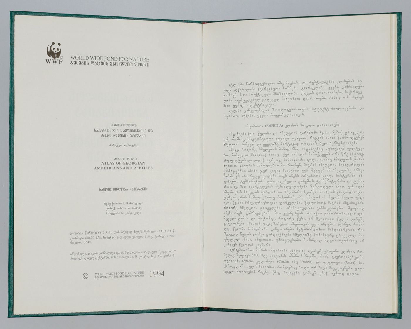 Tbilisi, "World Wide Fond for Nature" [World Wide Fund for Nature], 1994. Large 4to (30.0 x 21.5 cm). 48 pp.; 30 full colour plates. Publisher's green mock leather with gilt title on the front board. Patterned endpapers.