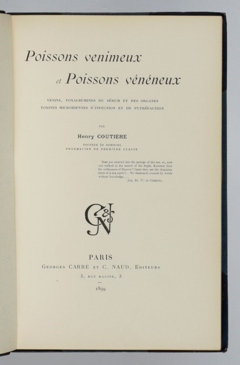 A seldom-seen work by the French zoologist, ichthyologist, and, chiefly, carcinologist François Louis Henri "Henry" Coutière (1869-1952). Although the spine vignettes may suggest that this work is about snake "poison", it actually is about poisons and toxics in fish (poissons). Remnants of glue and paper on the front pastedown; hinges weak, some wear to the edges; otherwise very good. Front hinge starting; otherwise, the binding is very attractive. Definitely rare when complete with the wrappers, such as this copy. Not in Cat. BM(NH).
