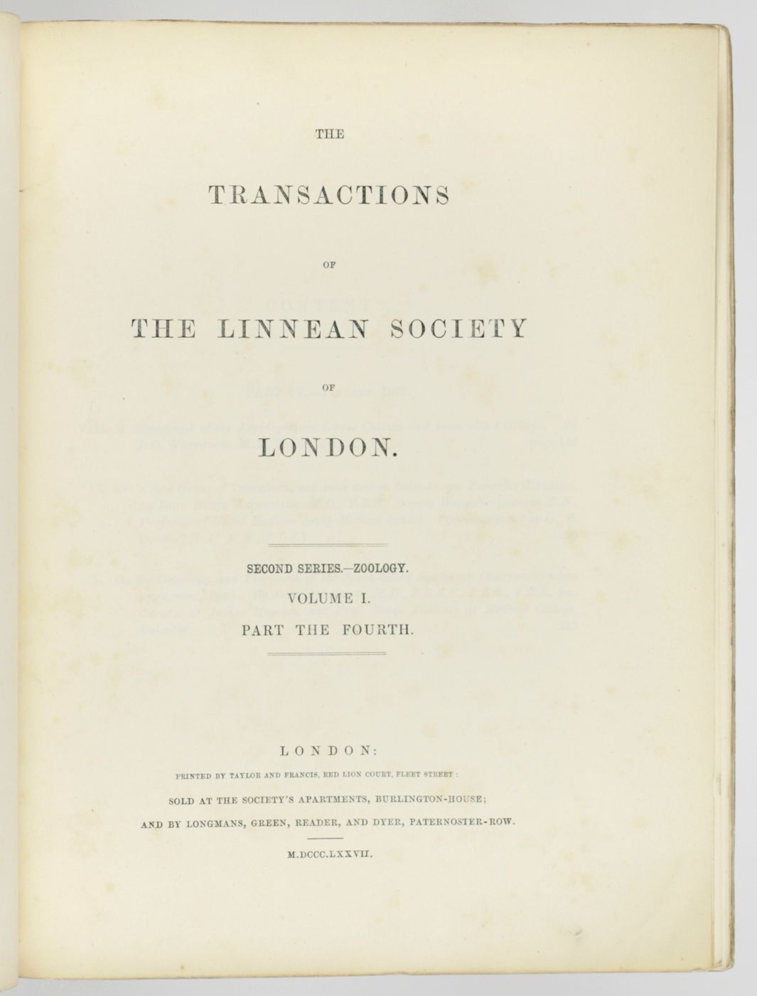 London, Linnean Society, 1879. Large 4to (30.3 x 23.7 cm). 49 pp.; six lithographed plates of which four very nicely hand-coloured. Original printed wrappers.