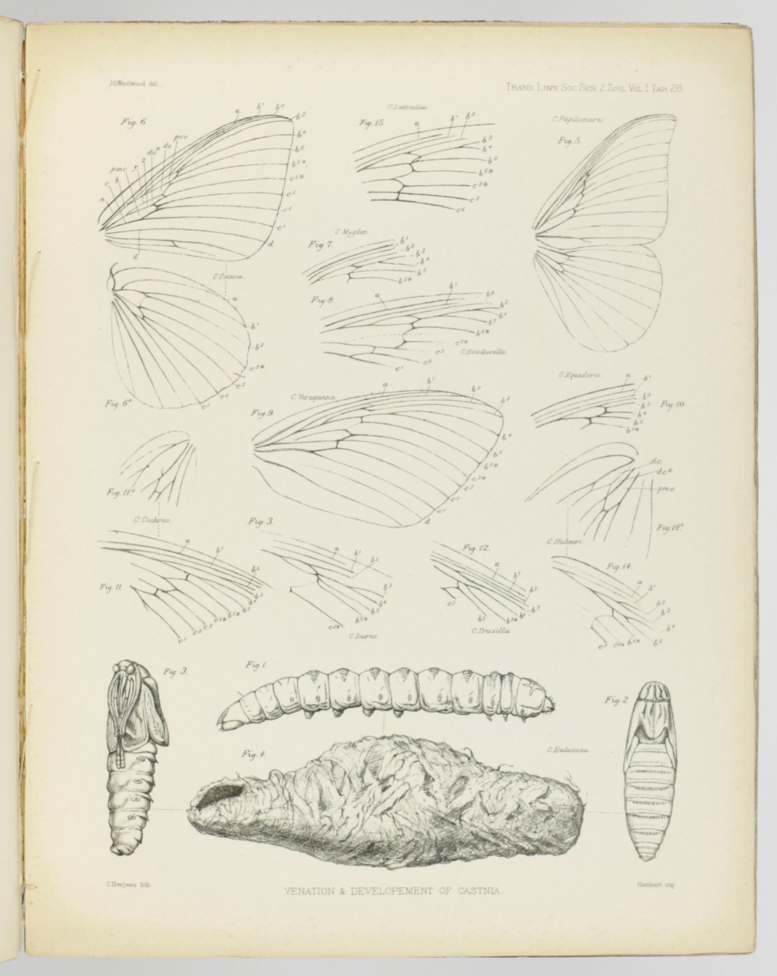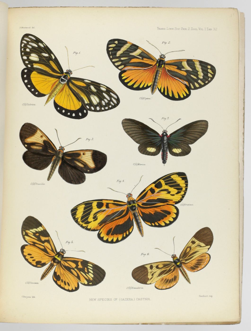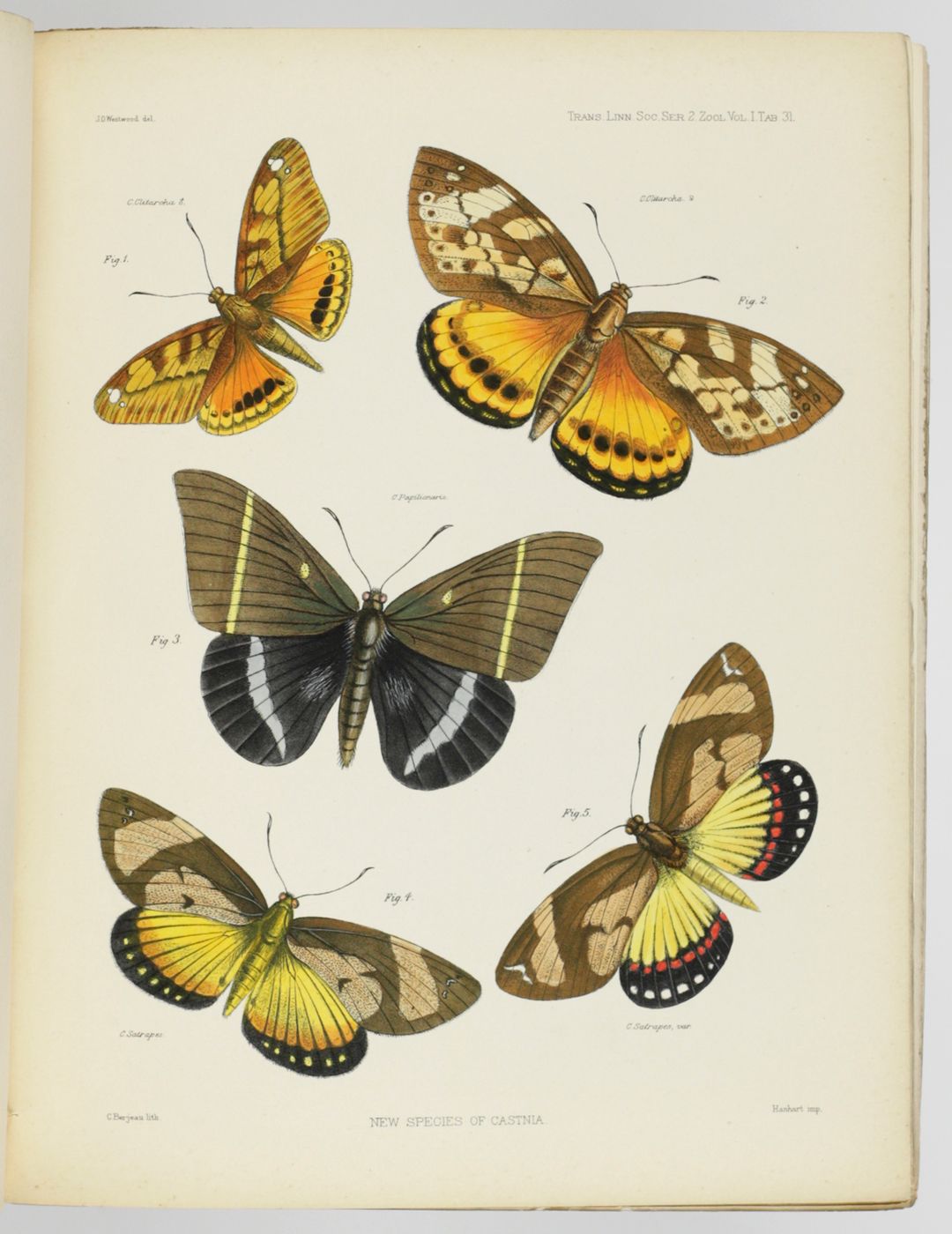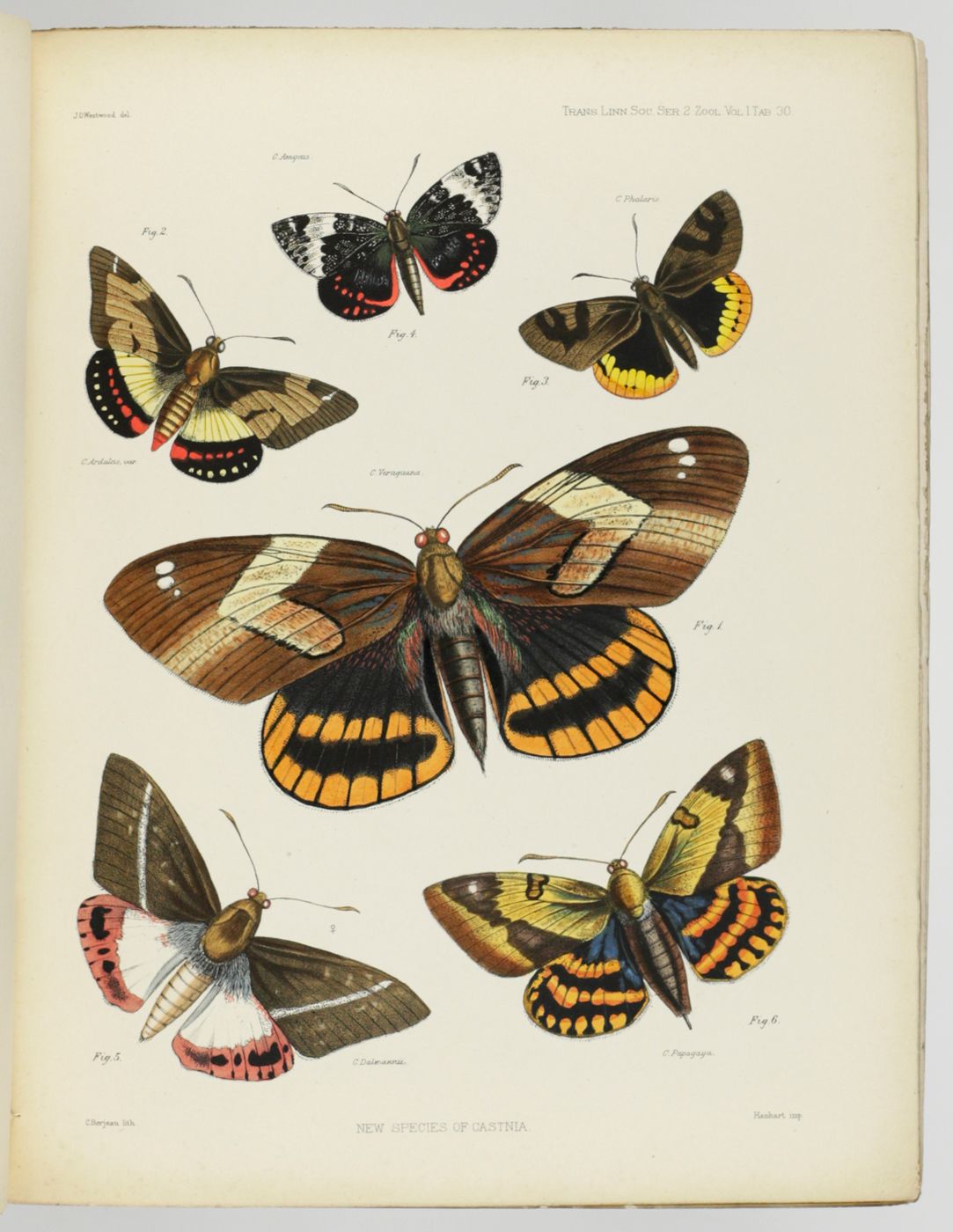 An excellent monograph by one of the foremost 19th-Century British entomologists, John Obadiah Westwood (1805-1893). It deals with a group of very colourful Australian and Neotropical butterflies. The coloured plates by C. Berjeau are truly excellent. Published in the Society's Transactions, Second Series - Zoology, volume 1(4), and now seldom seen. With the issue's wrappers. With two much smaller, unrelated contributions in the rear. A very good, clean and unmarked copy. Horn-Schenkling II(4), p. 422. Not in Nissen.