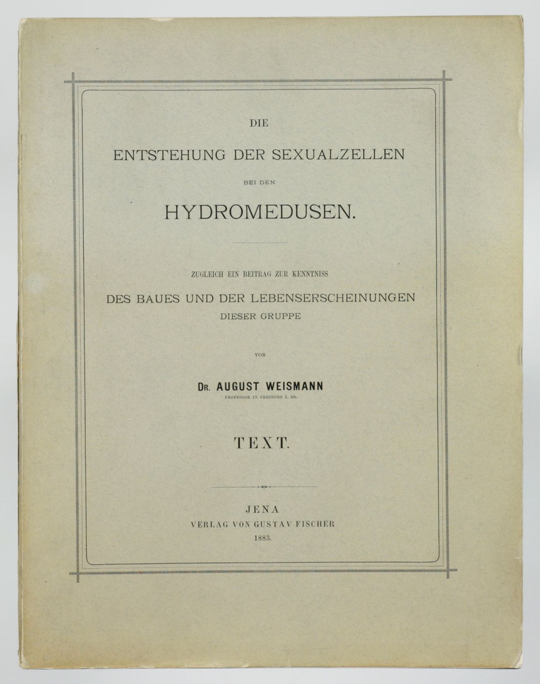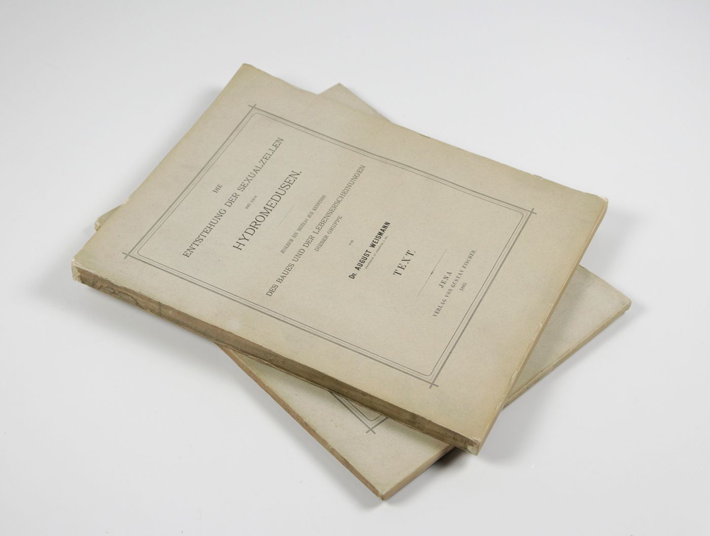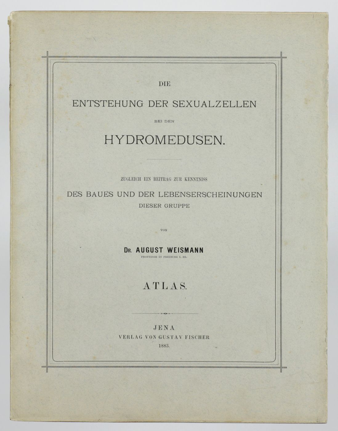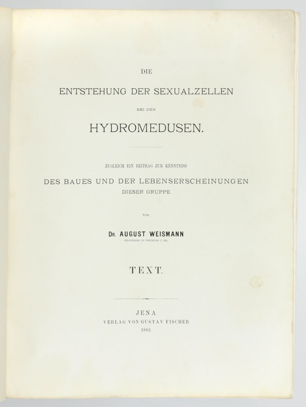 August Friedrich Leopold Weismann (1834-1914) was a German evolutionary biologist, who was ranked by the great 20th-century evolutionary biologist Ernst Mayr (1904-2005) as the second most notable evolutionary theorist of the 19th century, after Charles Darwin. This is his rarely seen seminal work on the development of sexual cells in invertebrates, in particular medusae, on which he based his Germ Plasm theory, a "...concept of the physical basis of heredity expressed by the 19th-century biologist August Weismann. According to his theory, germ plasm, which is independent from all other cells of the body (somatoplasm), is the essential element of germ cells (eggs and sperm) and is the hereditary material that is passed from generation to generation. Weismann first proposed this theory in 1883" (Brittanica). "He ... took up the examination of the Hydrozoa and followed the origin of the cells through generations of Hydromedusae. The culmination of this work was Die Entstehung der Sexualzellen bei den Hydromedusen (Jena, 1883), and his conclusions, as he traced the fate of primitive germ cells and those after them, were strong evidence to Weismann that there was a continuity of the germ plasm" (DSB). Slight staining to the wrappers of the atlas, text rear wrapper somewhat frayed, a few, isolated spots, but generally very clean, including the fine plates. A very good copy. Cat. BM(NH) p. 2287; DSB XIV, p. 234; Nissen ZBI, 4361.