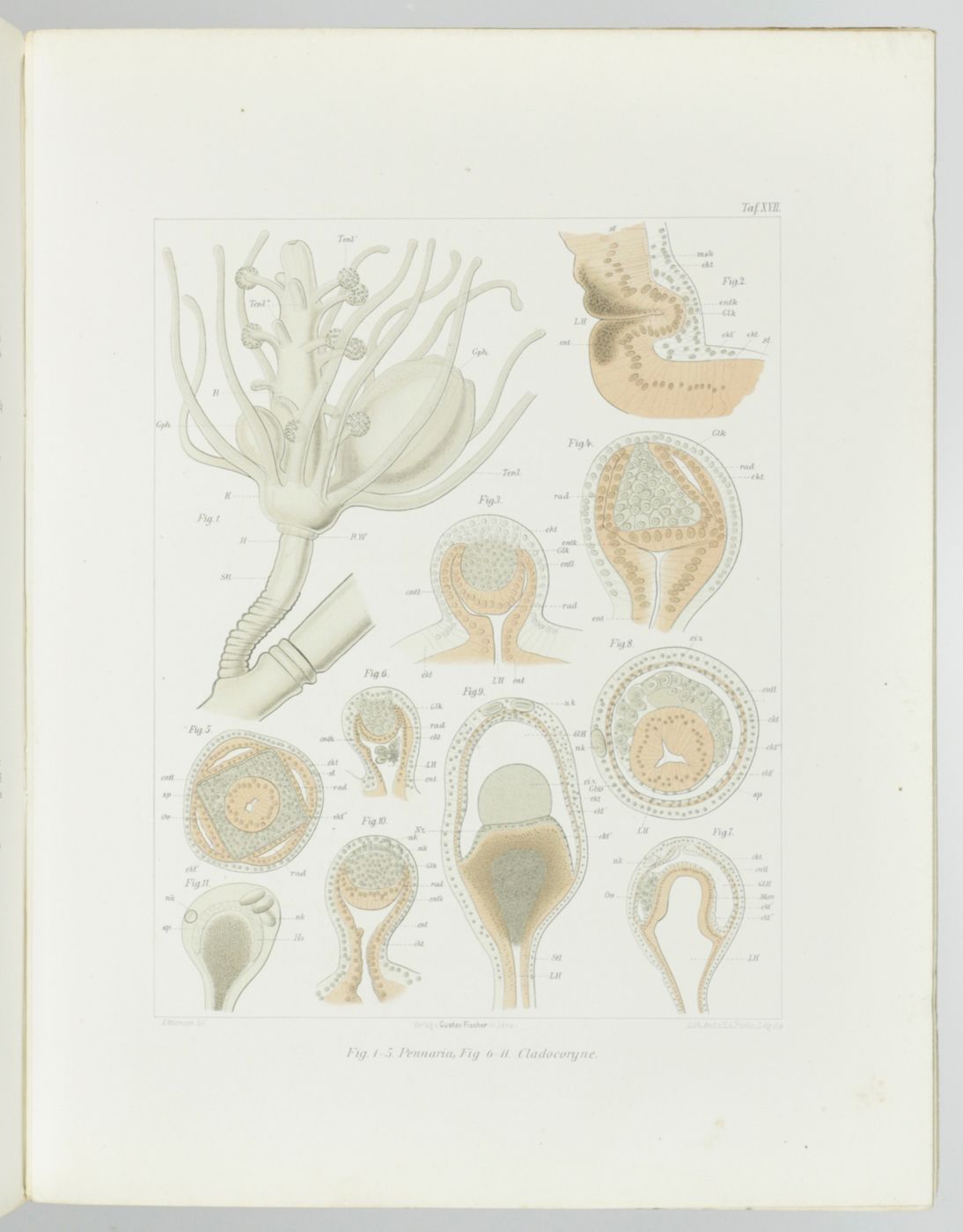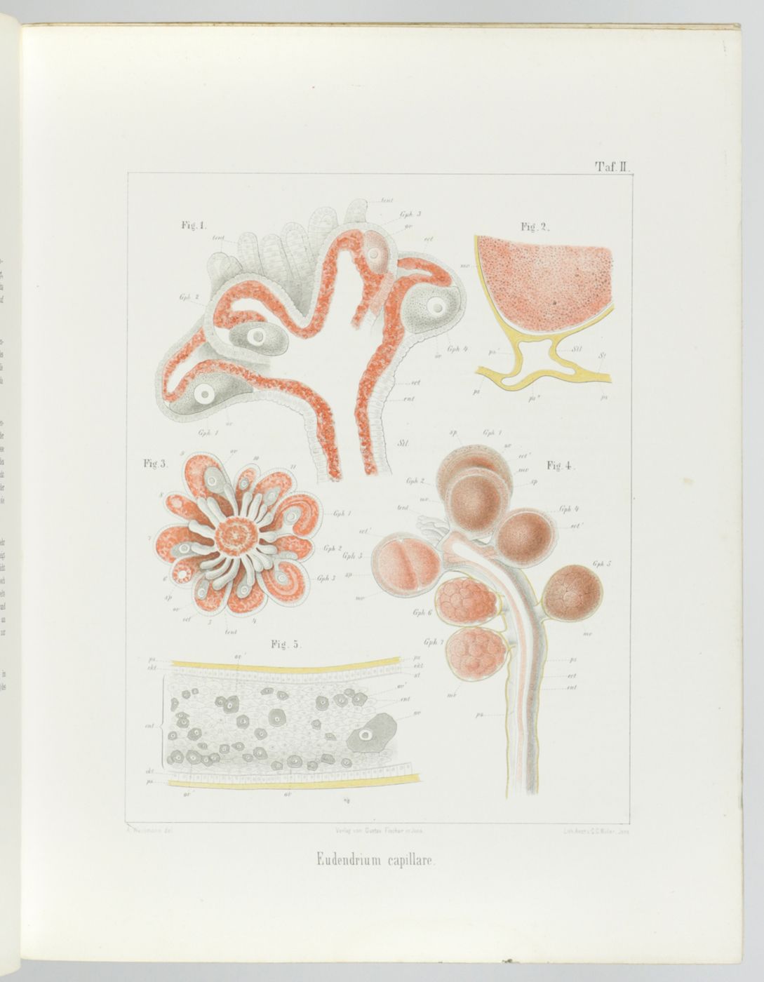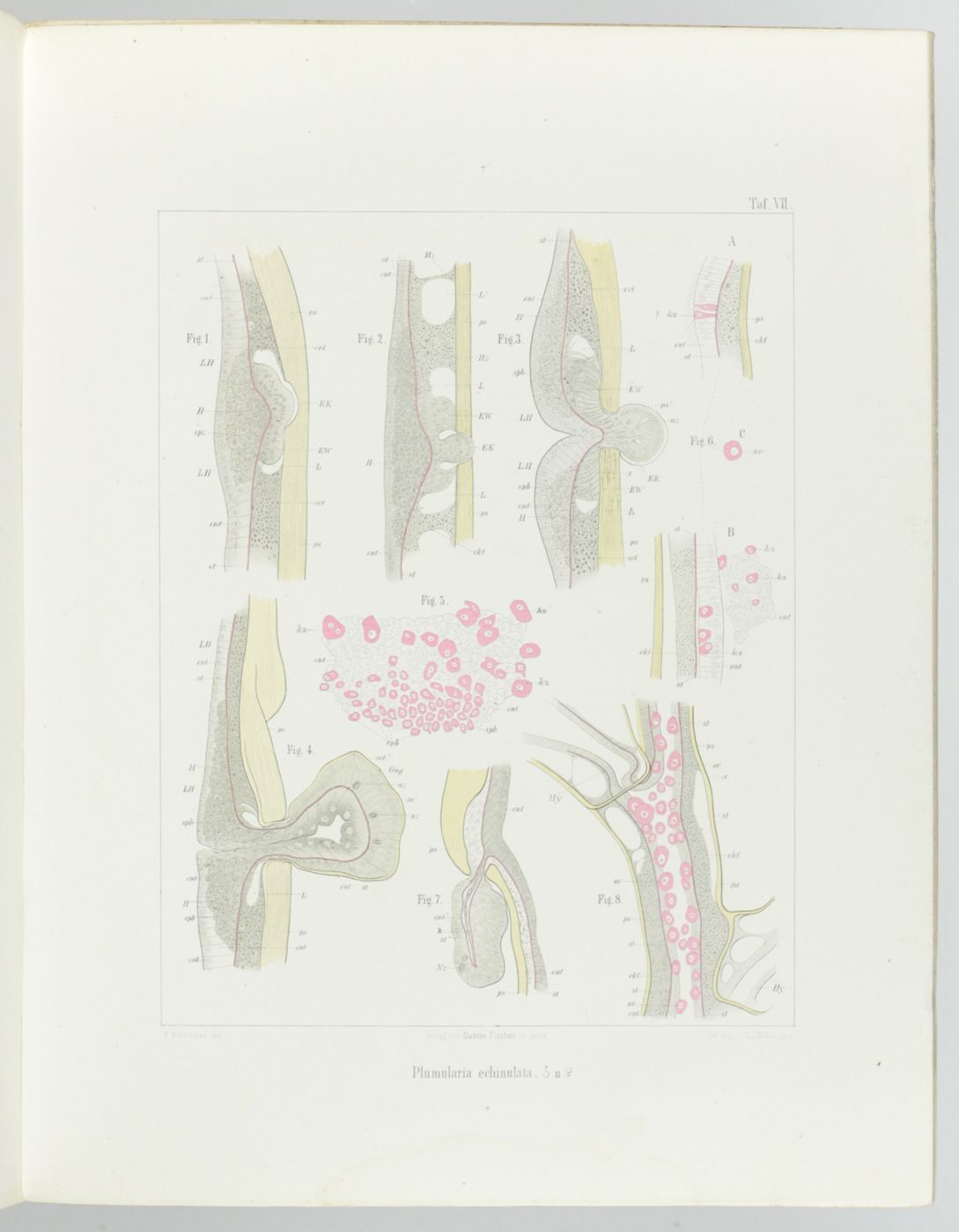 Jena, Gustav Fischer, 1883. In two volumes (text and atlas). 4to (35.4 x 27.2 cm). Title page, iii- xiii, 295 pp. [text volume]; title page, [i] p.; 24 chromolithographed plates with explanatory text leaves [atlas volume].