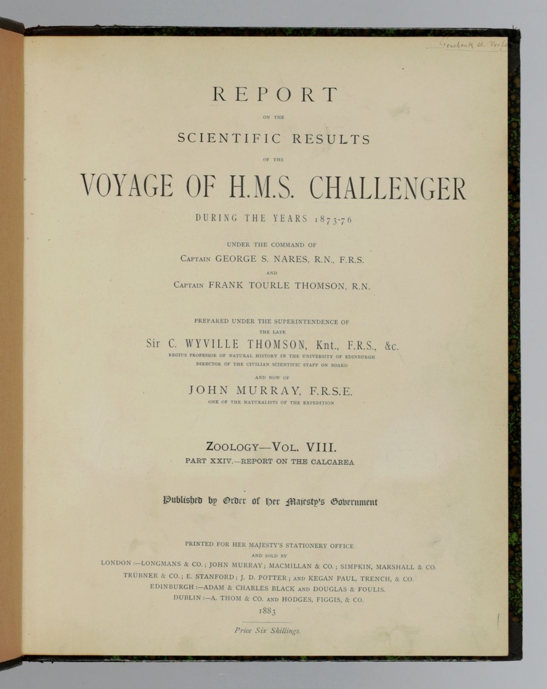 Report on the scientific results of the voyage of H.M.S. Challenger during the years 1873-76 under the command of captain George S. Nares, R.N., F.R.S. and captain Frank Tourle Thomson, R.N. prepared under the superintendence of the late Sir. C. Wyville Thomson, Knt., F.R.S., &c. and now of John Murray, F.R.S.E.. Zoology - Vol. VIII. Part XXIV. Report on the Calcarea dredged by H.M.S. Challenger, during the years 1873-76. By N. Poléjaeff, M.A., of the University of Odessa.
