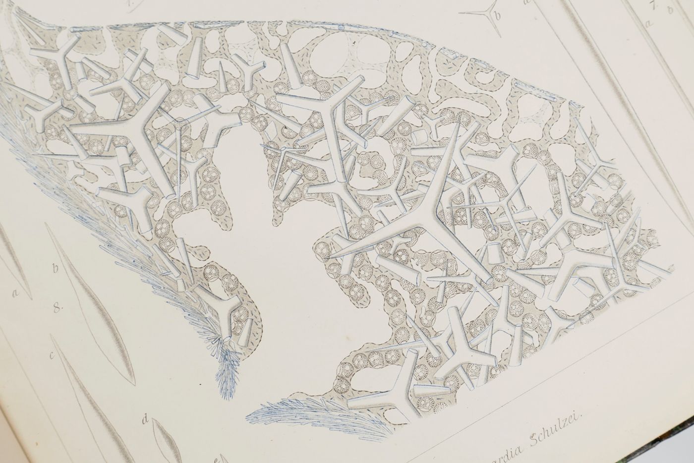 A rare part from the famous Challenger Reports. It deals with the calcareous sponges (or "Calcispongiae") and includes many well-illustrated new species, mainly from deeper water. Written by the Russian spongiologist Nikolai Nikolaevich Poléjaeff (1857-1903). Single parts, such as this one, were not published in "official" green linen bindings, therefore, bindings may differ. Despite some rubbing to the spine and boards, this is a nice one. Text with a few pencil marks; stamp removed from title; otherwise a very good, clean copy. Nissen ZBI, 4754.