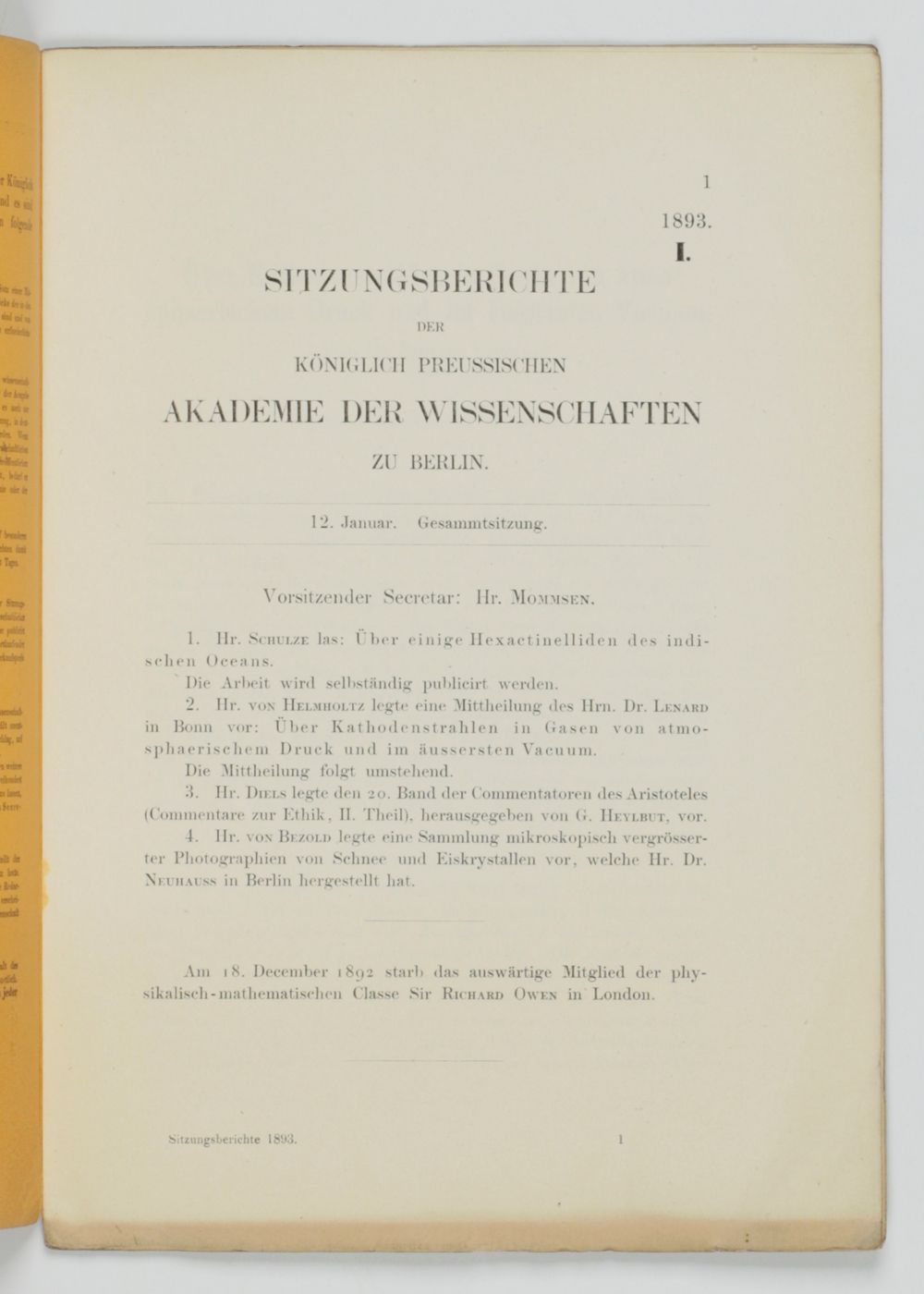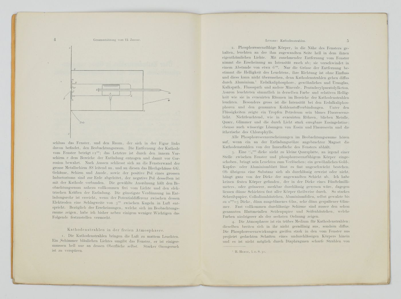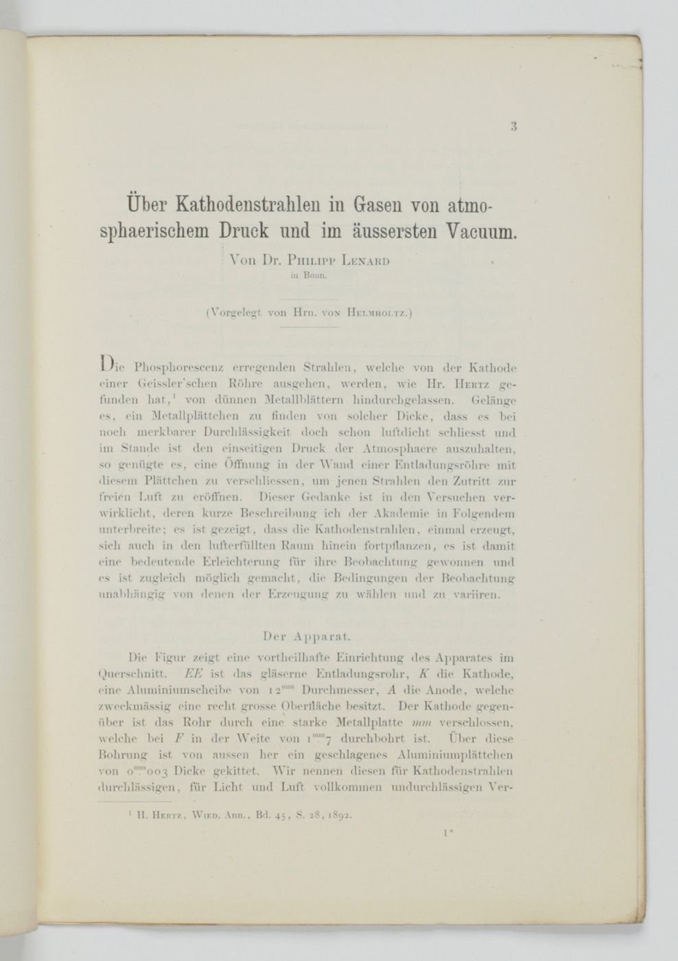 A very important contribution to physics (which contributed to him becoming a Nobel laureate in 1905) conceived and written by the German physicist Philipp Eduard Anton von Lenard (1862-1947). "As a physicist, Lenard's major contributions were in the study of cathode rays, which he began in 1888. Prior to his work, cathode rays were produced in primitive, partially evacuated glass tubes that had metallic electrodes in them, across which a high voltage could be placed. Cathode rays were difficult to study using this arrangement, because they were inside sealed glass tubes, difficult to access, and because the rays were in the presence of air molecules. Lenard overcame these problems by devising a method of making small metallic windows in the glass that were thick enough to be able to withstand the pressure differences, but thin enough to allow passage of the rays. Having made a window for the rays, he could pass them out into the laboratory, or, alternatively, into another chamber that was completely evacuated. These windows have come to be known as Lenard windows. He was able to conveniently detect the rays and measure their intensity by means of paper sheets coated with phosphorescent materials [This paper]. Lenard observed that the absorption of cathode rays was, to first order, proportional to the density of the material they were made to pass through. This appeared to contradict the idea that they were some sort of electromagnetic radiation. He also showed that the rays could pass through some inches of air of a normal density, and appeared to be scattered by it, implying that they must be particles that were even smaller than the molecules in air. He confirmed some of J. J. Thomson's work, which eventually arrived at the understanding that cathode rays were streams of negatively charged energetic particles. He called them quanta of electricity or for short quanta, after Helmholtz, while Thomson proposed the name corpuscles, but eventually electrons became the everyday term. ...Lenard grew extremely resentful of the credit accorded to Wilhelm Röntgen, who received the first Nobel Prize in physics in 1901, for the discovery of the X-ray, ... Lenard wrote that he, not Roentgen, was the “mother of the X-rays,” since he had invented the apparatus used to produce them. Lenard likened Röntgen’s role to that of a “midwife” who merely assists with the birth. ...Lenard is remembered today as a strong German nationalist who despised 'English physics', which he considered to have stolen its ideas from Germany. During the Nazi regime, he was the outspoken proponent of the idea that Germany should rely on 'Deutsche Physik' and ignore what he considered the fallacious and deliberately misleading ideas of 'Jewish physics', by which he meant chiefly the theories of Albert Einstein, including 'the Jewish fraud' of relativity. An advisor to Adolf Hitler, Lenard became Chief of Aryan Physics under the Nazis." (Wikipedia). Published in the academy's Sitzungsberichte, 1893 I, published on 19 January (wrapper date: 12 Januar. Uncut. Slight soiling to wrapper edges, weak, marginal creases; otherwise a very good, unmarked copy.