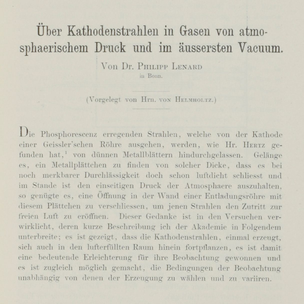 Über Kathodenstrahlen in Gasen von Atmosphaerischem Druck und im äussersten Vacuum.