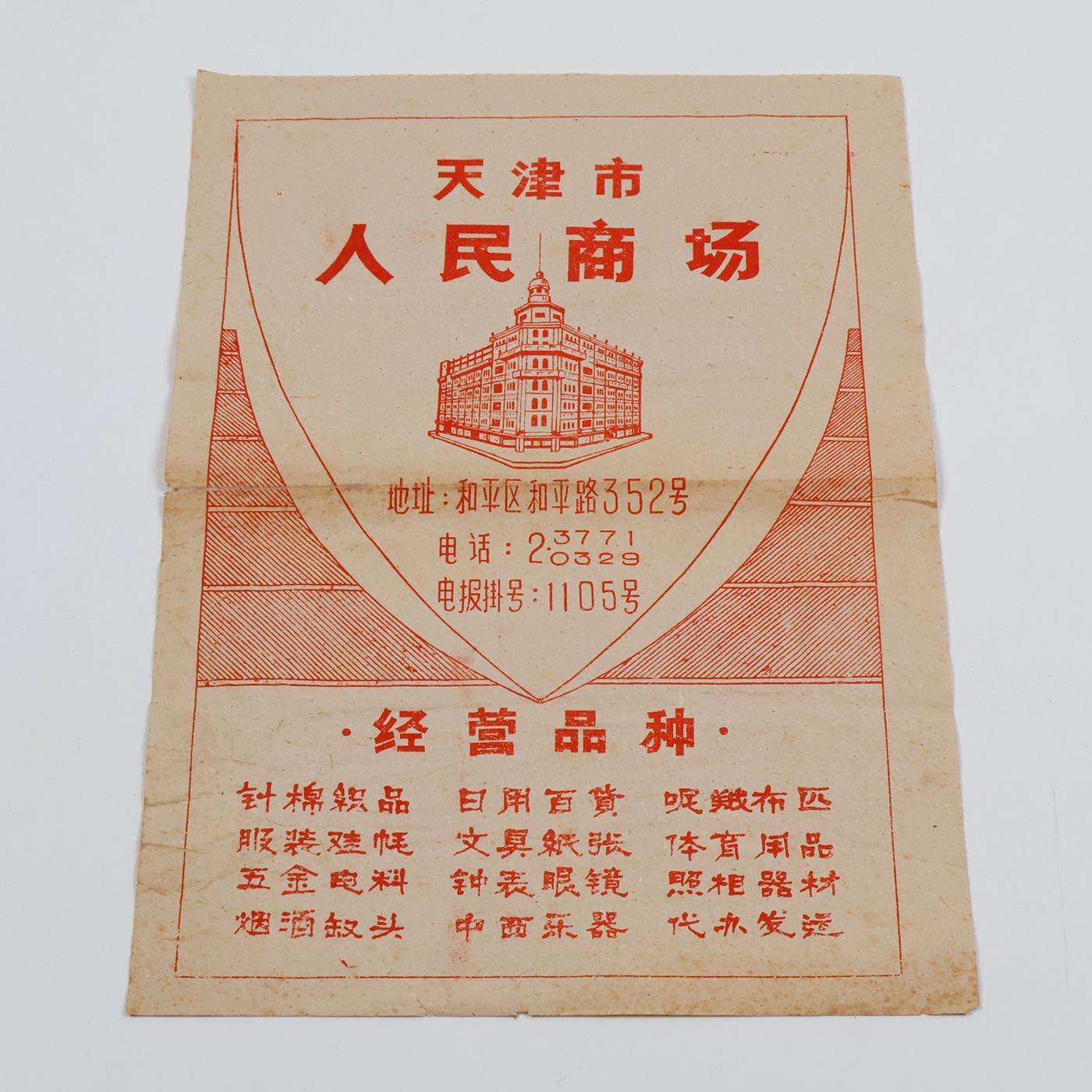 A very rare example of a poster and/or wrapping paper from a shopping mall in northern China, southeast of Beijing. The purpose-made building illustrated is in the so-called International style that was prevalent between ca. 1880 and ca. 1940. Many examples of this style are present in major cities around the world. And in China, long devoid of western influences on architecture and commerce, in particular along the famous Bund in Shanghai. Below the illustration is a list of product categories here on sale. Signs of age and use: creasing, several marginal tears; a few into the printed area, one longer, repaired (visible on verso). otherwise very good. It is rare to see this ephemeral object, nowadays.