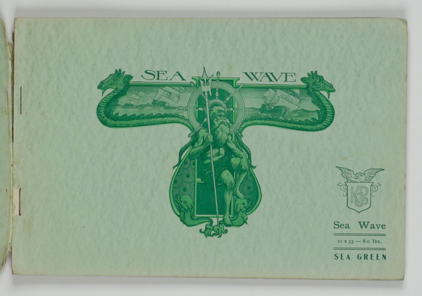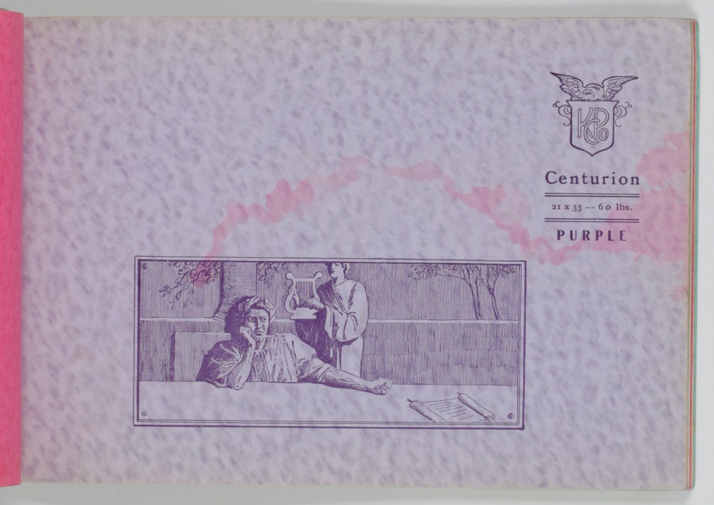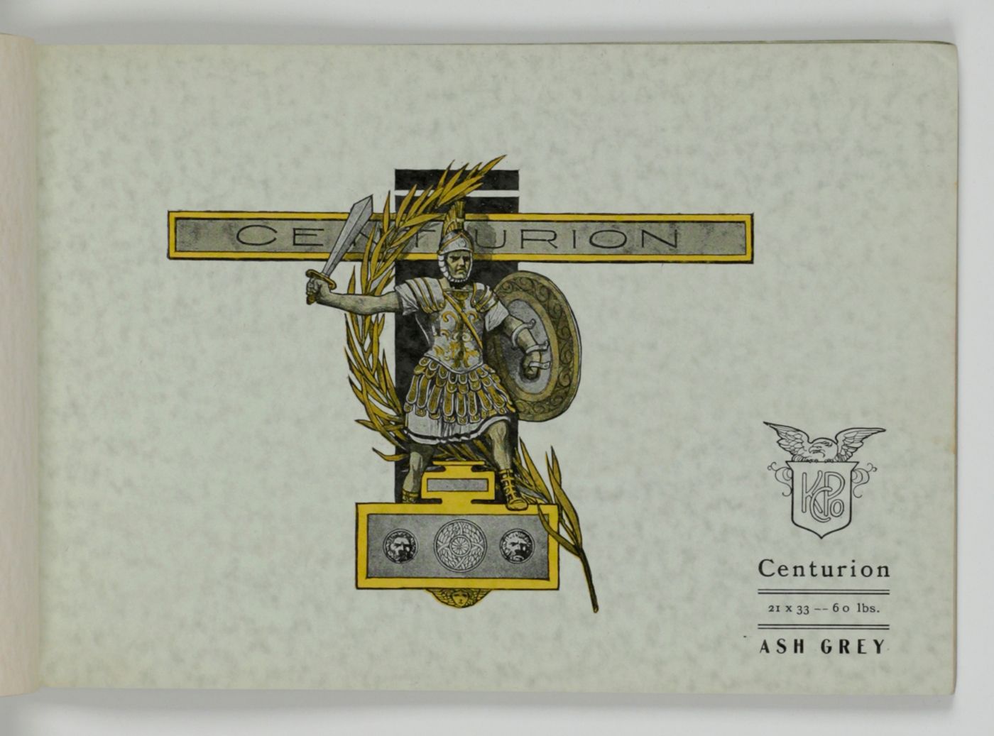 A wonderful paper-sample book with highly unusual LARGE and detailed illustrations on each paper sample, each with a connotation to the paper name. For instance: pirates and ships at sea for a paper called "Sea Wave", or two gladiators fighting, for a paper called "Centurion". The two red paper samples bleeding, leaving small stains to the adjacent leaves. Small damp-stain to the front cover; some staining to the rear cover; spine ends abraded; top outer corner slightly bumped. Otherwise, a very good copy. Very rare, we found no other copy, anywhere.