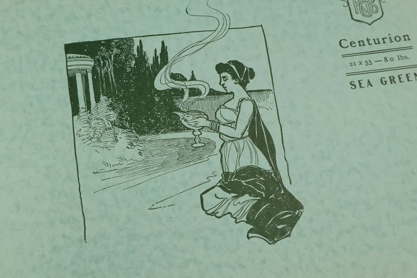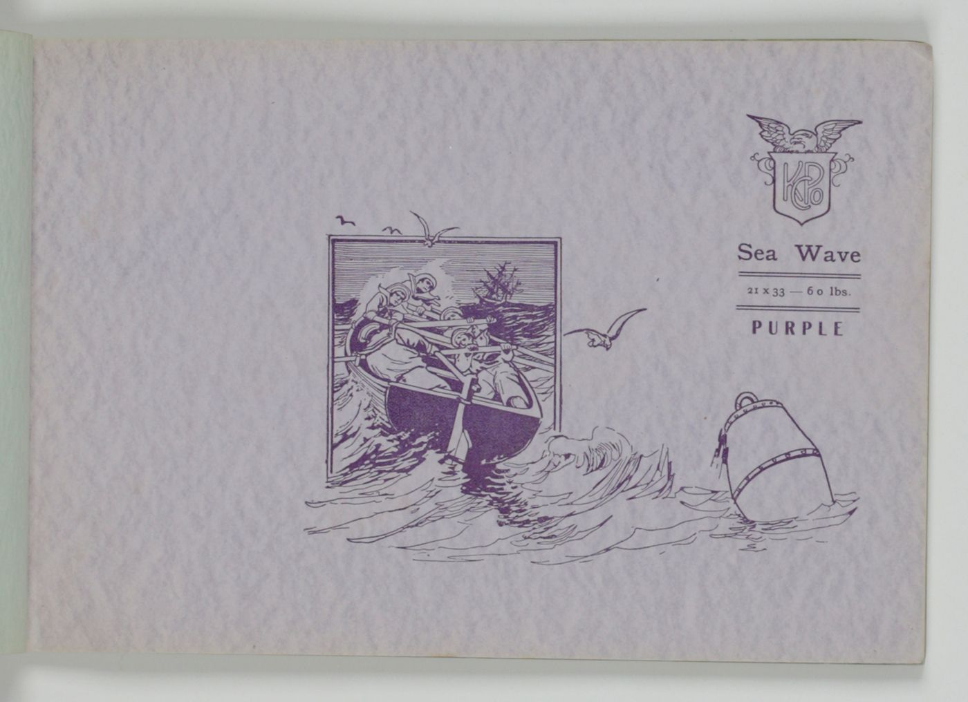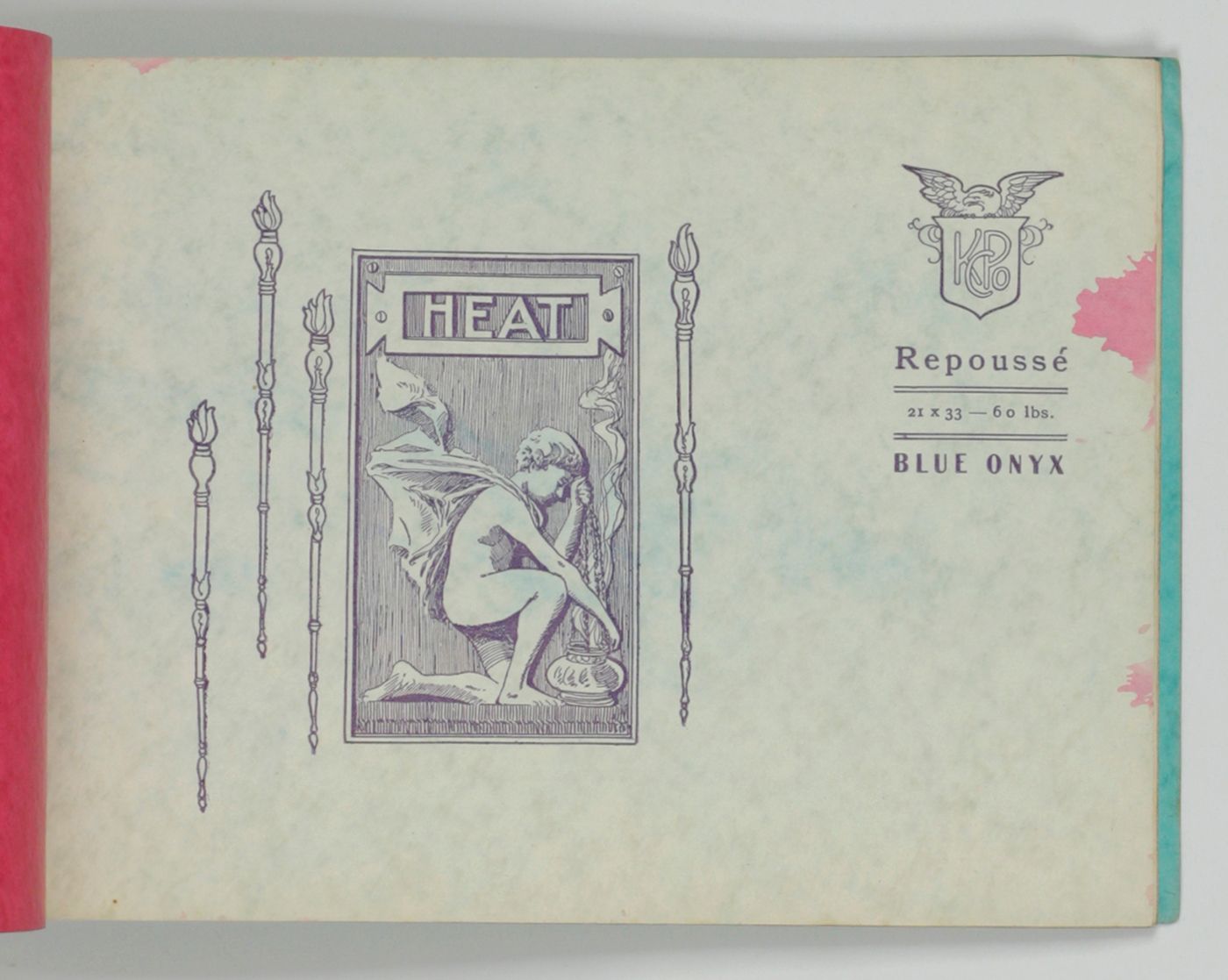 A wonderful paper-sample book with highly unusual LARGE and detailed illustrations on each paper sample, each with a connotation to the paper name. For instance: pirates and ships at sea for a paper called "Sea Wave", or two gladiators fighting, for a paper called "Centurion". The two red paper samples bleeding, leaving small stains to the adjacent leaves. Small damp-stain to the front cover; some staining to the rear cover; spine ends abraded; top outer corner slightly bumped. Otherwise, a very good copy. Very rare, we found no other copy, anywhere.