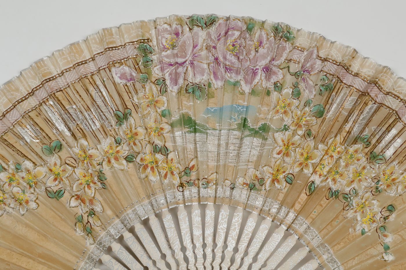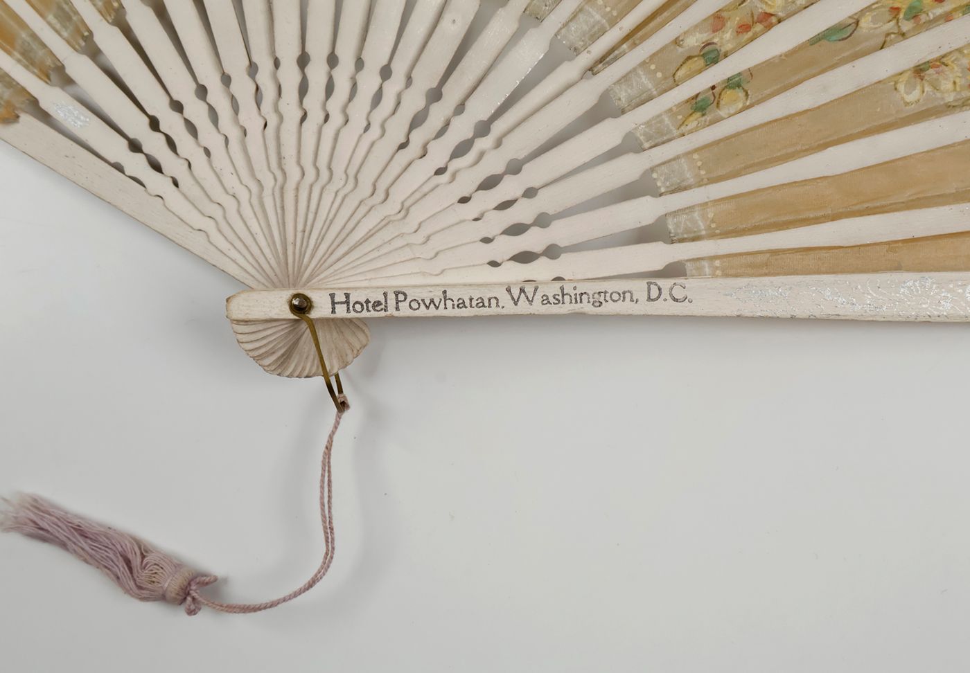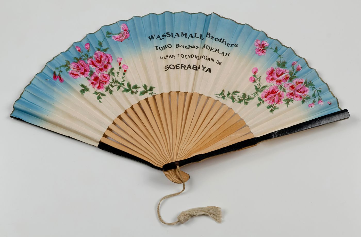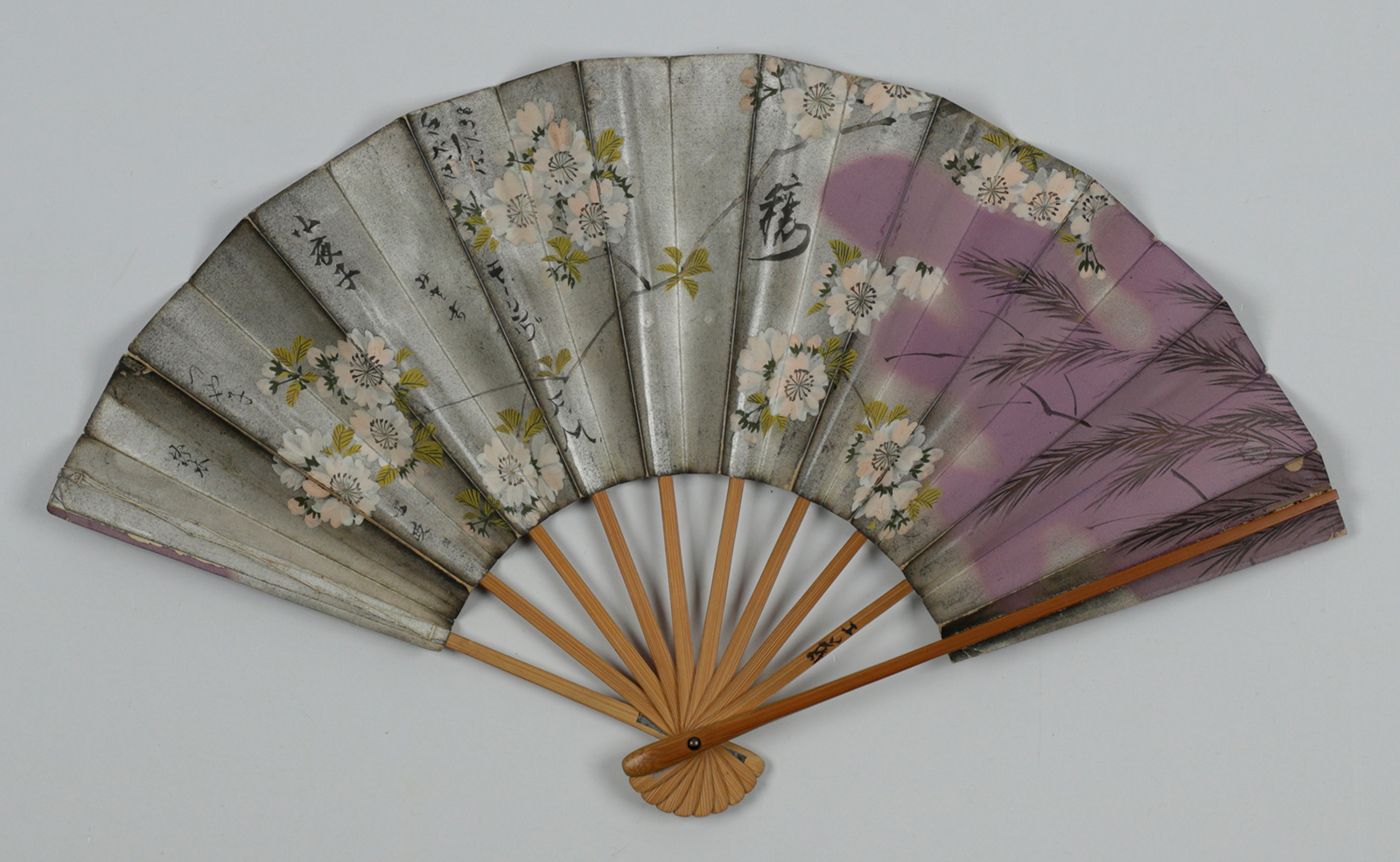Indonesia, U.S.A, and France, various manufacturers, ca. 1900-1950. All made of wood. 1. Indonesia, Soerabaya, Wassimal Brothers, Toko Bombay Moerah. Pasar Toendjoengan 36 (21.3 x 2.8 x 1.1 cm, 28 ribs), floral pattern on outer ribs back side; 2. Idem, however, with a 26 instead of 28 ribs, a metal shackle, and a different floral design. 3. Washington, DC, Hotel Powhatan (21.3 x 2.4 x 1.1 cm; 23 ribs); outer ribs silver-printed, translucent rice paper, with floral pattern, heightened with silver and gold. 4. Clermont-Ferrand, Taillerie de Royat, 35 Rue Neuve près la Place Jaude. (21.1 x 1.9 x 2.0 (widest); 16 ribs. With a photoprint titled Taille des agates, showing factory workers processing agate gemstones. 5. (28.8 x 2.0 x 3.9 [widest point] cm); ten ribs. Floral patters over a silver background. Pochoir on both sides. With calligraphed Chinese texts referring to tea.