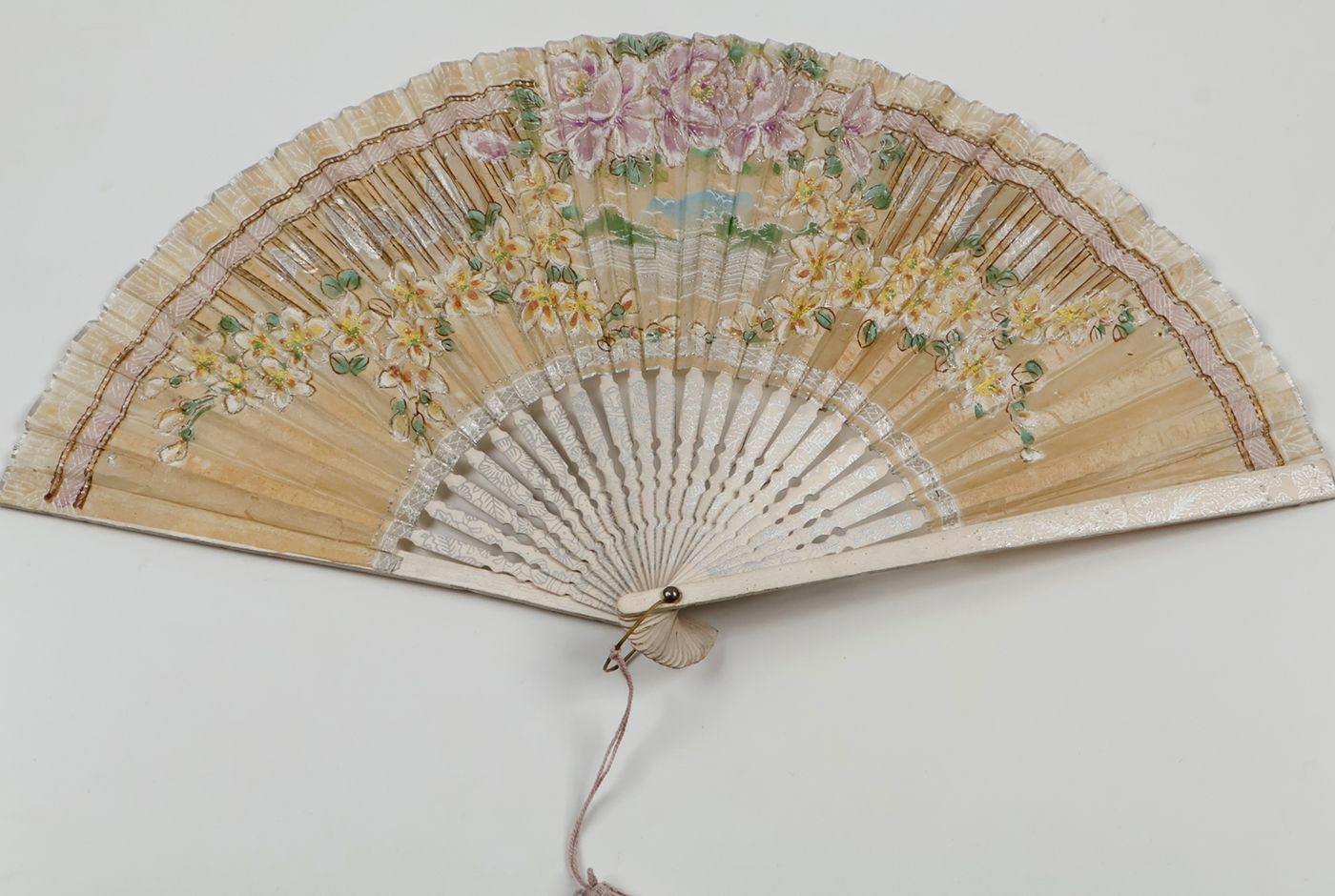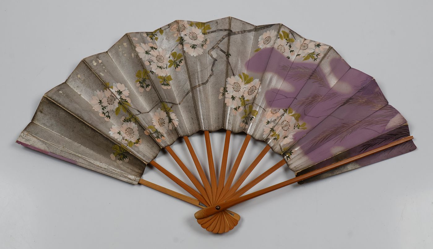 A wonderful collection of fans from America, Europe, and Asia. The first and second from the former Dutch East Indies, now Indonesia. Both with Dutch spelling (with oe instead of u), hence from before 1950. The third is from before 1977, but probably much older: "Designed by architect Frank Pierce Milburn, the Powhatan Hotel was built in 1911. It was located two blocks west of the White House on Pennsylvania Avenue, located on 18th Street between Pennsylvania Avenue and H Street. It, along with other hotels no longer in existence, was one of the better hotels in the city. It had an excellent view of the city from its roof deck which appears to have been popular. By the time buildings grew up around it obscuring its views, the Powhatan was dated. Ultimately, it was razed in 1977." (dckaleidoscope.wordpress website). The fourth was made in France for the upscale gem cutting firm Royat in Clermont-Ferrand, in the Auvergne region of central France. "The Royat gem-cutting workshop was founded in 1899 by Joseph Demarty, an engineer and mineralogist. In 1900, it became an industrial company: the Société Anonyme des Pierres Précieuses d’Auvergne (Auvergne Precious Stones Company). Demarty chose Royat, where wealthy individuals flocked from around the world to benefit from the spa treatments. The workshop prospered and opened branches in Cannes, Biarritz, and Paris. The Royat gem-cutting workshop offered jewellery and everyday objects in its stores, using precious stones such as amethyst and fluorite from Auvergne, opal, jade, and agate. The workshop was established on the site of two mills on the Tiretaine River and used waterwheels to power the red sandstone grinding wheels used to rough-cut the stones. The architect Jean Guillot (1889-1961), who designed several villas and apartment buildings in the city, constructed the new buildings in a rationalist style combining concrete, limestone, metal, and brick. They housed the workshops, offices, store, and the director's apartment. Since its closure in 2004, the stonecutting workshop has remained frozen in time: the machines and tools are preserved in the workshops and on the workbenches. The entire site was inventoried by the Henri-Lecoq Museum as part of the PASTEC (Scientific and Technical Heritage) mission launched by the Ministry of Culture." (Clermont-Ferrand website). The fifth fan, from China, or, possibly, Indonesia, with large Chinese populations, especially in large towns such as Jakarta, and Surabaya. The first with slight wear (narrow gap in one fold; otherwise, excellent; the second excellent. The third with short tears, and slight paper loss, here and there, otherwise very good. The fourth with the first rib partly split, ends of paper a bit frayed and chipped, otherwise very good. The fifth is arguably the best, both in terms of quality of the material and craftmanship, and in the state of preservation, with only some minor wear to the fold's edges. In all a remarkable, diverse collection.