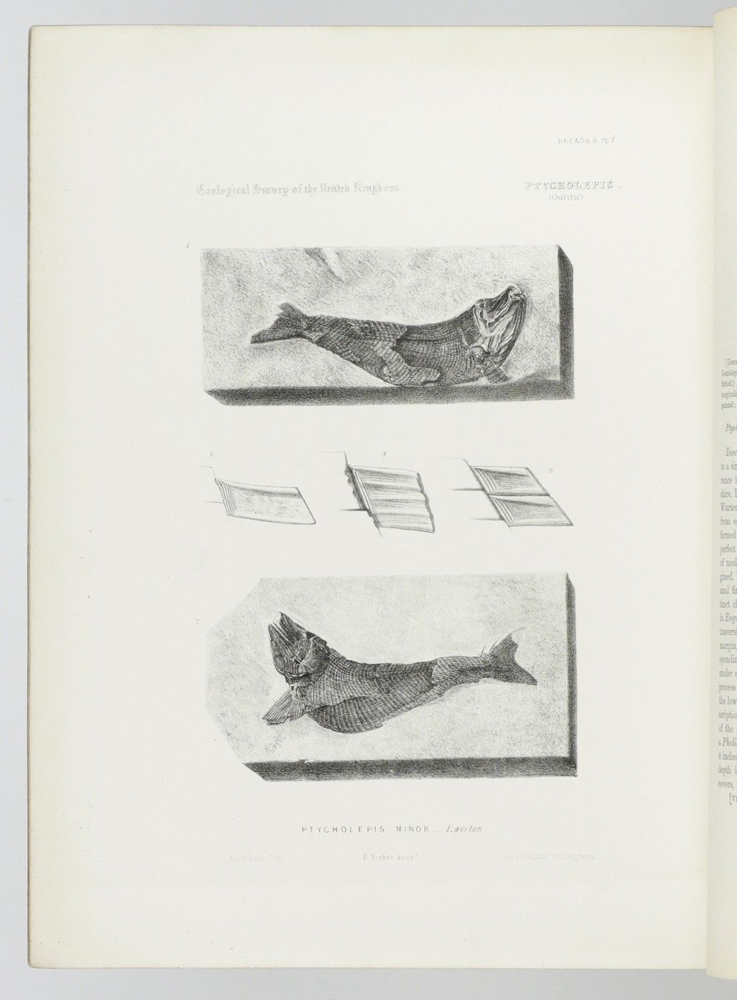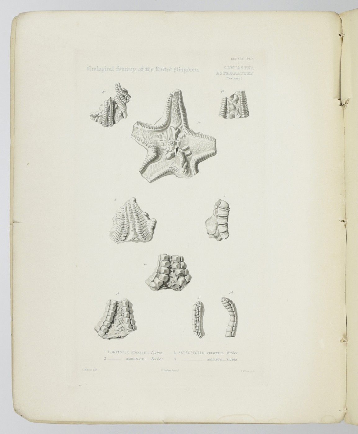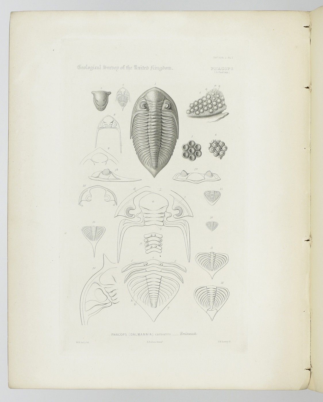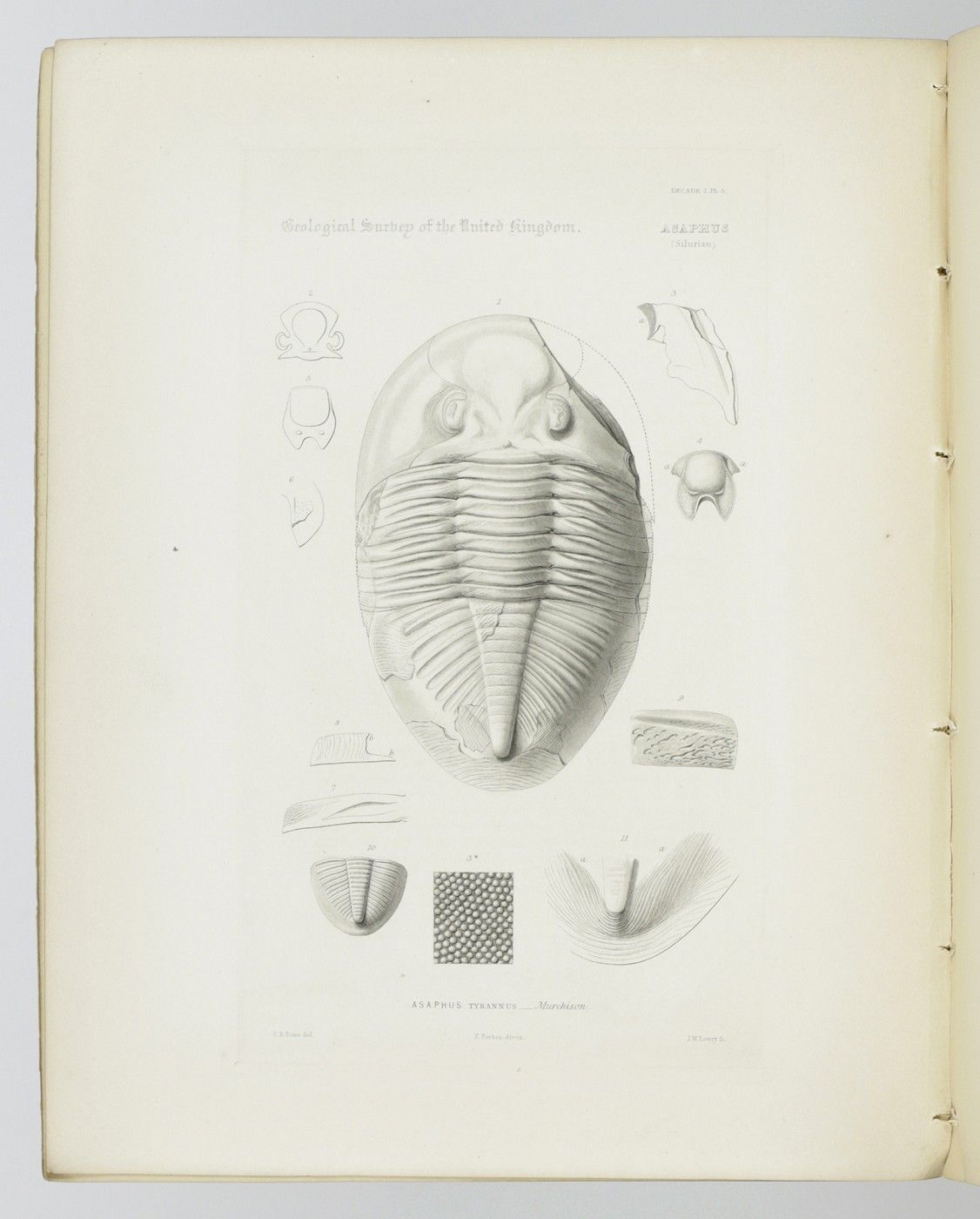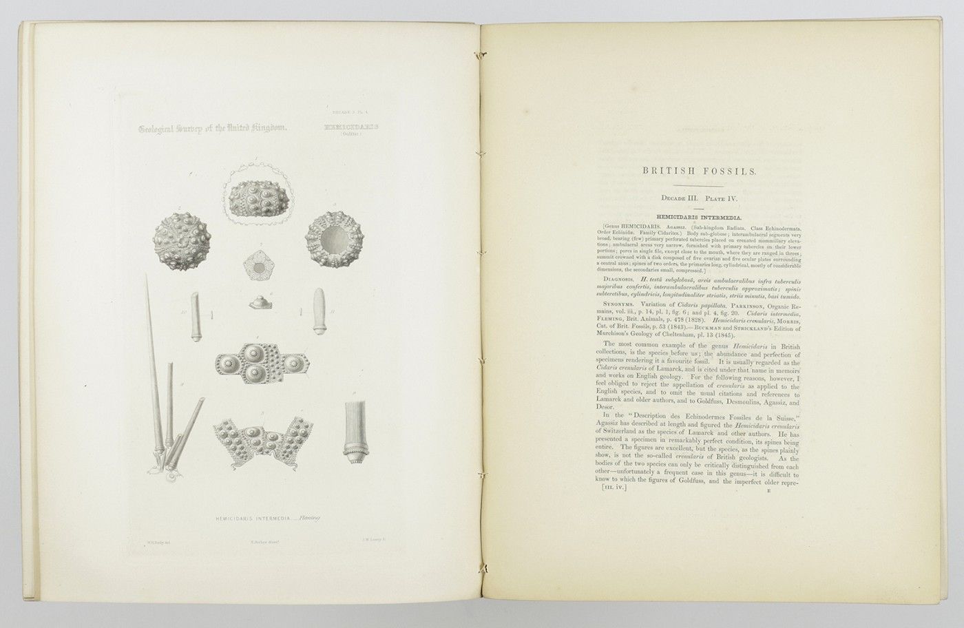 A rare, uninterrupted series, from the start. Mostly dealing with sea urchins, trilobites and fish. Well-illustrated. The work was published in issues, with new pagination to each plate. The number of pages for each plate varies between two and 12. The preface is by Henry de la Beche, the descriptions are nearly all by John William Salter (1820-1869), and include new species. The British naturalist and palaeontologist Edward Forbes (b. 1815) died in 1854. Cat. BM(NH) lists only the first five parts under his name. In total, 13 parts were issued up to 1866 - this is about two-thirds of the total published. Uncut. With very wide margins. We have seen copies in 8vo format, which are no match. Soiling to wrappers. Rear wrapper of part VIII, and front wrapper of part IX lacking, several wrappers detached, but otherwise a very good, unmarked set. Cat. BM(NH) Supplement, p. 334. Not in Ward and Carozzi.