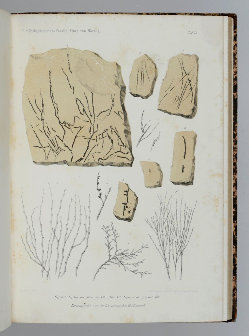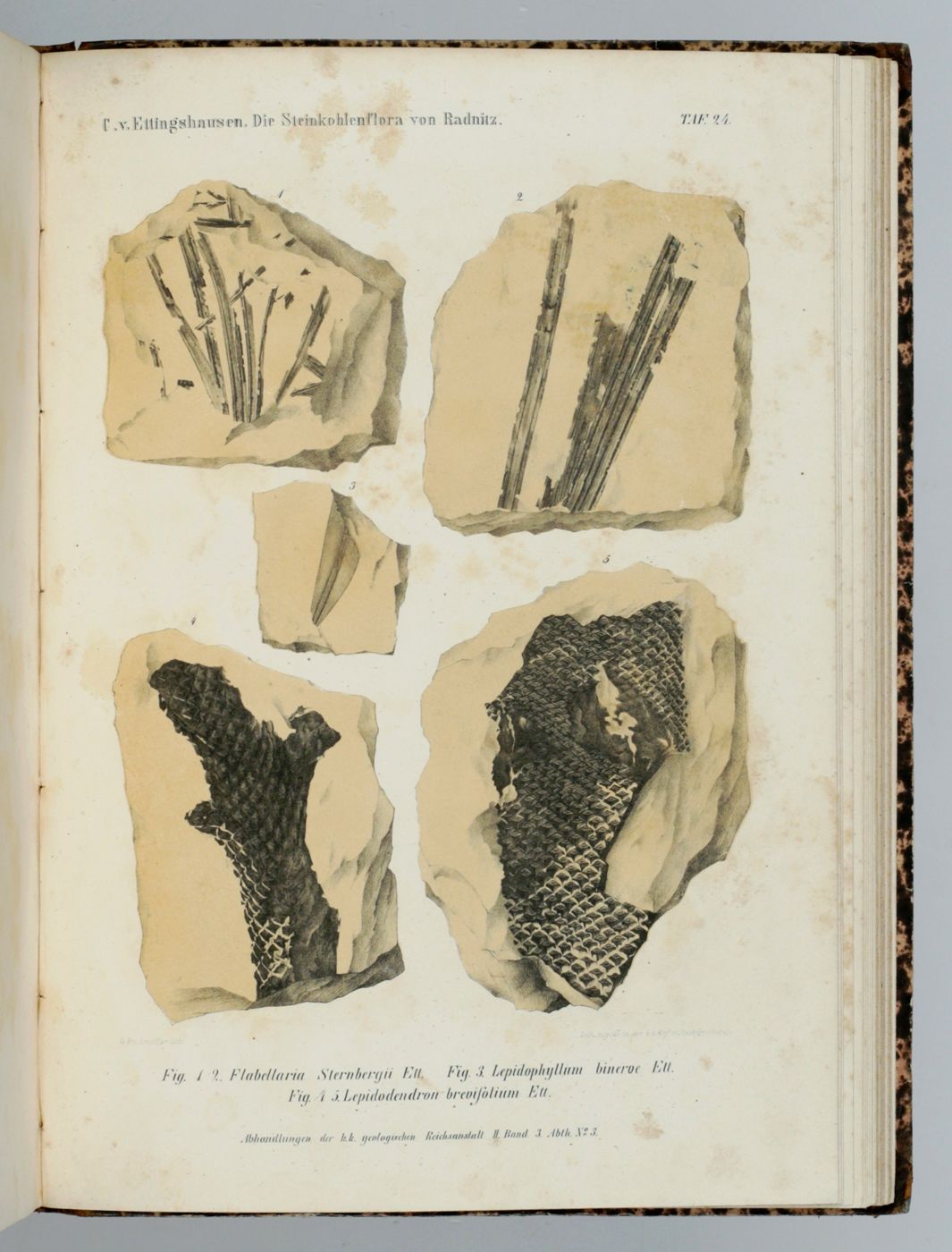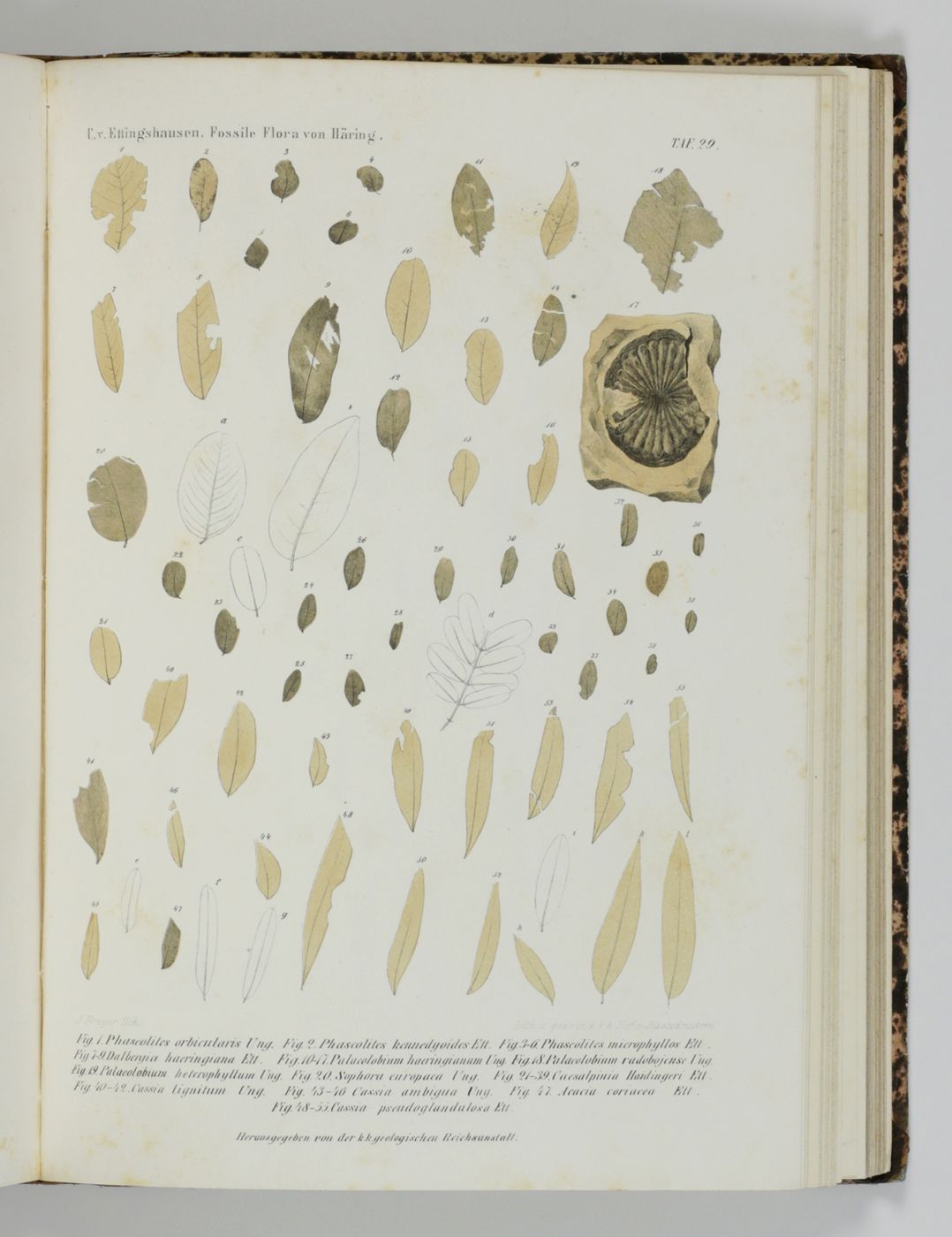 A rare series of monographs of the Tertiary floras of Austria, the first three by the eminent Austrian botanist Constantin Freiherrn von Ettingshausen (1826-1897), professor of botany at the university of Graz. The fourth is by the German palaeobotanist Karl (or Carl) Justus Andrae, or Andrä (1817-1885). These works include numerous new species, finely illustrated after usually well-preserved specimens. Published in the rare, early volumes of Anstalt's Abhandlungen. Library stamps on title and plate versos; a few shining through a little; water stain on the lower bottom part of the map and scattered, mostly light, foxing throughout. Cat. BM(NH) 2, p. 545. Neither in Nissen, BBI nor in Stafleu and Cowan.