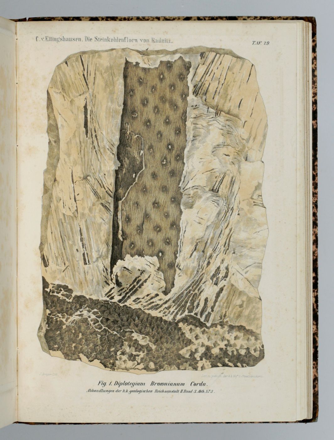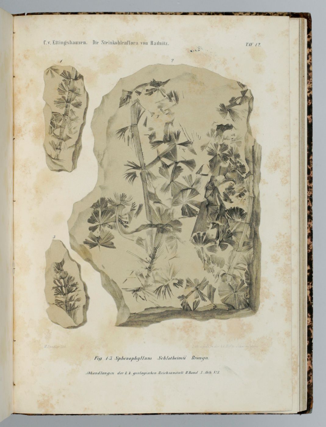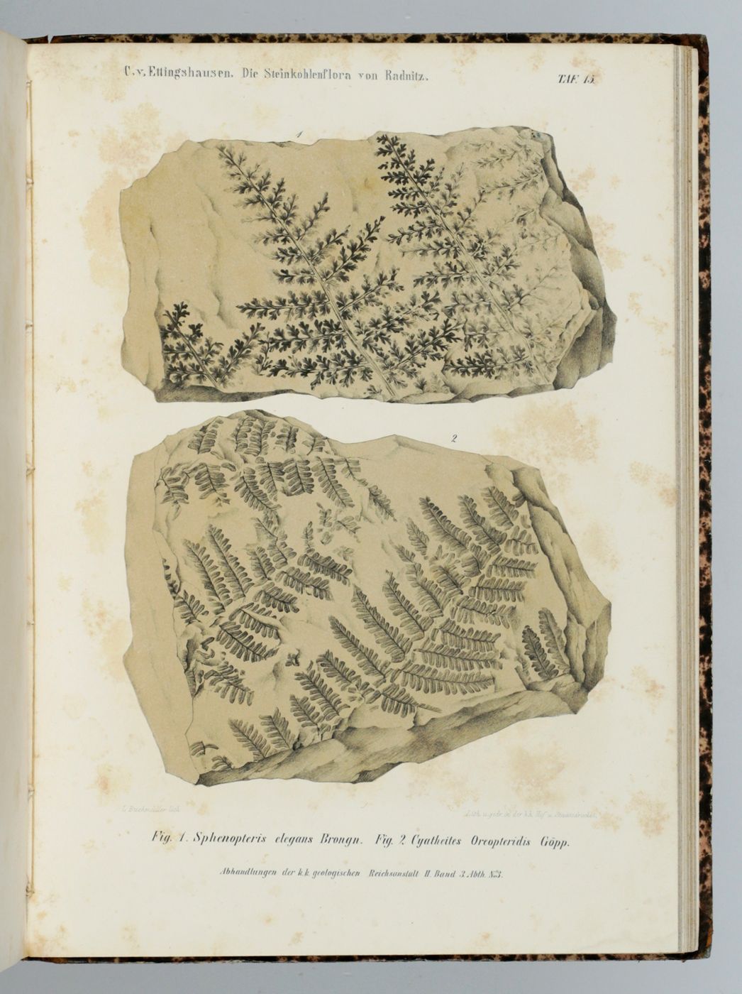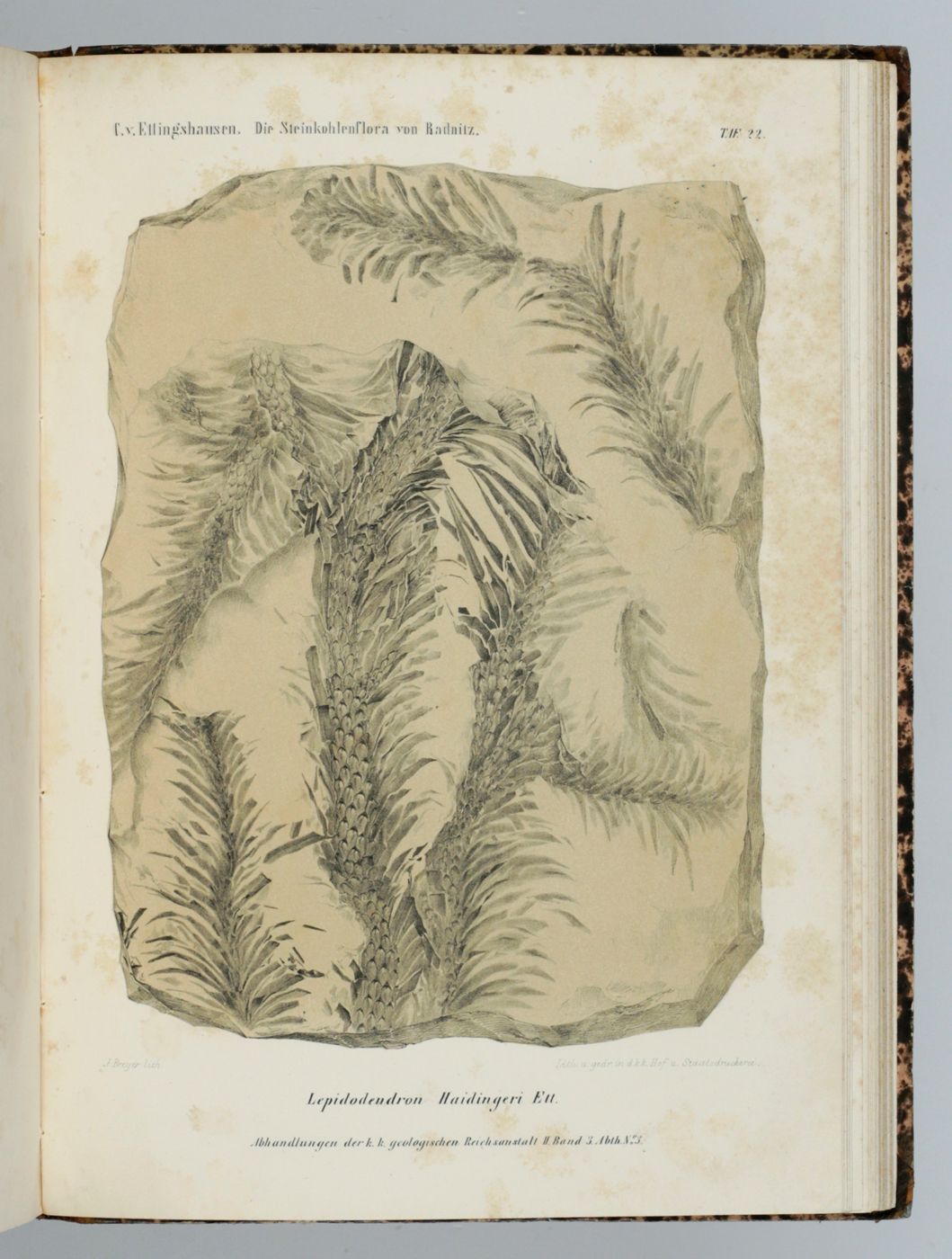 A rare series of monographs of the Tertiary floras of Austria, the first three by the eminent Austrian botanist Constantin Freiherrn von Ettingshausen (1826-1897), professor of botany at the university of Graz. The fourth is by the German palaeobotanist Karl (or Carl) Justus Andrae, or Andrä (1817-1885). These works include numerous new species, finely illustrated after usually well-preserved specimens. Published in the rare, early volumes of Anstalt's Abhandlungen. Library stamps on title and plate versos; a few shining through a little; water stain on the lower bottom part of the map and scattered, mostly light, foxing throughout. Cat. BM(NH) 2, p. 545. Neither in Nissen, BBI nor in Stafleu and Cowan.