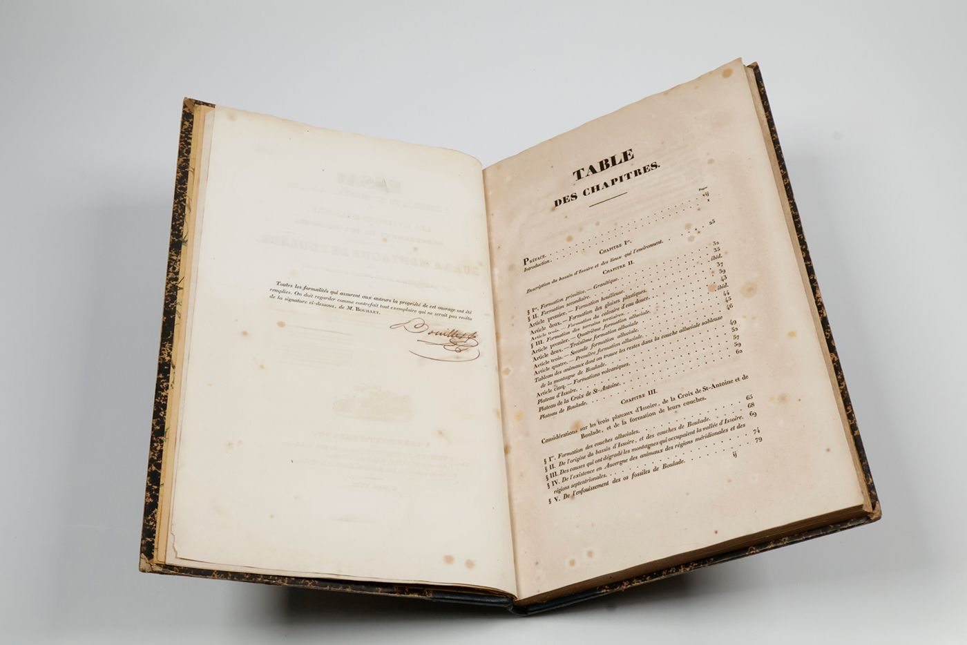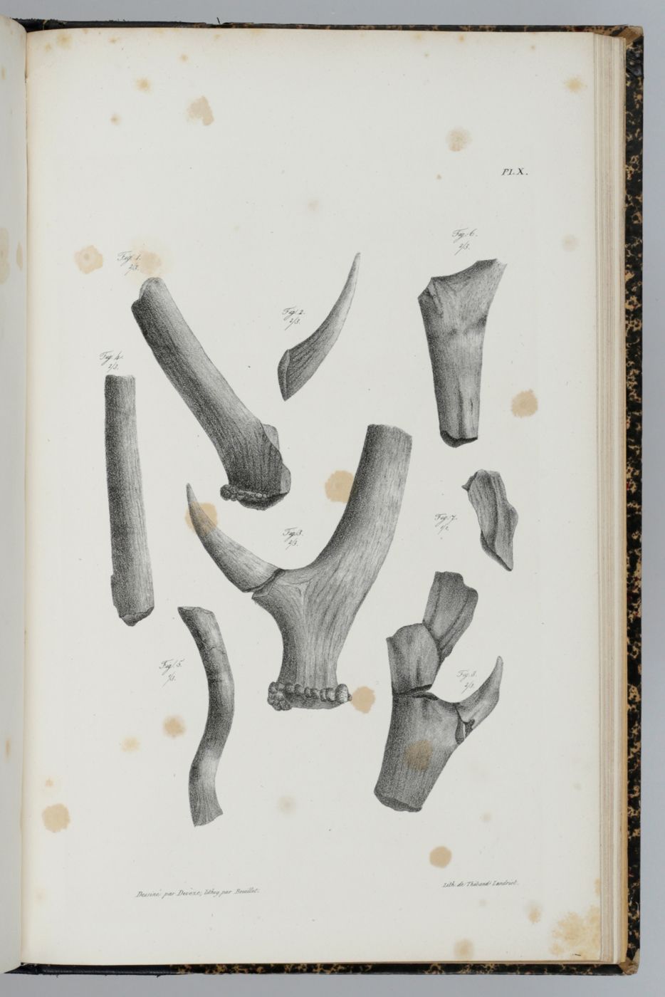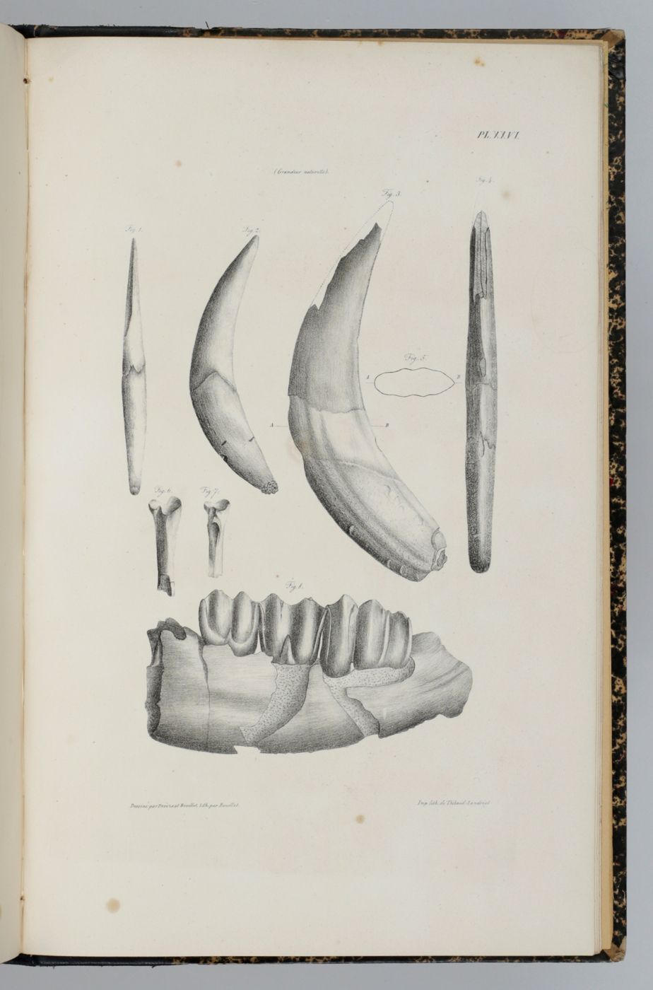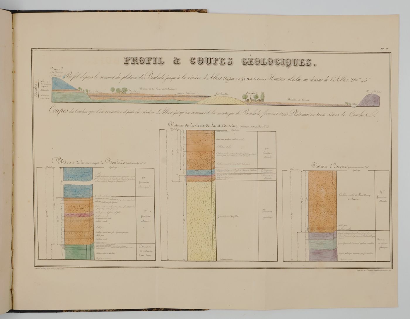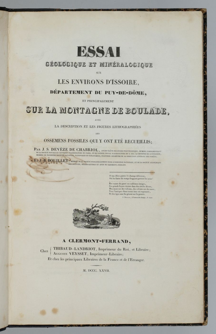 Rare early treatise on the geology and palaeontology, in particular the vertebrate palaeontology of this geologically very diverse region in central France, by the French engineer and geologist Jean Sébastien Devèze de Chabriol (1792-1842) and his compatriot, the geologist, palaeontologist, banker and museum curator Jean-Baptiste Bouillet (1799-1878). The map, with nine different colours, is titled Carte géologique du gîte des ossemens fossiles de Boulade près d'Issoire; the Profil et coupes géologiques has four sections including a detailed profile of the Plateau d'Issoire with the Montagne de Boulade and the towns of Boulade and Issoire. The plates depict antlers, bones and teeth, and include several deer species, rhinos, a Hippopotamus, big cats, etc. Small blind stamp in title page margin, spotting on most plates, and in some text sections, but generally in good condition. The last time we had a copy of this work (in a modern binding) was in 2001. Ward and Carozzi, 658. Not in Wood.