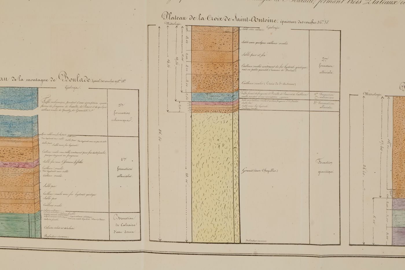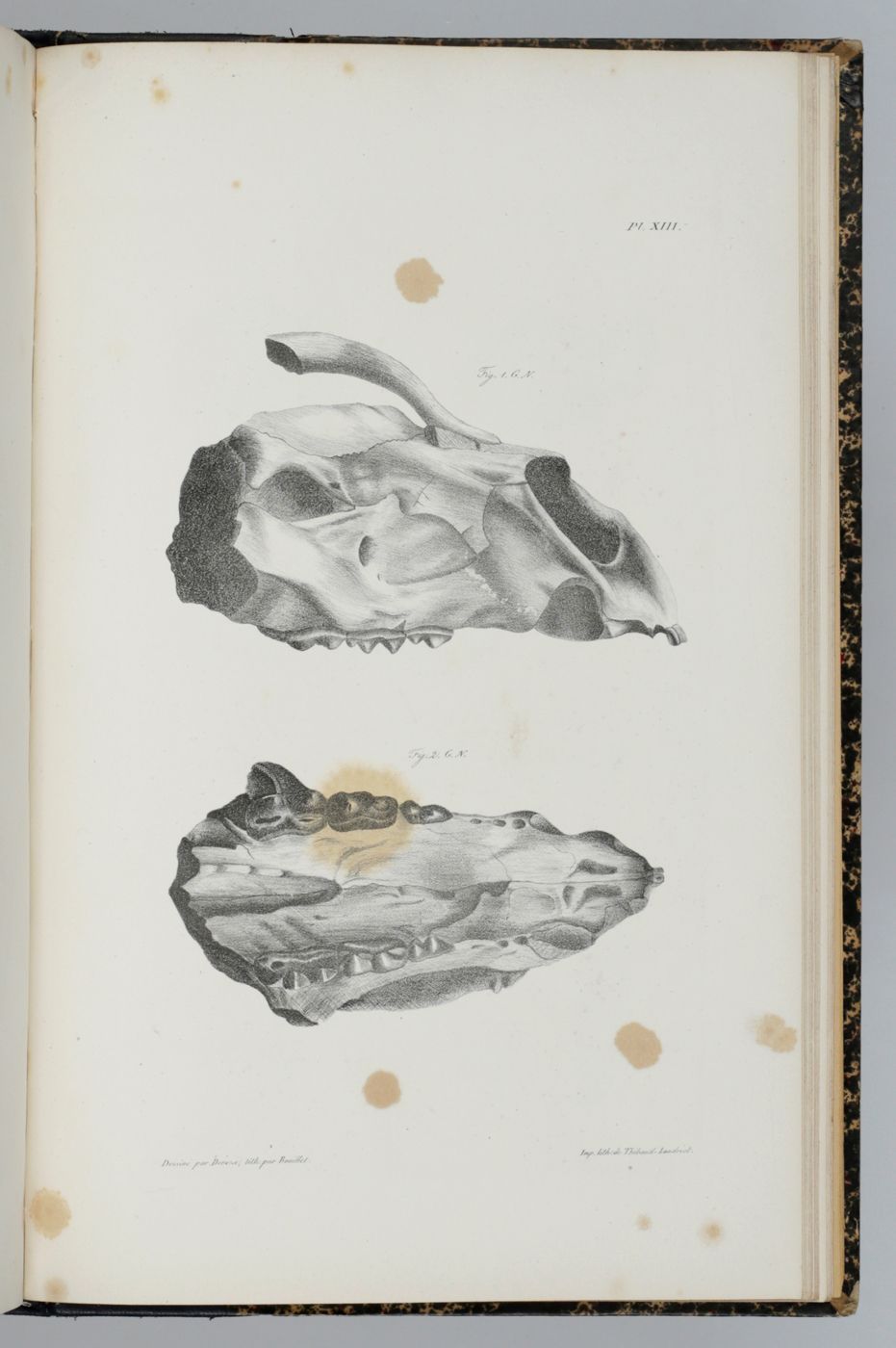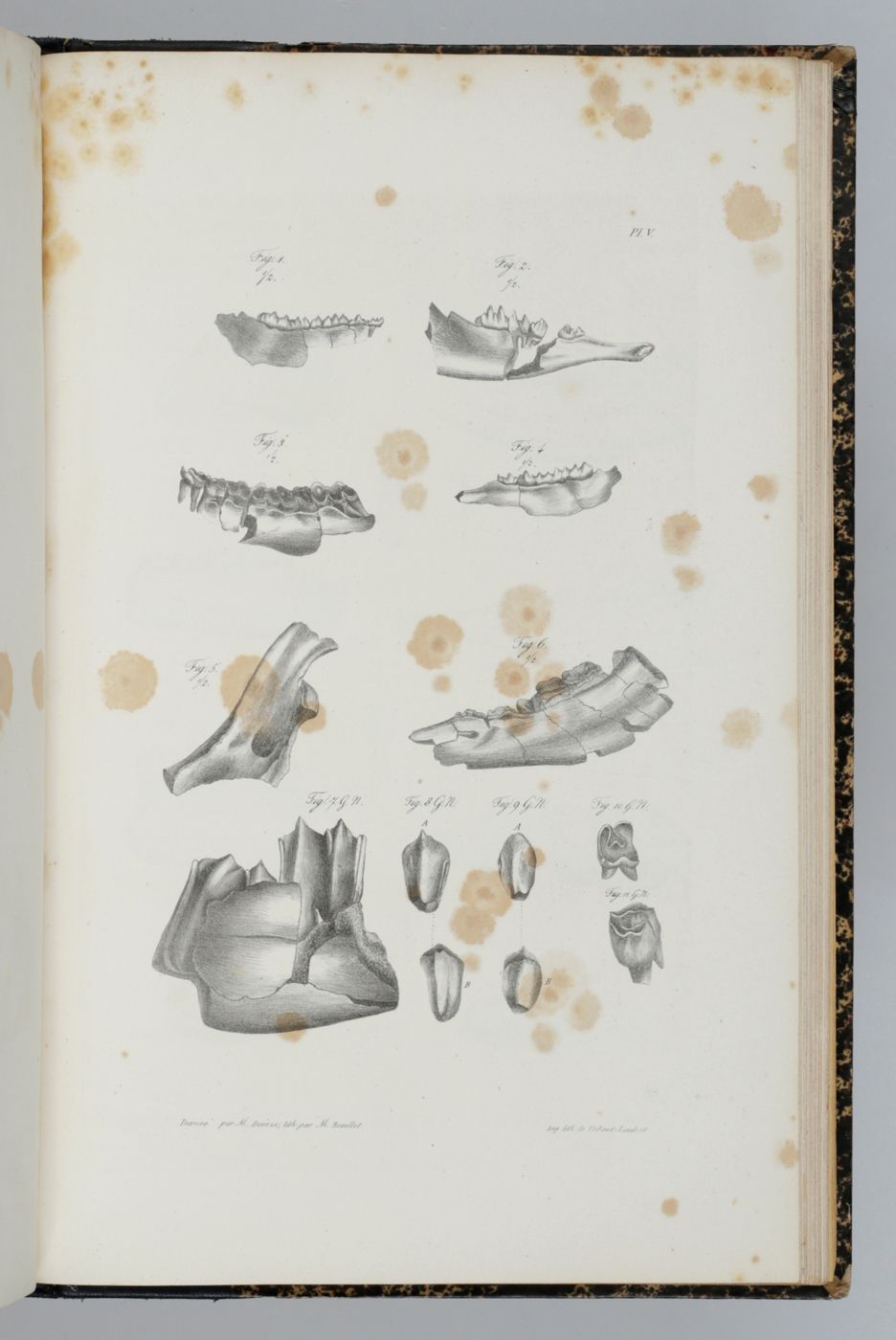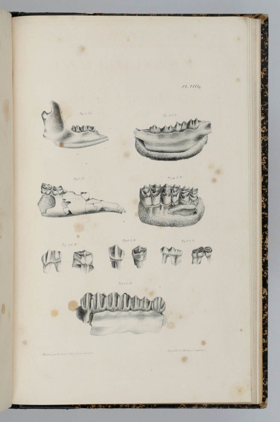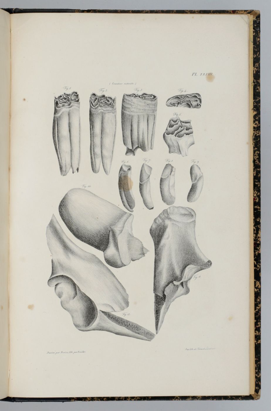 Rare early treatise on the geology and palaeontology, in particular the vertebrate palaeontology of this geologically very diverse region in central France, by the French engineer and geologist Jean Sébastien Devèze de Chabriol (1792-1842) and his compatriot, the geologist, palaeontologist, banker and museum curator Jean-Baptiste Bouillet (1799-1878). The map, with nine different colours, is titled Carte géologique du gîte des ossemens fossiles de Boulade près d'Issoire; the Profil et coupes géologiques has four sections including a detailed profile of the Plateau d'Issoire with the Montagne de Boulade and the towns of Boulade and Issoire. The plates depict antlers, bones and teeth, and include several deer species, rhinos, a Hippopotamus, big cats, etc. Small blind stamp in title page margin, spotting on most plates, and in some text sections, but generally in good condition. The last time we had a copy of this work (in a modern binding) was in 2001. Ward and Carozzi, 658. Not in Wood.