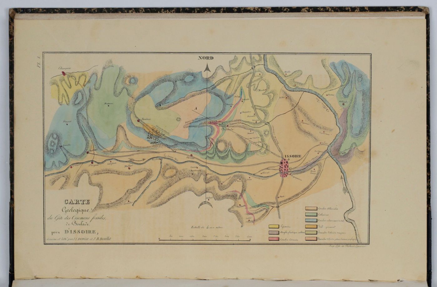 Clermont-Ferrand, Thibaud-Landriot, 1827. Folio (41.0 x 26.2 cm). xii, 104 pp.;hand-coloured lithographed geological map and hand-coloured profile, and 30 lithographed plates depicting vertebrates and several tables, including one very large, folded in the text. Contemporary half morocco over marbled boards. Spine with gilt lines and title. Marbled endpapers; speckled edges.