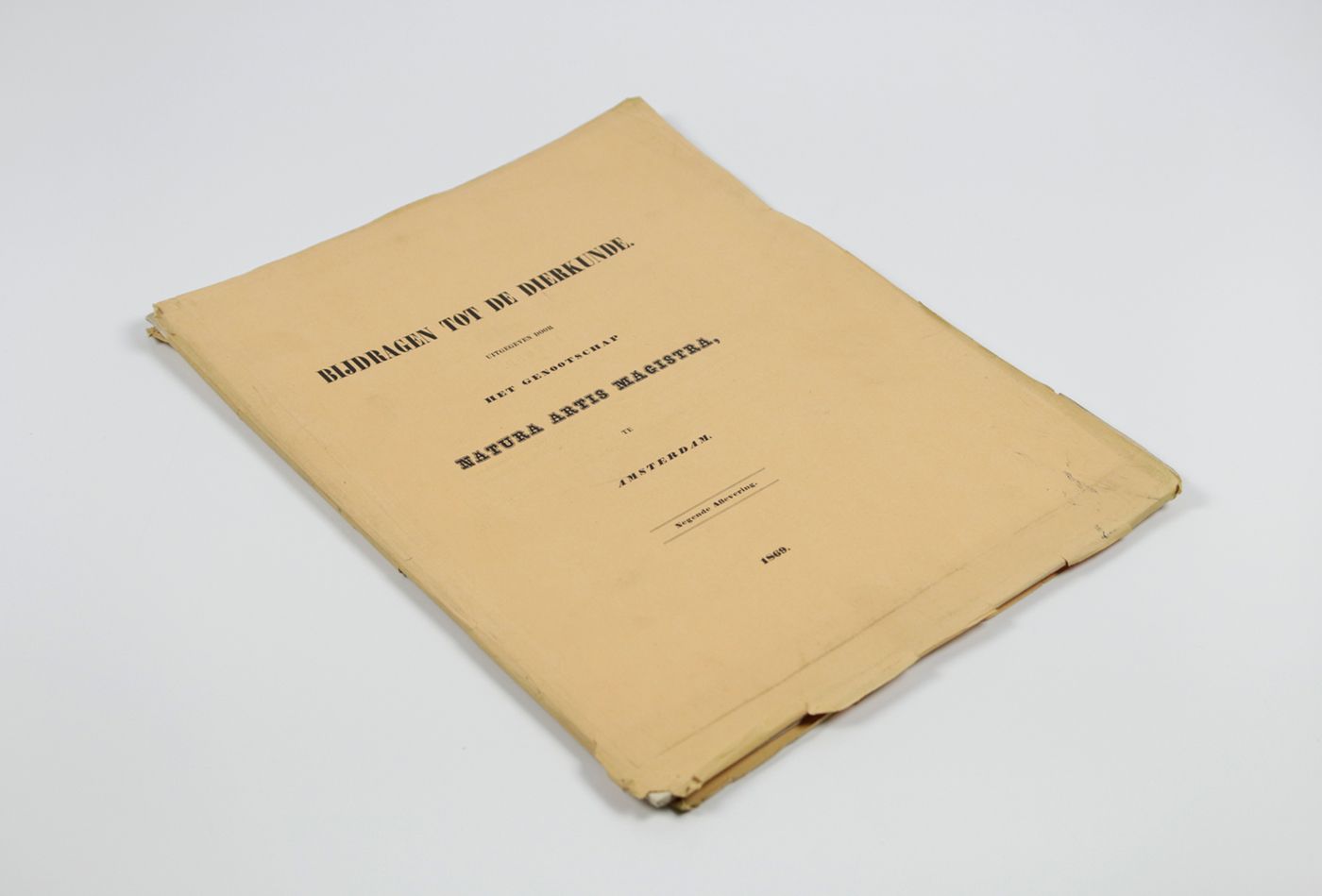 Amsterdam, Genootschap Natura Artis Magistra, 1869. Large 4to (36.0 x 27.5 cm). 12 pp.; ten lithographed plates, of which five with additional hand-colouring. Original printed wrappers.