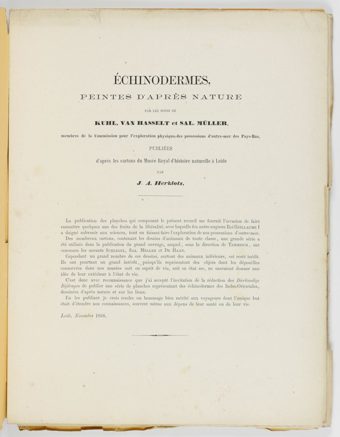 Echinodermes, peintes d'après nature par les soins de Kuhl, van Hasselt et Sal. Müller, membres de la Commission pour l'exploration physique des possessions d'outre-mer des Pays-Bas, publiées d'après les cartons du Musée Royal d'Histoire naturelle à Leide.