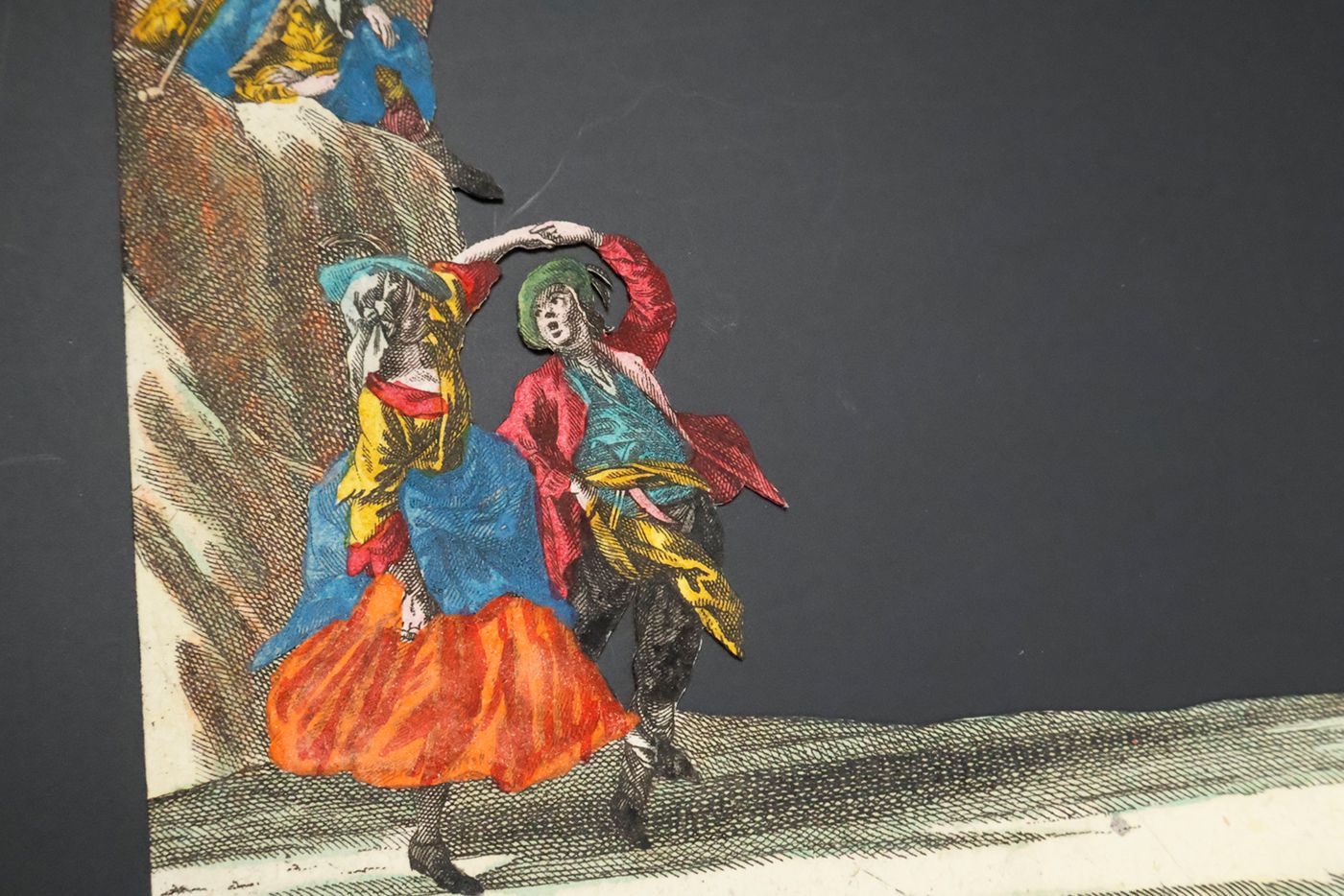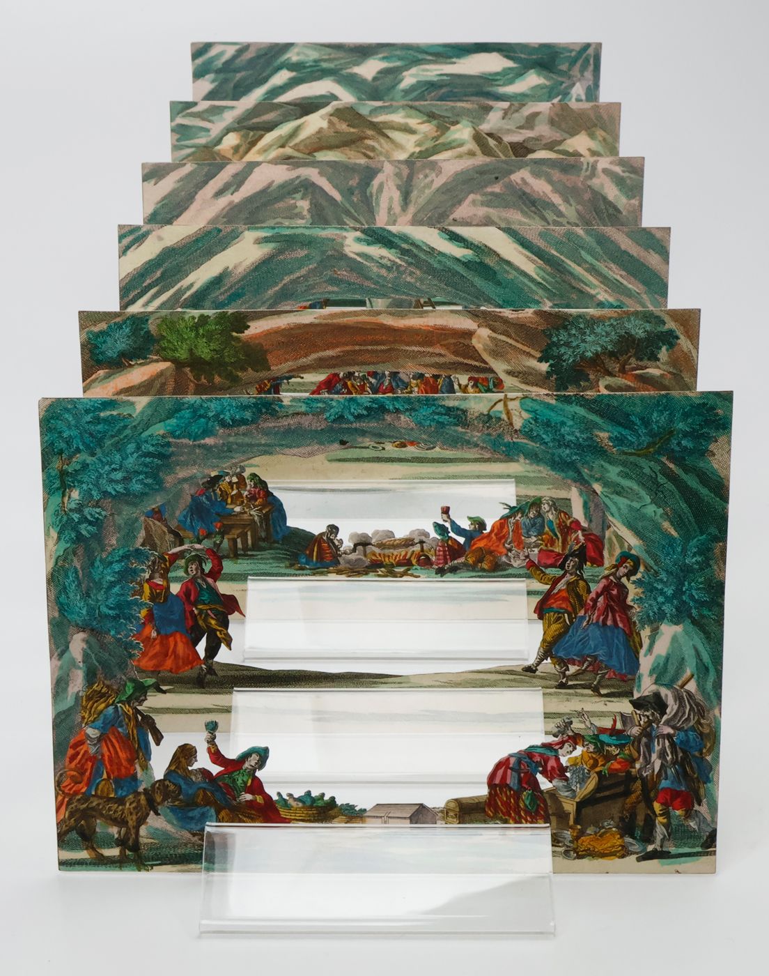 [Augsburg, M. Engelbrecht, [ca. 1750]. Six (of seven) large, oblong cardboard sheets (ca. 16.0 x 20.0 cm), with fine hand-colouring, being five cards with delicate cut-outs and one backpanel, together forming a single scene. Rear panel numbered, in print, N. 51 in the lower margin.