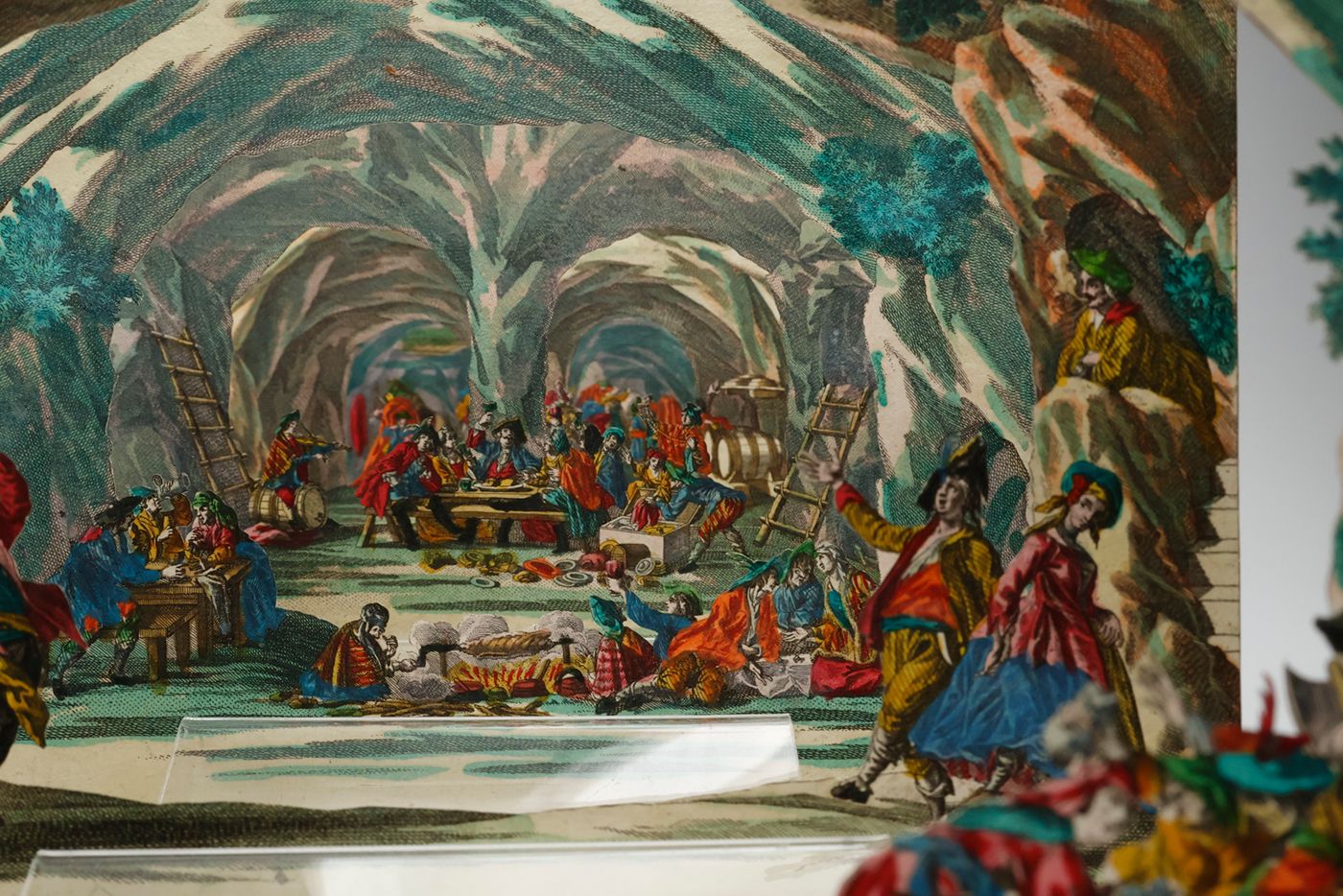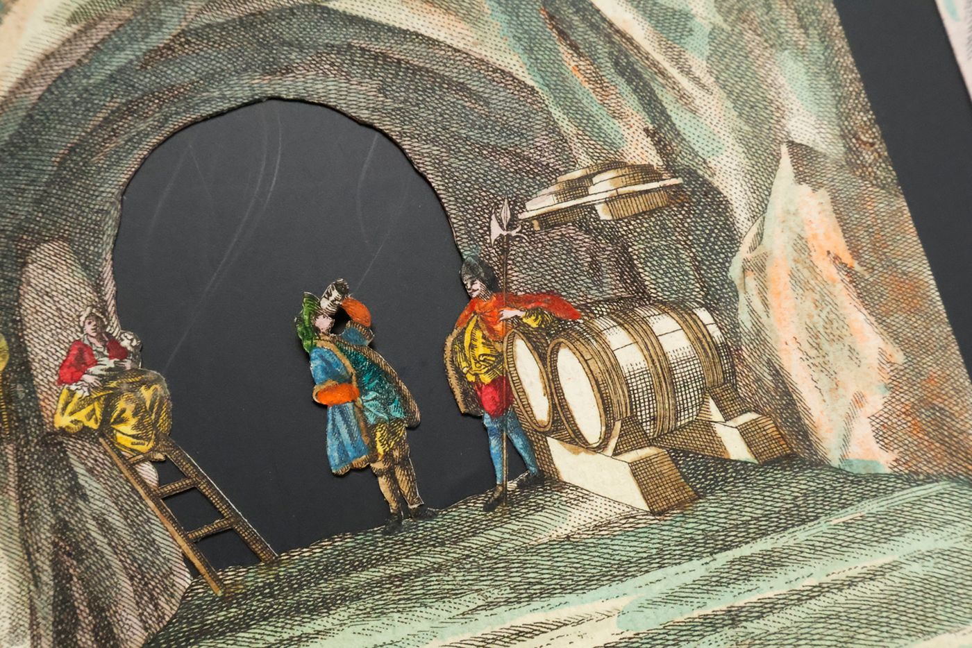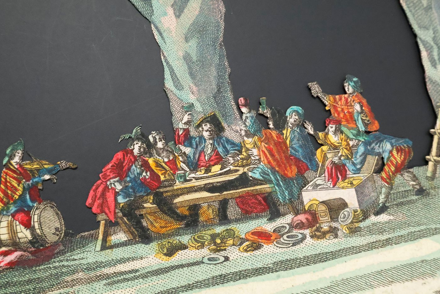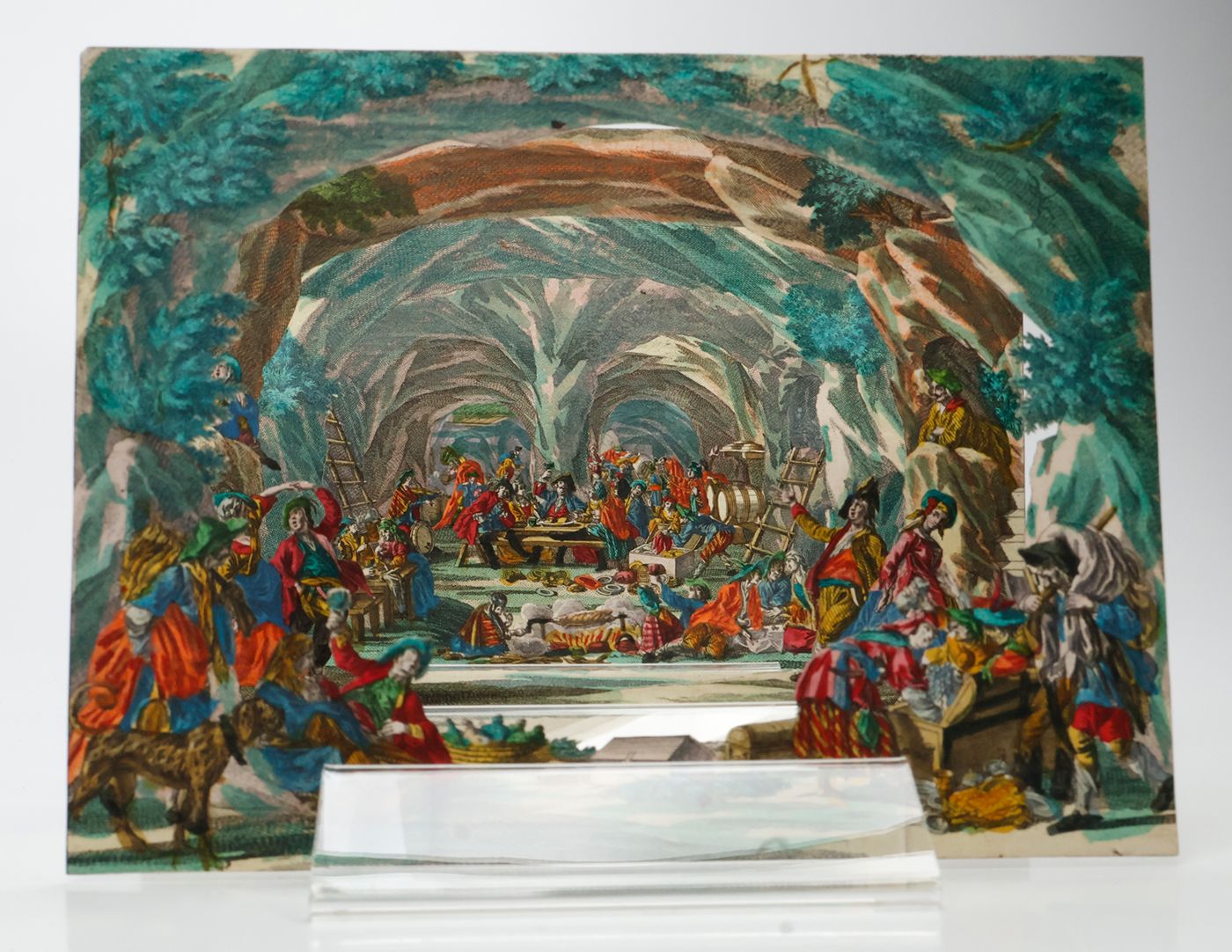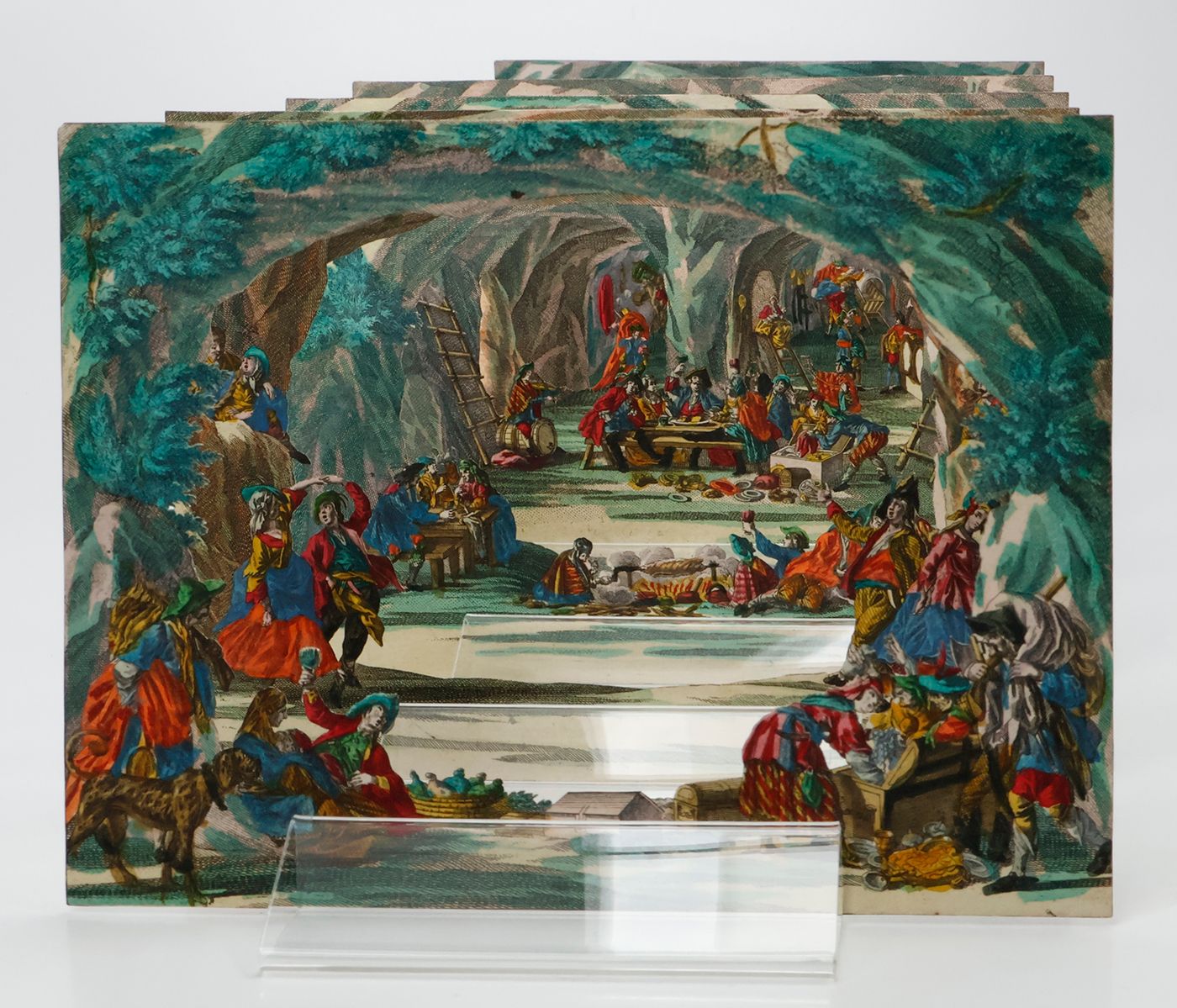 A rare view into a den of thieves, having a jolly good time. Given the age and subject, we assume that this item was produced by the Augsburg firm of M. Engelbrecht. "Martin Engelbrecht (1684-1756), a native of Augsburg was the son of a colour merchant. He began his career as an artist by the attachment to a local publishing house but had by 1708 moved to Berlin where he was engaged in the designs after Eosander von Goethe of the Silberbüfett im Ritterall at Berlin and of a porcelain cabinet in Charlottenberg. Returning to Augsburg he was involved in illustrating a wide variety of works after various artist mainly on subjects connected with the decorative arts. However in 1711 Engelbrecht was again in Berlin working at a fine art publishers with his older brother Christian Engelbrecht (1672-1735). They decided to start their own independent publishing house at Augsburg in 1719 where they produce a wide variety of graphic works. It was with peepshows Martin Engelbrecht excelled having the unique position of no other publishing house or place of publication to compete against him. Engelbrecht was kept busy with the many other special graphics and employed two artists, Jeremias Wachsmuth (1711-1771) and Johann David Nessenthaler (1717-1766), to produce designs for the peepshows. Wachsmuth’s work can be found as early as 1731, and those by Nessenthaler starting from 1737. With Martin Engelbrecht's death in 1756 the business continued to thrive under the management of Engelbrecht's daughters and sons-in-law, and continued on well into the nineteenth century." (Marlborough Rare Books Catalogue, List XLV, 2009. pp. 33-34). First cardboard (which is the least detailed, and, e.g., without human figures) lacking. Interestingly, the six remaining cards are numbered 1-6 on the versos, in quite an old, perhaps contemporary hand. In very good condition.