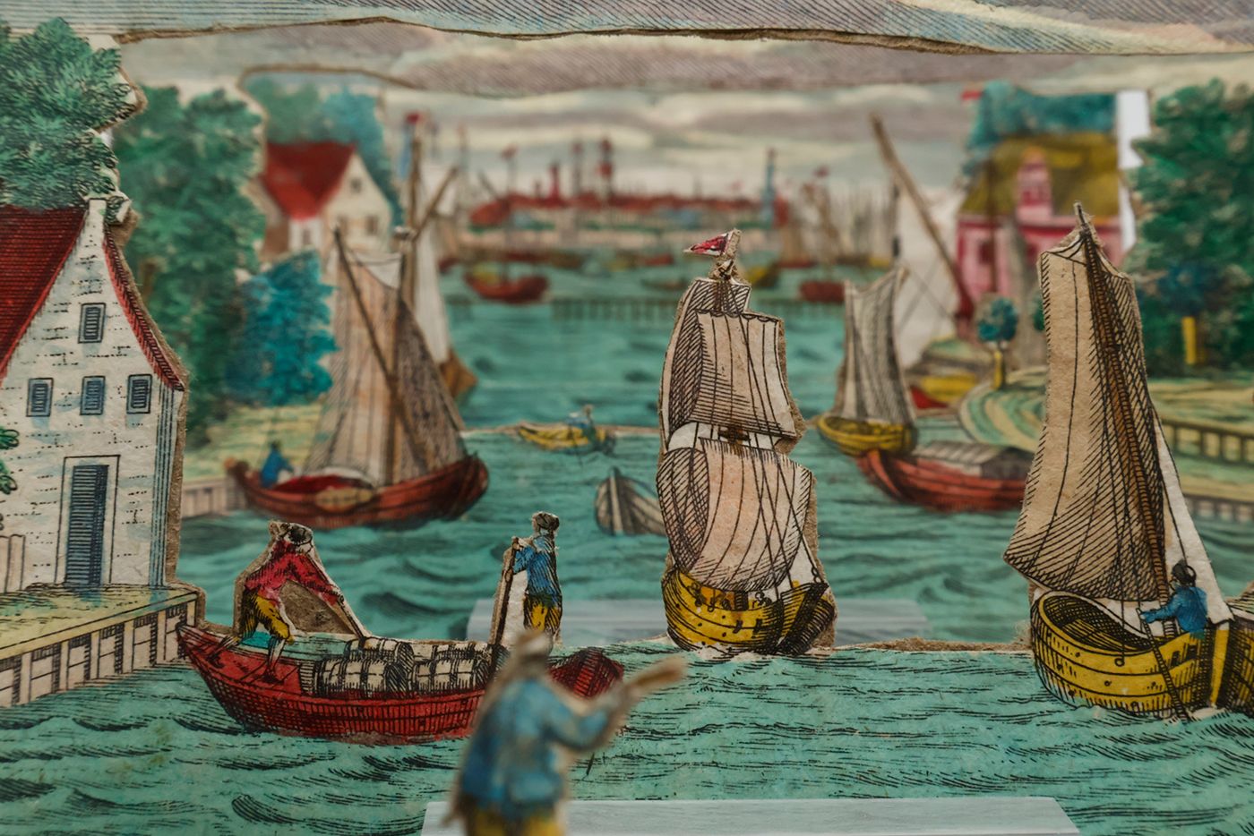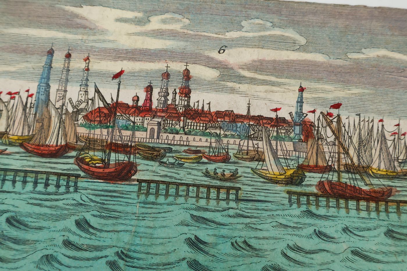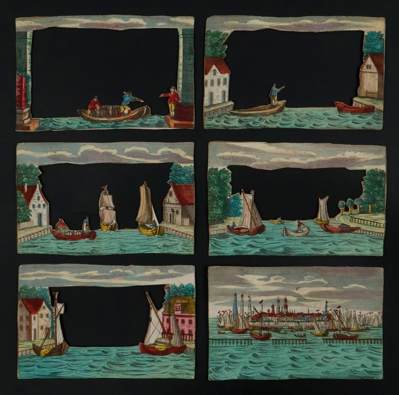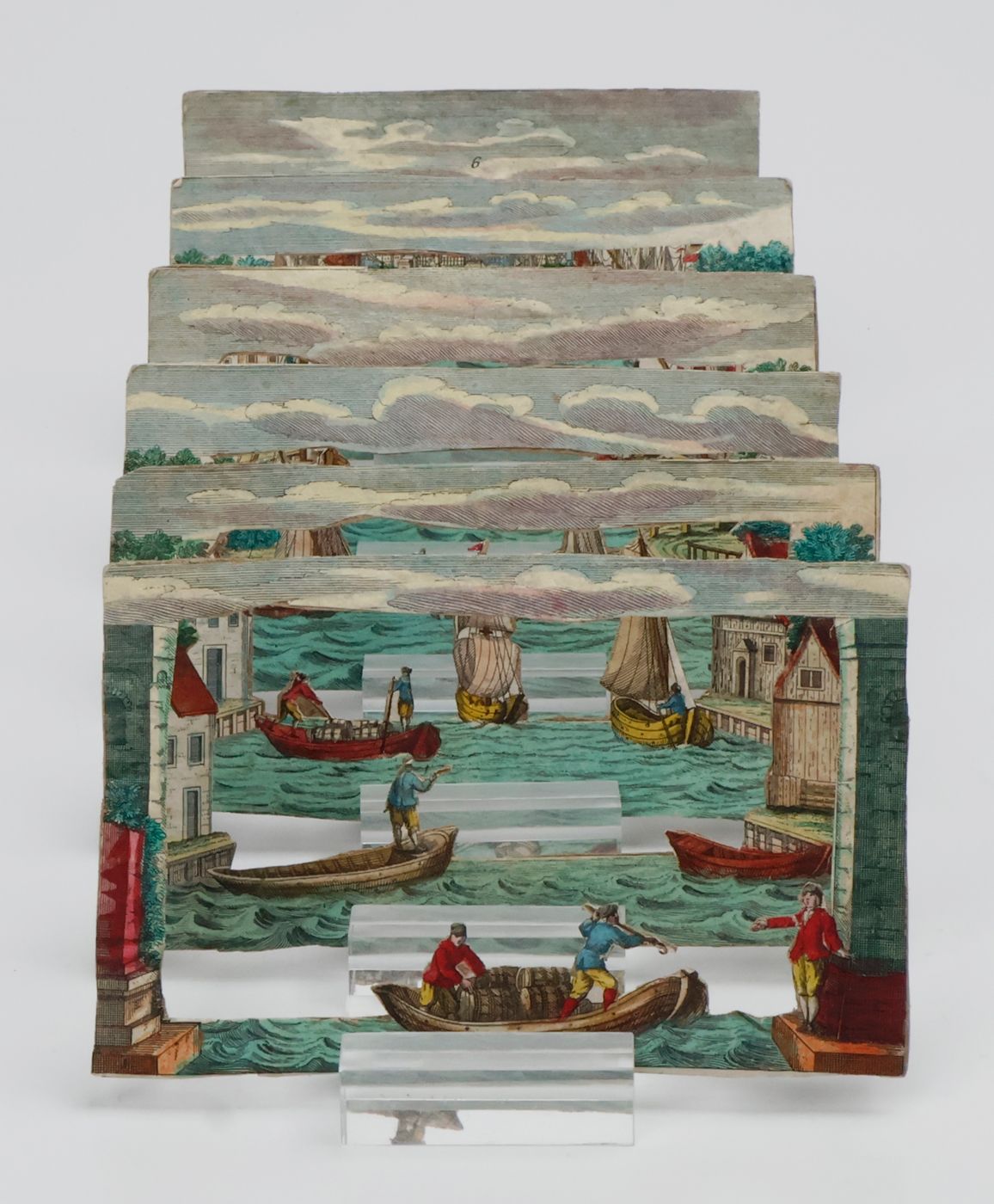 A wonderfully preserved, complete set of cards, with delicate cut-outs and hand-colouring. This peepshow consists of six cards which together form a view through a busy shipping river or canal, towards a fortified port, possibly Hamburg. Produced by the Augsburg firm of M. Engelbrecht. "Martin Engelbrecht (1684-1756), a native of Augsburg was the son of a colour merchant. He began his career as an artist by the attachment to a local publishing house but had by 1708 moved to Berlin where he was engaged in the designs after Eosander von Goethe of a the Silberbüfett im Ritterall at Berlin and of a porcelain cabinet in Charlottenberg. Returning to Augsburg he was involved in illustrating a wide variety of works after various artist mainly on subjects connected with the decorative arts. However in 1711 Engelbrecht was again in Berlin working at a fine art publishers with his older brother Christian Engelbrecht (1672-1735). They decided to start their own independent publishing house at Augsburg in 1719 where they produce a wide variety of graphic works. It was with peepshows Martin Engelbrecht excelled having the unique position of no other publishing house or place of publication to compete against him. Engelbrecht was kept busy with the many other special graphics and employed two artists, Jeremias Wachsmuth (1711-1771) and Johann David Nessenthaler (1717-1766), to produce designs for the peepshows. Wachsmuth’s work can be found as early as 1731, and those by Nessenthaler starting from 1737. With Martin Engelbrecht's death in 1756 the business continued to thrive under the management of Engelbrecht's daughters and sons-in-law, and continued on well into the nineteenth century." (Marlborough Rare Books Catalog, List XLV, 2009. pp. 33-34). The quality is certainly of the highest level. Numbered on versos in an old hand. Very slight rubbing to the edges, otherwise very good, clean. Rare.