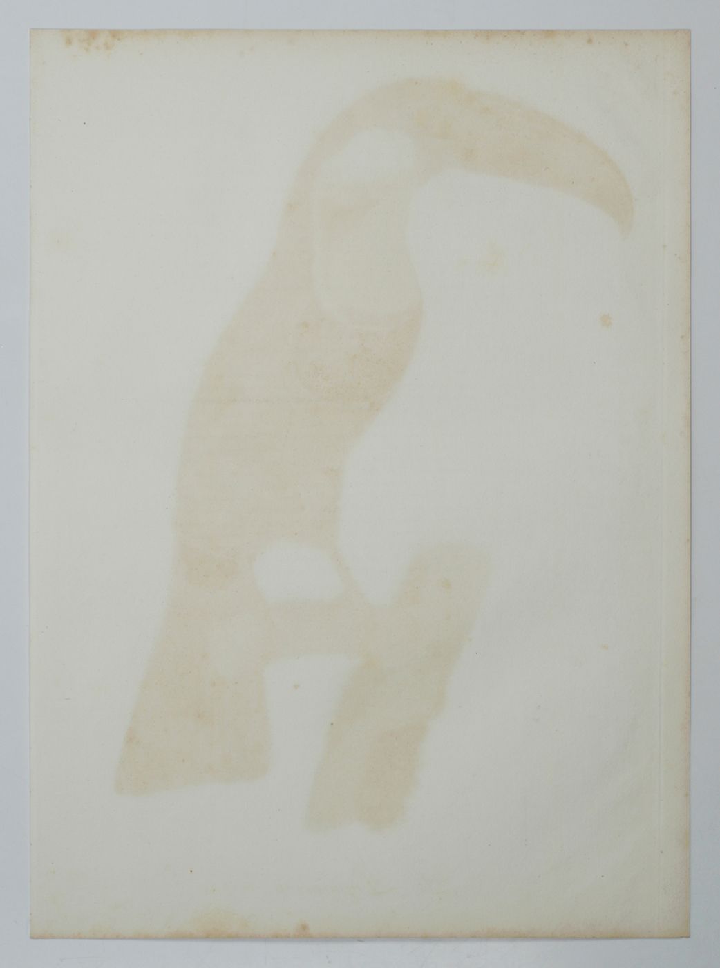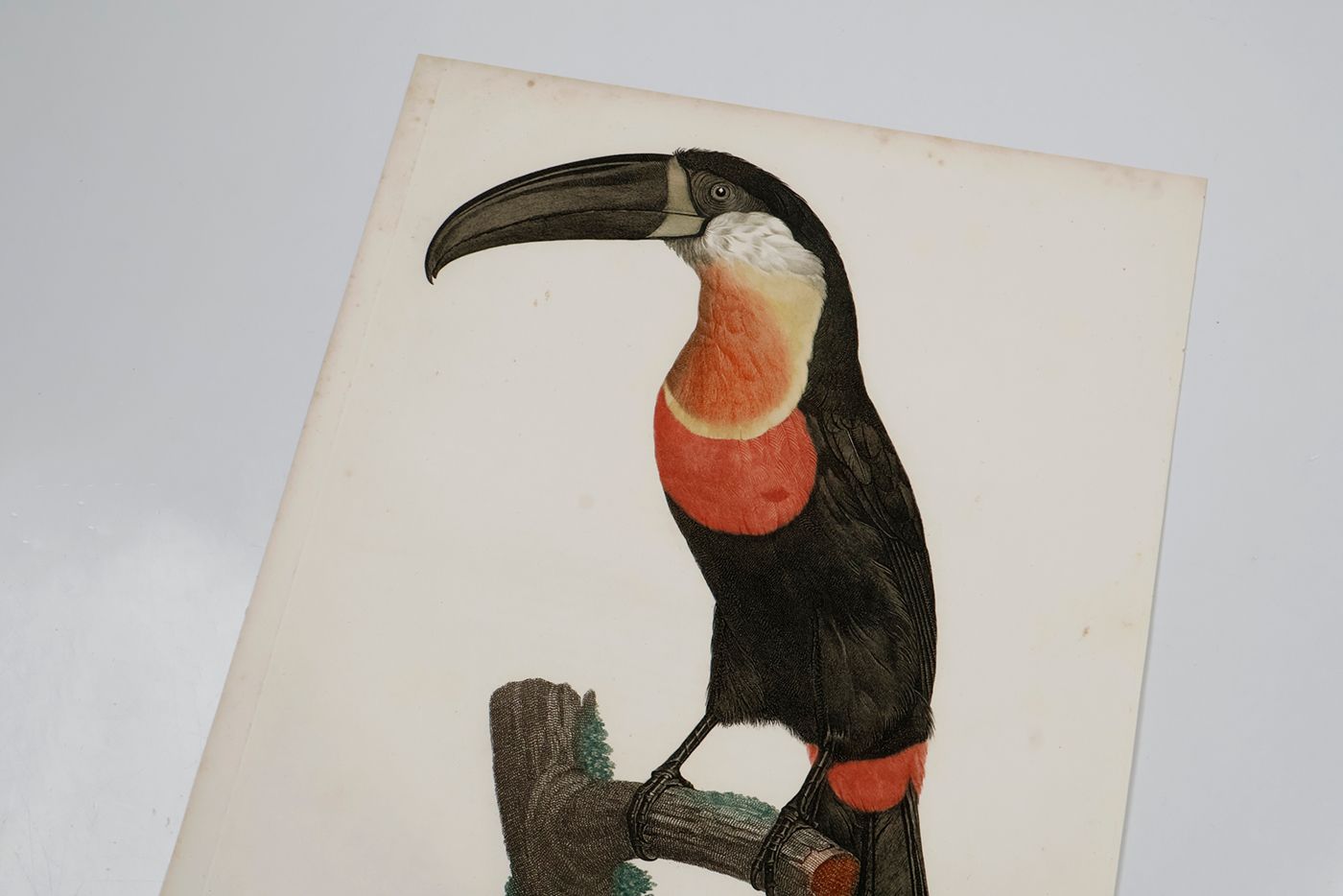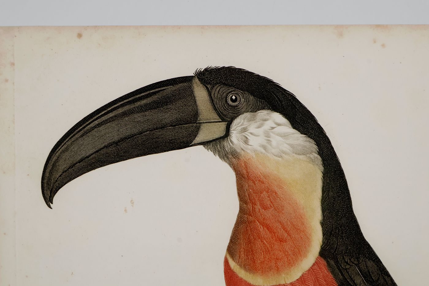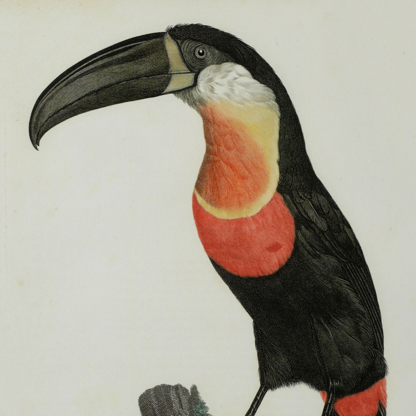 A fine, copper-engraved plate, in very good condition, of one of the world's most spectacular birds, the channel-billed Toucan. This original plate is the work of one of the period’s foremost bird illustrators, the French artist Jacques Barraband (1767-1809). Barraband's works are esteemed especially for their realism. Although his illustrations were based on mounted specimens, they were considered the most accurate made during the early 1800s. His birds are never stiff, nor are they artistic rather than accurate, as in, for example, the work of Audubon. The channel-billed Toucan from Neotropical rain-forests occurs from Trinidad south to Brazil and Colombia. Known by ornithologists as Ramphastos vitellinus, this specimen has a feather colour pattern resembling the Ariel Toucan, sometimes regarded as a separate species. Originally published in a work by the French explorer and ornithologist François Levaillant (1753-1824), Histoire Naturelle des Oiseaux de Paradis et des Rolliers, suivie de Celle des Toucans et des Barbus. Levaillant's book is known to be prone to foxing, but this plate forms a rare exception, with only some very minor spotting in the outer margins, otherwise, excellent, clean, the colours lively and bright. Anker, 304; Nissen IVB, 559; Ronsil, p. 298; Sitwell, p. 118; Zimmer, p. 393.