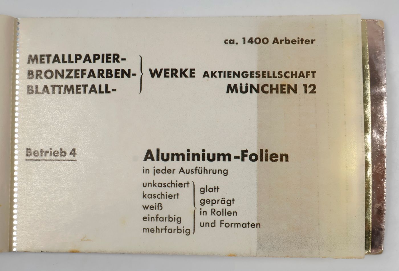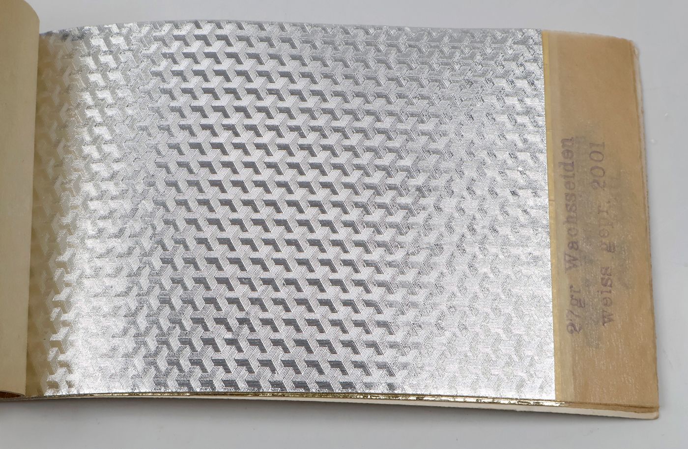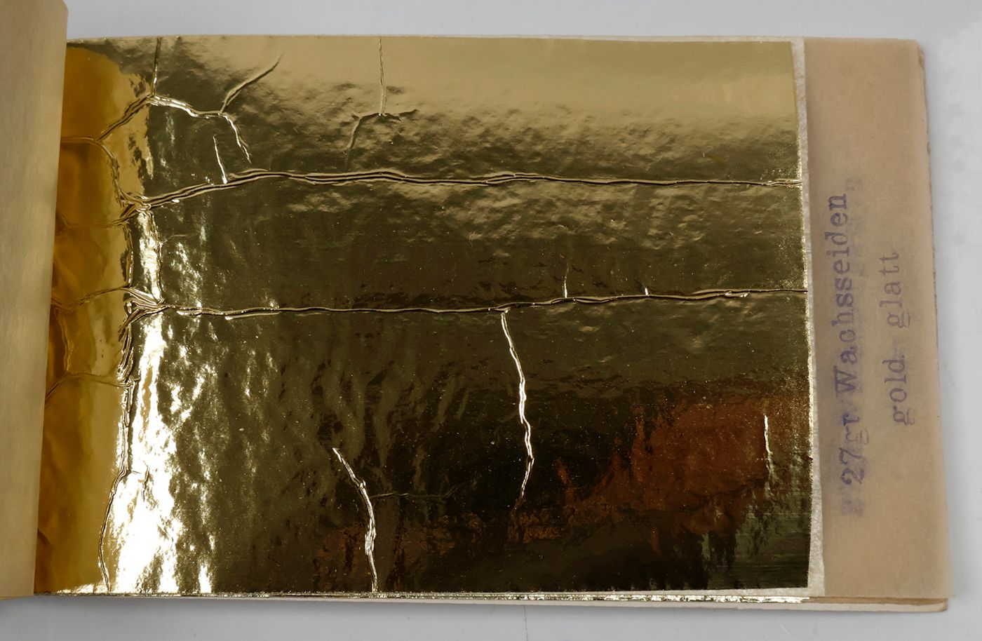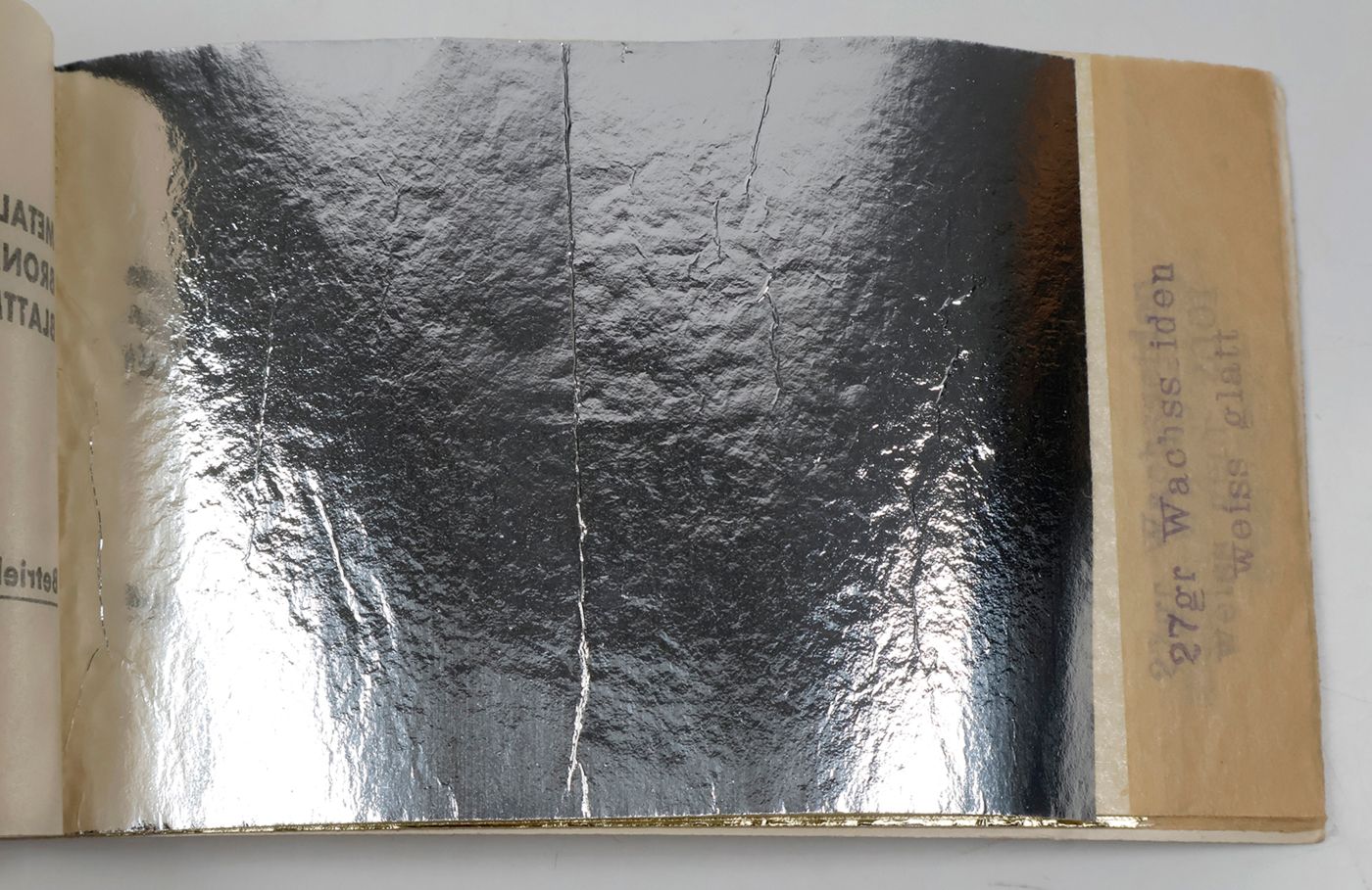 Munich, Metallpapier- Bronzefarben- Blattmetallwerke Aktiengesellschaft München, 1938. Three oblong booklets (8.0 x 14.6 cm; 9.1 x 16.4 cm, and 9.9 x 14.0 cm). Each with a title leaf and in total 39 aluminium foil leaves, each either in silver or gold, one with a different embossing, with brand names and logos (10), the others plain or geometrical patterns (29), and with tissue guards/interleaves with a catalogue numbers. All three stapled, with gilt, embossed covers, two with similar leaf-patterns, the other with a peculiar "fossil" pattern.