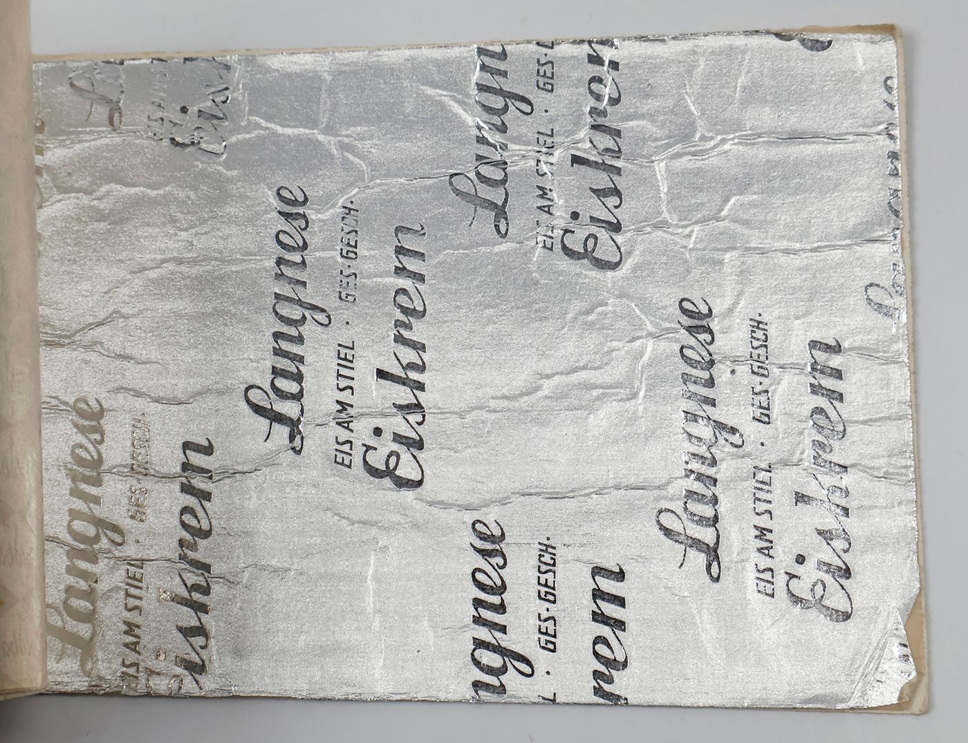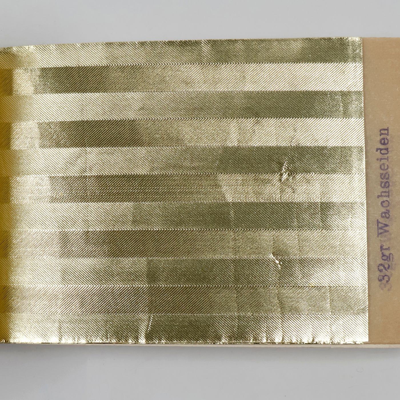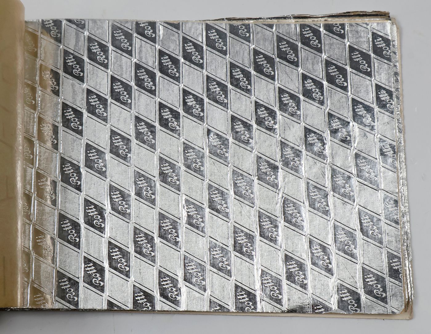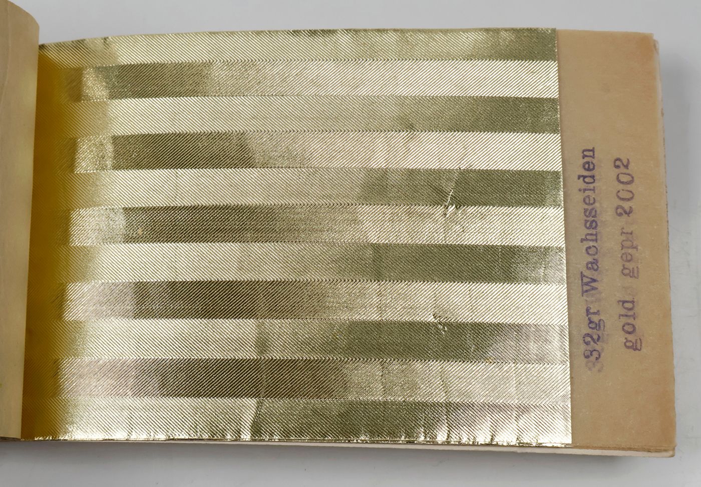 Munich, Metallpapier- Bronzefarben- Blattmetallwerke Aktiengesellschaft München, 1938. Three oblong booklets (8.0 x 14.6 cm; 9.1 x 16.4 cm, and 9.9 x 14.0 cm). Each with a title leaf and in total 39 aluminium foil leaves, each either in silver or gold, one with a different embossing, with brand names and logos (10), the others plain or geometrical patterns (29), and with tissue guards/interleaves with a catalogue numbers. All three stapled, with gilt, embossed covers, two with similar leaf-patterns, the other with a peculiar "fossil" pattern.