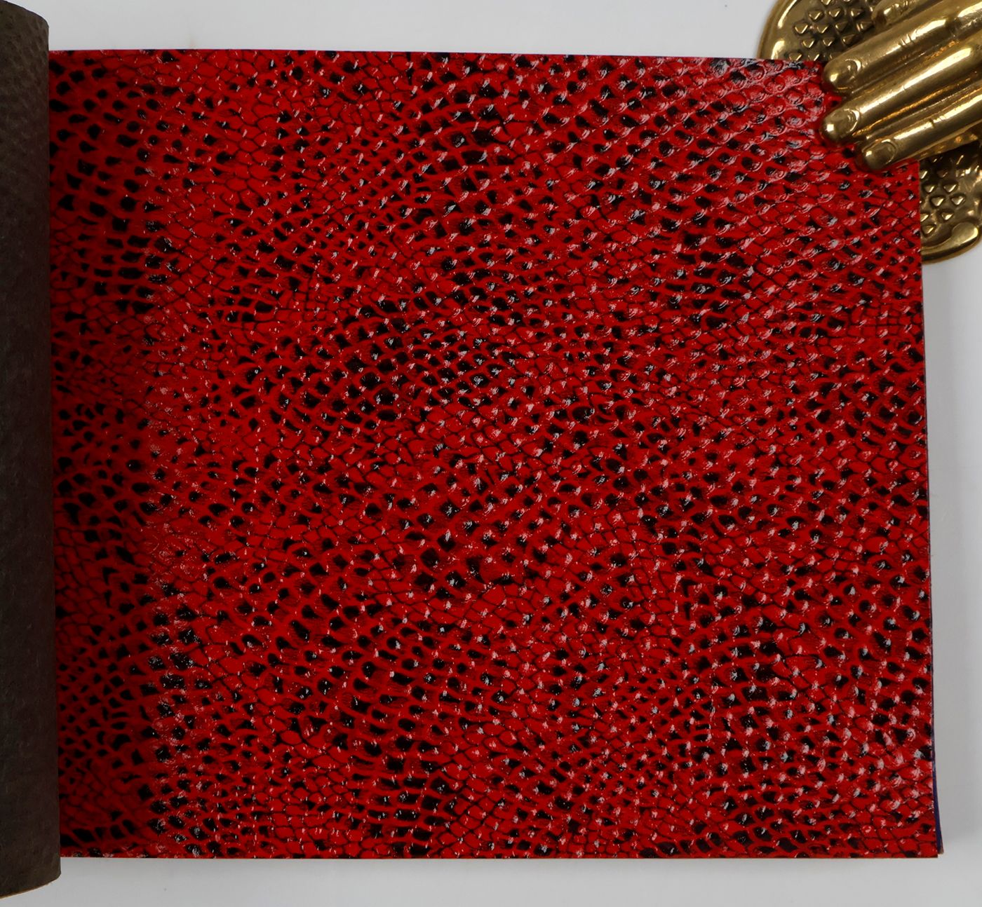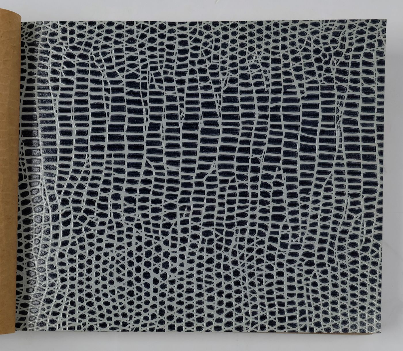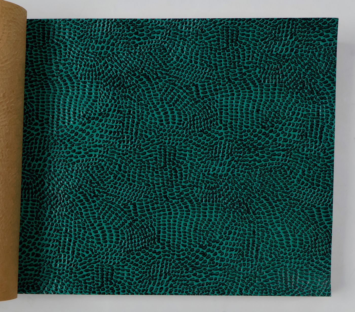 An unusual catalogue, of "Exclusive Designs", containing glossy paper samples (designs for wallpaper, book covers, etc.) chiefly showing reptile-skin patterns, brick-wall and pebbled patterns, and several other embossed patterns, in a variety of colours. The firm, Bénard, produced Gaufres, Indiennes, Micaces, Brocarts, Ors, en Rames ou en Bobines. Suédine, Velours, Cellodermes" [waffle fabrics, Indian prints, mica fabrics, brocades, gold fabrics, in rolls or spools. Suede, velvet, celloderm], this catalogue showing celloderm paper. Individual samples are printed in colour, monochrome, or gold. It is interesting to see the effect of different colours on the same graphic design. The samples are individually numbered (stamps on versos; numbers in a rather random order). Included: a cyclostat price list on yellow paper, recording size, minimal number of copies, etc., with some additions by hand. A very good, unmarked copy.